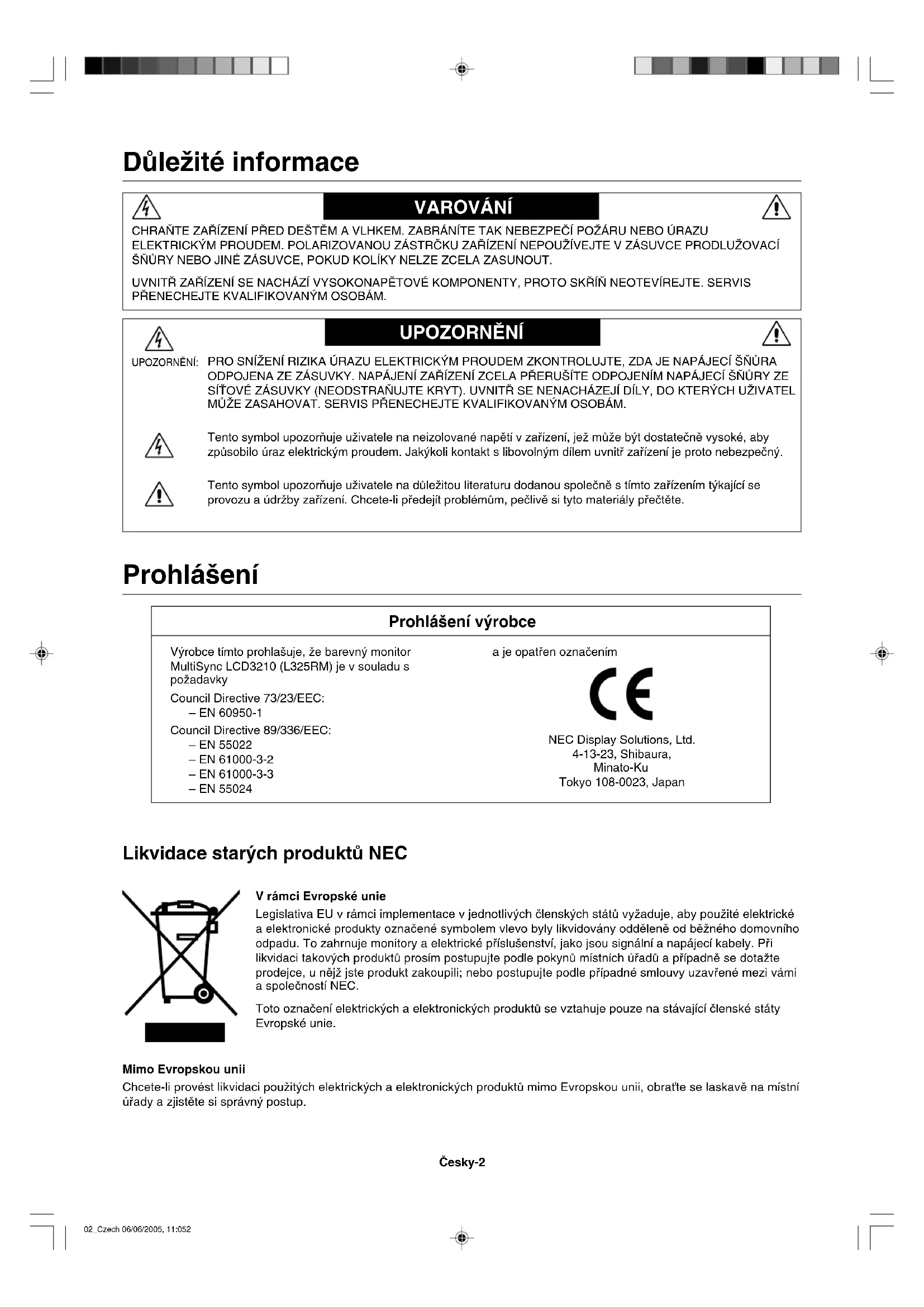 - ≈ÒRY NEBO JINÉ ZÁSUVCE, POKUD KOLÍKY NELZE ZCELA ZASUNOUT. UVNIT¤ ZA¤ÍZENÍ SE NACHÁZÍ VYSOKONAPùTOVÉ KOMPONENTY, PROTO SK¤Í≈ NEOTEVÍREJTE. SERVIS P¤ENECHEJTE KVALIFIKOVAN¯M OSOBÁM. VAROVÁNÍ UPOZORNùNÍ UPOZORNùNÍ: PRO SNÍÎENÍ RIZIKA ÚRAZU ELEKTRICK¯M PROUDEM ZKONTROLUJTE, ZDA JE NAPÁJECÍ ·≈ÒRA ODPOJENA ZE ZÁSUVKY. NAPÁJENÍ ZA¤ÍZENÍ ZCELA P¤ERU·ÍTE ODPOJENÍM NAPÁJECÍ ·≈ÒRY ZE SÍËOVÉ ZÁSUVKY (NEODSTRA≈UJTE KRYT). UVNIT¤ SE NENACHÁZEJÍ DÍLY, DO KTER¯CH UÎIVATEL MÒÎE ZASAHOVAT. SERVIS P¤ENECHEJTE KVALIFIKOVAN¯M OSOBÁM. Tento symbol upozorÀuje uÏivatele na neizolované napûtí v zafiízení, jeÏ mÛÏe b˘t dostateãnû vysoké, aby zpÛsobilo úraz elektrick˘m proudem. Jak˘koli kontakt s libovoln˘m dílem uvnitfi zafiízení je proto nebezpeãn˘. Tento symbol upozorÀuje uÏivatele na dÛleÏitou literaturu dodanou spoleãnû s tímto zafiízením t˘kající se provozu a údrÏby zafiízení. Chcete-li pfiedejít problémÛm, peãlivû si tyto materiály pfieãtûte. Likvidace star˘ch produktÛ NEC V rámci Evropské unie Legislativa EU v rámci implementace v jednotliv˘ch ãlensk˘ch státÛ vyÏaduje, aby pouÏité elektrické a elektronické produkty oznaãené symbolem vlevo byly likvidovány oddûlenû od bûÏného domovního odpadu. To zahrnuje monitory a elektrické pfiíslu‰enství, jako jsou signální a napájecí kabely. Pfii likvidaci takov˘ch produktÛ prosím postupujte podle pokynÛ místních úfiadÛ a pfiípadnû se dotaÏte prodejce, u nûjÏ jste produkt zakoupili; nebo postupujte podle pfiípadné smlouvy uzavfiené mezi vámi a spoleãností NEC. Toto oznaãení elektrick˘ch a elektronick˘ch produktÛ se vztahuje pouze na stávající ãlenské státy Evropské unie. Mimo Evropskou unii Chcete-li provést likvidaci pouÏit˘ch elektrick˘ch a elektronick˘ch produktÛ mimo Evropskou unii, obraÈte se laskavû na místní úfiady a zjistûte si správn˘ postup. 02_Czech 06/06/2005, 11:052âesky âesky-3 CHCETE-LI DOSÁHNOUT OPTIMÁLNÍHO V¯KONU BAREVNÉHO MONITORU MULTISYNC LCD3210, POSTUPUJTE P¤I INSTALACI A NASTAVENÍ PODLE NÁSLEDUJÍCÍCH POKYNÒ: