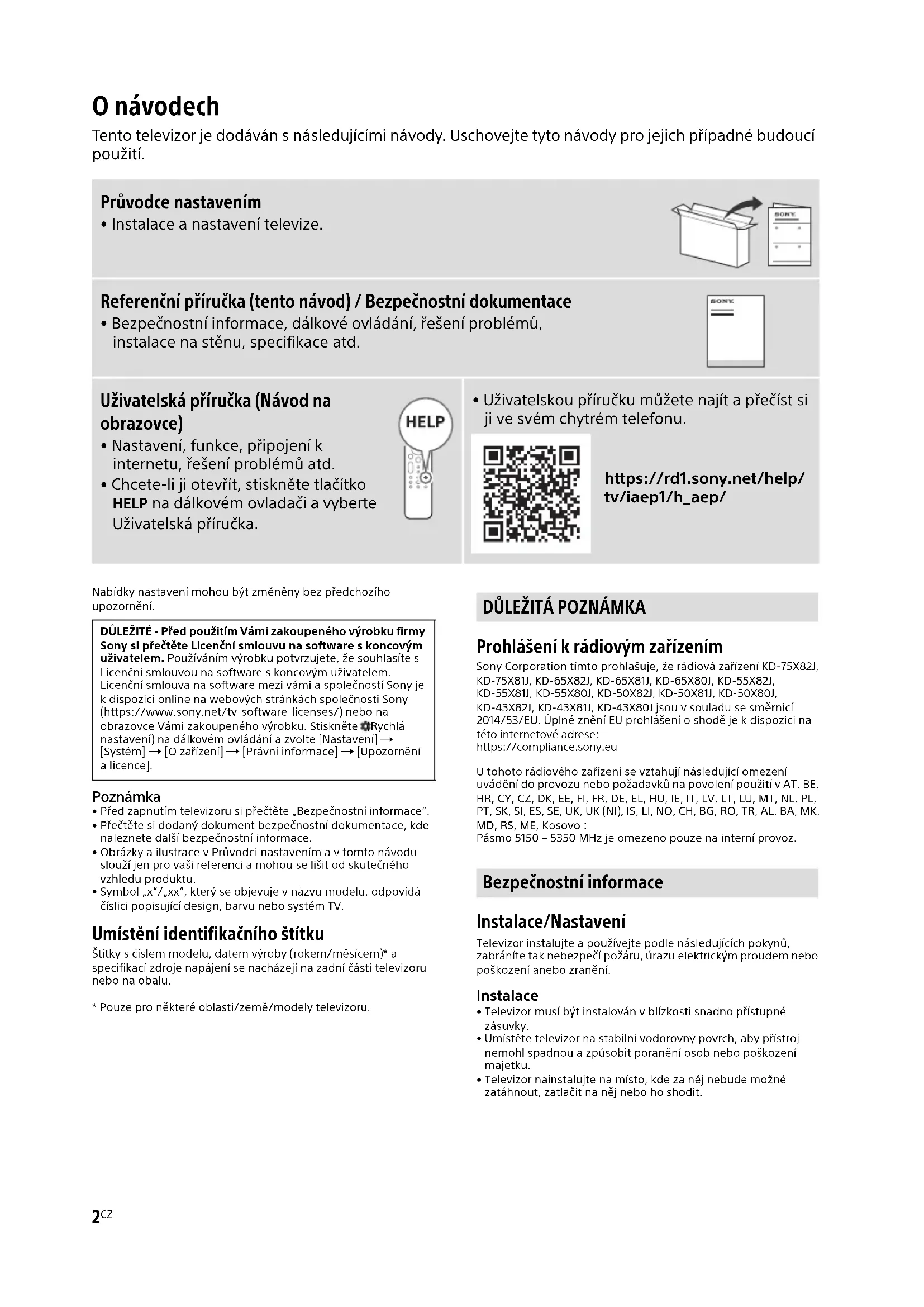 - Pouze pro některé oblasti/země/modely televizoru. Prohlášení k rádiovým zařízením Sony Corporation tímto prohlašuje, že rádiová zařízení KD-75X82J, KD-75X81J, KD-65X82J, KD-65X81J, KD-65X80J, KD-55X82J, KD-55X81J, KD-55X80J, KD-50X82J, KD-50X81J, KD-50X80J, KD-43X82J, KD-43X81J, KD-43X80J jsou v souladu se směrnicí 2014/53/EU. Úplné znění EU prohlášení o shodě je k dispozici na této internetové adrese: https://compliance.sony.eu U tohoto rádiového zařízení se vztahují následující omezení uvádění do provozu nebo požadavků na povolení použití v AT, BE, HR, CY, CZ, DK, EE, FI, FR, DE, EL, HU, IE, IT, LV, LT, LU, MT, NL, PL, PT, SK, SI, ES, SE, UK, UK (NI), IS, LI, NO, CH, BG, RO, TR, AL, BA, MK, MD, RS, ME, Kosovo : Pásmo 5150 – 5350 MHz je omezeno pouze na interní provoz. Instalace/Nastavení Televizor instalujte a používejte podle následujících pokynů, zabráníte tak nebezpečí požáru, úrazu elektrickým proudem nebo poškození anebo zranění. Instalace