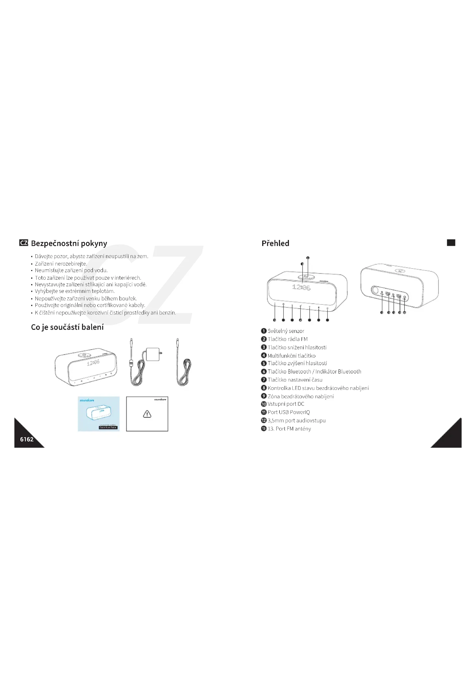Světelný senzor Tlačítko rádia FM Tlačítko snížení hlasitosti Multifunkční tlačítko Tlačítko zvýšení hlasitosti Tlačítko Bluetooth/ Indikátor Bluetooth Tlačítko nastavení času Kontrolka LED stavu bezdrátového nabíjení Zóna bezdrátového nabíjení Vstupní port DC Port USB PowerIQ 3,5mm port audiovstupu