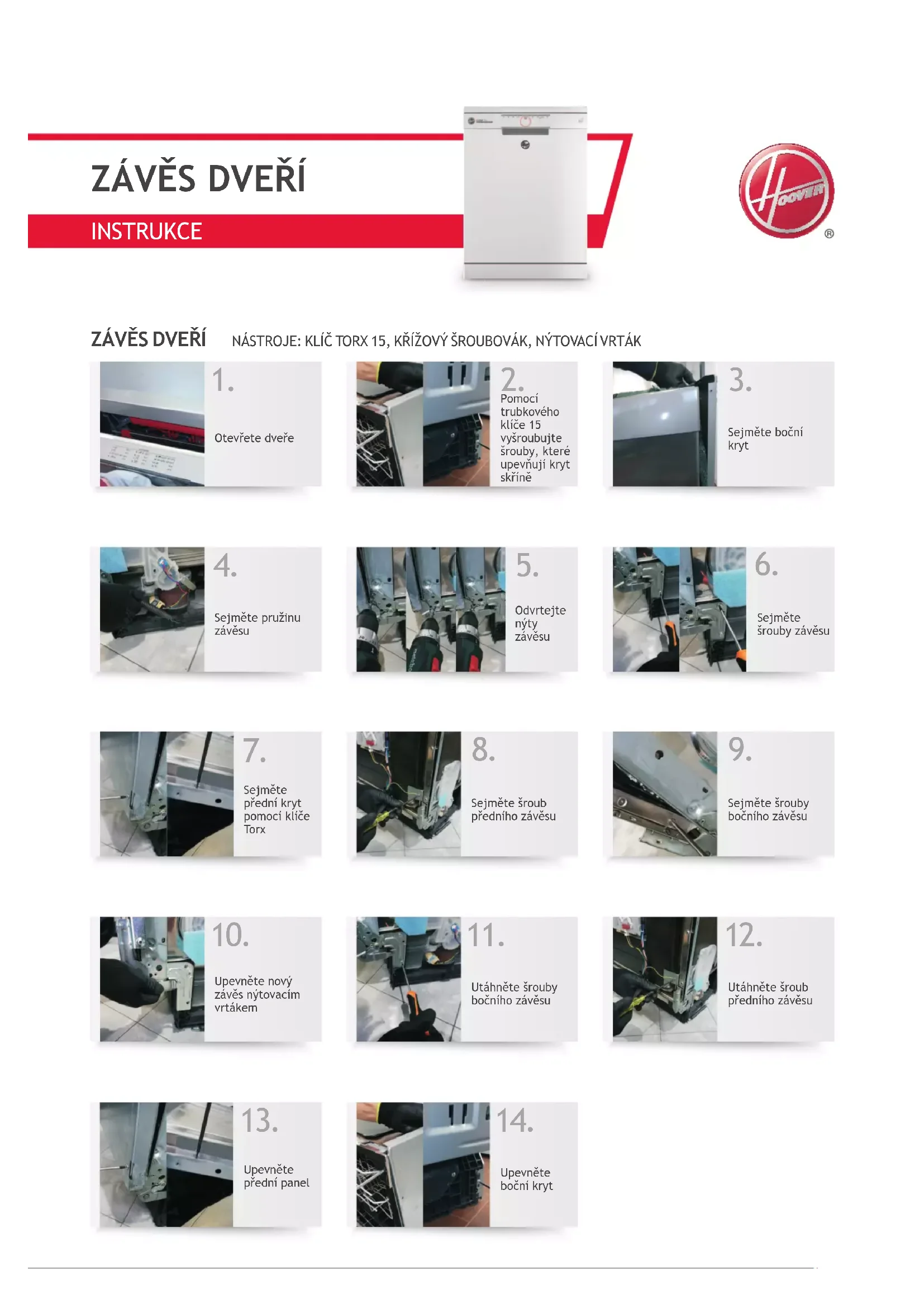 Utáhněte šrouby bočního závěsu Utáhněte šroub předního závěsu Upevněte přední panel Upevněte boční kryt ZÁVĚS DVEŘÍ NÁSTROJE: KLÍČ TORX 15, KŘÍŽOVÝ ŠROUBOVÁK, NÝTOVACÍ VRTÁK