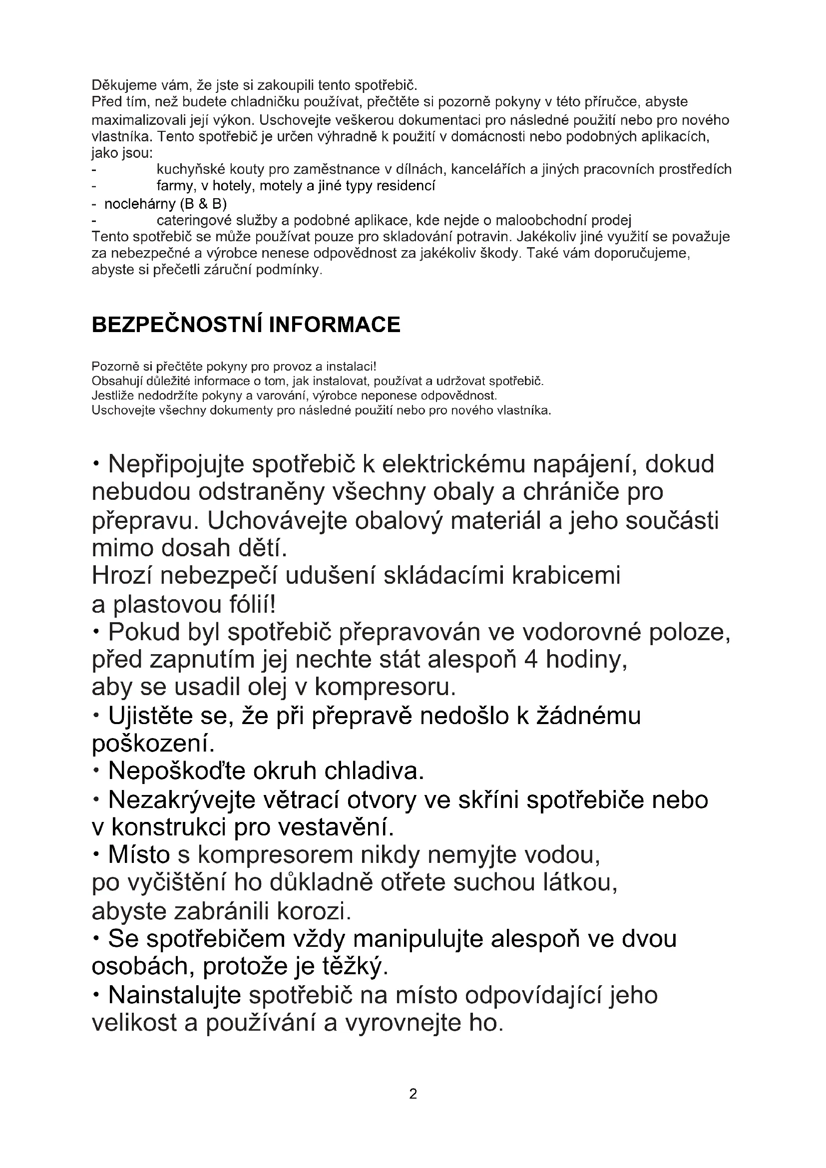 Pozorně si přečtěte pokyny pro provoz a instalaci! Obsahují důležité informace o tom, jak instalovat, používat a udržovat spotřebič. Jestliže nedodržíte pokyny a varování, výrobce neponese odpovědnost. Uschovejte všechny dokumenty pro následné použití nebo pro nového vlastníka. Nepřipojujte spotřebič k elektrickému napájení, dokud nebudou odstraněny všechny obaly a chrániče pro přepravu. Uchovávejte obalový materiál a jeho součásti mimo dosah dětí. Hrozí nebezpečí udušení skládacími krabicemi a plastovou fólií! Pokud byl spotřebič přepravován ve vodorovné poloze, před zapnutím jej nechte stát alespoň 4 hodiny, aby se usadil olej v kompresoru. Ujistěte se, že při přepravě nedošlo k žádnému poškození. Nepoškoďte okruh chladiva. Nezakrývejte větrací otvory ve skříni spotřebiče nebo v konstrukci pro vestavění. Místo s kompresorem nikdy nemyjte vodou, po vyčištění ho důkladně otřete suchou látkou, abyste zabránili korozi. Se spotřebičem vždy manipulujte alespoň ve dvou osobách, protože je těžký. Nainstalujte spotřebič na místo odpovídající jeho velikost a používání a vyrovnejte ho.3 Pouze pro Spojené království: Napájecí kabel spotřebiče je vybaven trojpólovou zástrčkou (s uzemněním), která se zapojuje do standardní trojpólové zásuvky (s uzemněním). Nikdy neodřezávejte ani nedemontujte třetí kolík (uzemnění). Zástrčka by měla být přístupná i po instalaci spotřebiče. Při přenášení/přesouvání spotřebiče dbejte na to, aby se kabel napájení nezachytil pod spotřebičem. Mohlo vy dojít k přeříznutí nebo poškození kabelu napájení. Pokud se poškodí napájecí kabel, výměnu musí provést výrobce, jeho servisní zástupce nebo osoby s podobnou kvalifikací, aby se vyloučilo riziko. Neinstalujte spotřebič ve vlhkém, mastném nebo prašném prostředí, zabraňte působení přímých slunečních paprsků nebo vody. Neinstalujte spotřebič poblíž zdrojů tepla nebo hořlavých materiálů. PRO spotřebiče s mrazákem: pokud dojde k výpadku napájení, neotevírejte víko. Jestliže trvá výpadek méně hodin, než je uvedeno na typovém štítku (Doba vzrůstu teploty), nemělo by to ovlivnit zmrazené potraviny. Jestliže trvá výpadek déle, je nutné potraviny zkontrolovat a okamžitě zkonzumovat, nebo uvařit a potom opět zmrazit. Pokud zjistíte, že víko spotřebiče se ihned po zavření obtížně otvírá, nemějte obavy. Je to způsobeno rozdílem tlaku, který se vyrovná a za několik minut budete moci víko normálně otevřít. Ve spotřebiči neskladujte léky, bakterie ani chemické látky. Tento spotřebič je určen k použití v domácnosti, nedoporučuje se v něm skladovat materiály, které vyžadují přesně stanovené teploty. Ujistěte se, že parametry elektrického napájení se shodují s údaji na typovém štítku. V opačném případě kontaktujte elektrikáře.4 Netahejte a neohýbejte kabel napájení, nedotýkejte se zásuvky mokrýma rukama. Ve spotřebiči neskladujte látky obsahující hořlavý hnací plyn (např. aerosolové nádoby) nebo výbušné látky. Hrozí nebezpečí výbuchu! Nepokládejte na horní stranu chladničky nestabilní předměty (těžké předměty, nádoby naplněné vodou), aby se předešlo zranění způsobenému pádem nebo elektrickým proudem v důsledku styku s vodou. Uvnitř prostoru pro skladování potravin nepoužívejte elektrické spotřebiče, pokud se nejedná o spotřebiče doporučené výrobcem. Nedotýkejte se vnitřních chladicích prvků, zejména ne mokrýma rukama, aby se zamezilo prasknutí nebo zranění. Nebezpečí hrozí dětem, osobám s omezenými fyzickými, smyslovými nebo duševními schopnostmi, stejně jako osobám s nedostatečnými znalostmi o bezpečném používání spotřebiče. Zkontrolujte, zda děti a ohrožené osoby chápou nebezpečí. Osoba zodpovědná za bezpečnost musí dohlížet na děti a ohrožené osoby používající spotřebič, nebo je musí poučit. Spotřebič mohou používat pouze děti starší osmi let. Děti si nesmí hrát se spotřebičem. Děti ve věku od tří do osmi let smějí vkládat potraviny a vyjímat je z tohoto spotřebiče. PRO spotřebiče s mrazákem: neukládejte do mrazáku tekutiny v láhvích nebo plechovkách (zejména nápoje sycené oxidem uhličitým). Láhve a plechovky mohou prasknout! PRO spotřebiče s mrazákem: nikdy nevkládejte do úst zmrazené potraviny přímo z mrazáku. Hrozí nebezpečí vzniku omrzlin!5 Chraňte plastové součásti a těsnění dveří před olejem a tukem. Jinak by se na plastových součástech a těsnění dveří mohly vytvořit póry. Před jakoukoli manipulací se spotřebičem odpojte napájecí kabel od zásuvky. Nepoužívejte mechanické nástroje ani jinak neurychlujte proces rozmrazování. Používejte pouze prostředky doporučené výrobcem. K odstraňování námrazy nepoužívejte špičaté nebo ostré předměty. K odmrazování nikdy nepoužívejte vysoušeče vlasů, elektrické ohřívače a jiné podobné elektrické spotřebiče. Doporučuje se udržovat zástrčku v čistém stavu. Nánosy prachu na zástrčce mohou způsobit požár. Nepokoušejte se opravovat, rozebírat nebo upravovat spotřebič vlastními silami. Je-li nutná oprava, vždy se obraťte na náš zákaznický servis. Během čištění nebo údržby spotřebiče dohlížejte na děti. Nečistěte chladné skleněné police horkou vodou. Náhlá změna teploty by mohla způsobit, že sklo praskne. VAROVÁNÍ: V trubicích chladicího okruhu proudí malé množství chladiva (R600a) a izolačního plynu (cyklopentanu); tyto látky jsou šetrné k životnímu prostředí, ale hořlavé. Nepoškozují ozónovou vrstvu a nezvyšují účinky skleníkového efektu. Pokud chladivo unikne, mohlo by vám poškodit zrak, nebo by se mohlo vzn
