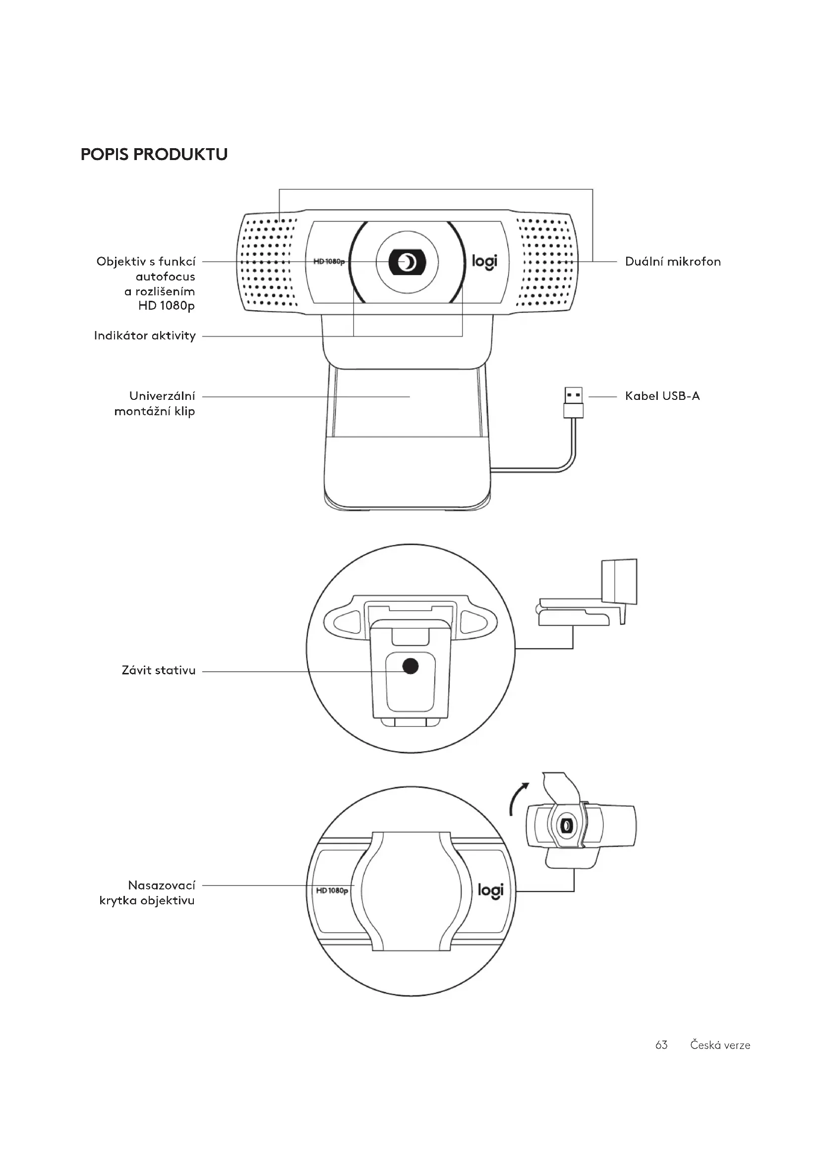 A működésjelző LED fénye mutatja, hogy a webkamerát egy alkalmazás használja. A RÖGZÍTŐCSIPESSZEL EGYÜTT: Magasság × szélesség × mélység: 43,3 mm (1,70hüvelyk) x 94 mm (3,70hüvelyk) x 71 mm (2,80hüvelyk) Kábelhossz: 1,5 m (5 láb) Tömeg: 162 g (5,71 uncia) MÉRETEK www.logitech.com/support/C920e © 2020 A Logitech és a Logi név, valamint a Logitech embléma a Logitech Europe S.A. vállalat saját és/vagy az Egyesült Államokban vagy más országokban lévő leányvállalatainak védjegye vagy bejegyzett védjegye. A felhasználói útmutató esetleges hibáiért a Logitech nem vállal felelősséget. Az itt található információk előzetes értesítés nélkül változhatnak.Objektiv sfunkcí autofocus a rozlišením HD1080p Indikátor aktivity Univerzální montážní klip Závit stativu Nasazovací krytka objektivu Kabel USB-A POPIS PRODUKTU Duální mikrofon 63 Česká verzeNASAZENÍ KRYTKY OBJEKTIVU 1 Nasaďte externí krytku objektivu vyhledáním objektivu na webové kameře. OBSAH BALENÍ 1 Webová kamera spřipojeným kabelem USB-A odélce 1,5m (1.5ft) 2 Krytka objektivu 3 Uživatelská dokumentace USB-A 2 Nacvakněte ji na přední část webové kamery, přímo na střed. 3 Ručně krytku nastavte, aby se otevírala a zavírala podle potřeby. 64 Česká verzeNASTAVENÍ WEBOVÉ KAMERY Pokyny k umístění na monitor 1 Umístěte webovou kameru na počítač, notebook nebo monitor do požadované polohy nebo úhlu. Pokyny kumístění na stativ* 1 Vyhledejte závit stativu 1/4 palce na spodku univerzálního upevňovacího klipu. 2 Po umístění webové kamery se ujistěte, žejespodek univerzálního montážního klipu vyrovnaný se zadní částí vašeho zařízení. 3 Ručně nastavte webovou kameru nahoru/ dolůtak, abyste co nejlépe zabírali sami sebe. 2 Upevněte webovou kameru na stativ našroubováním na závit ¼ palce. 3 Umístěte webovou kameru se stativem donejlepší polohy pro záběr.