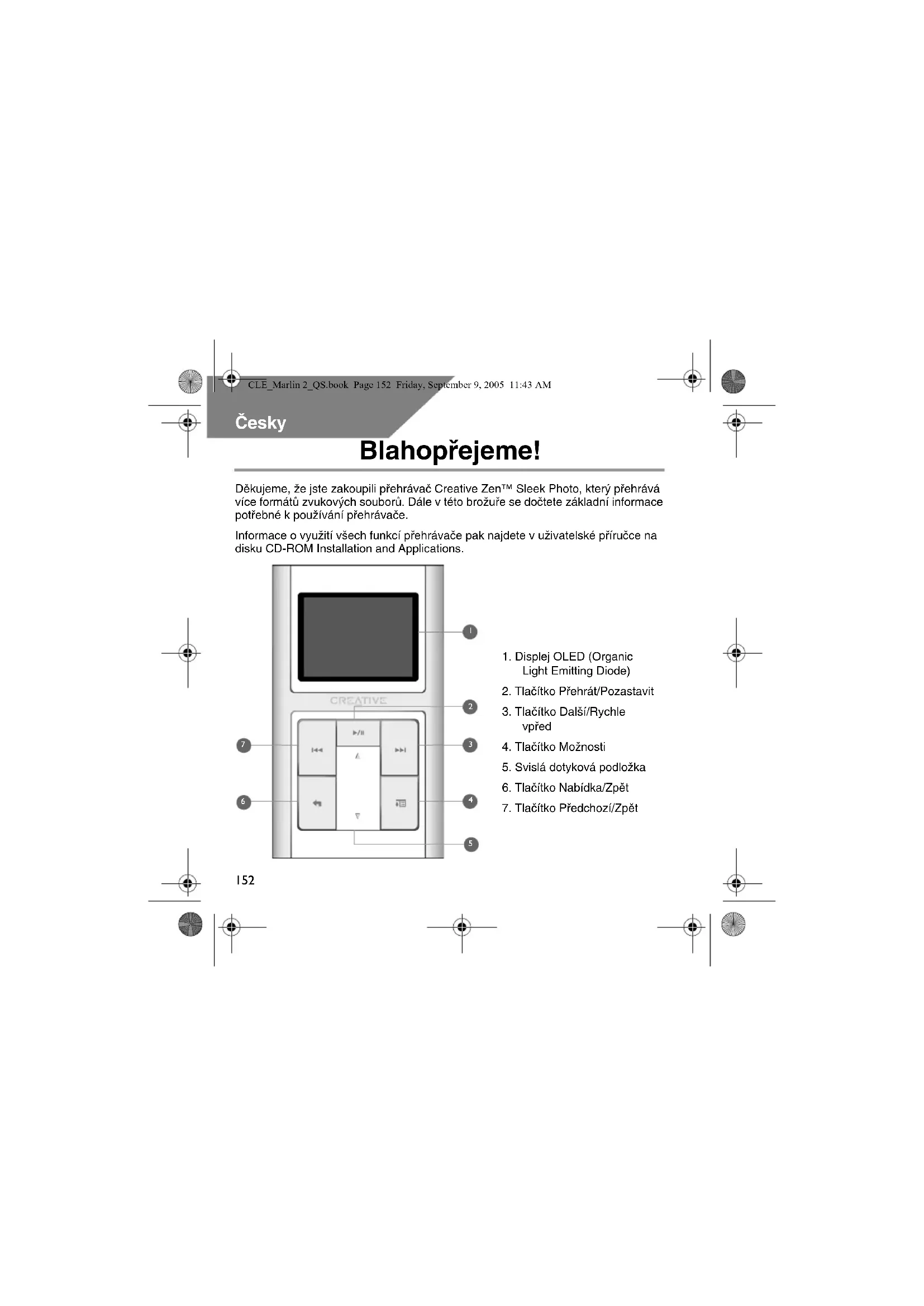 - Nepokoušejte se vyjmout integrovaný akumulátor. Přehrávač musí být zlikvidován v souladu s místními předpisy na ochranu životního prostředí. Potřebujete-li vyměnit akumulátor, vrat’te přehrávač místnímu středisku podpory. Informace o servisu produktu najdete na webu www.creative.com. Nesprávné zacházení s přehrávačem může mít za následek zrušení záruky. Další informace získáte v přiloženém záručním listu. CLE_Marlin 2_QS.book Page 164 Friday, September 9, 2005 11:43 AM165 Symbol WEEE indikuje, že tento produkt nesmí být považován za běžný domácí odpad. Správnou likvidací produktu přispějete k ochraně životního prostředí. Podrobnější informace o recyklaci tohoto produktu získáte od místních úřadů, od firmy, která u vás zajišt’uje odvoz odpadků, nebo v obchodě, kde jste výrobek zakoupili. Copyright © 2005 Creative Technology Ltd. Všechna práva vyhrazena. Logo Creative, Zen a Creative MediaSource jsou ochranné známky nebo registrované ochranné známky společnosti Creative Technology Ltd. v USA a dalších zemích. Windows je registrovaná ochranná známka společnosti Microsoft Corporation. Gracenote je registrovaná ochranná známka společnosti Gracenote, Inc. CLE_Marlin 2_QS.book Page 165 Friday, September 9, 2005 11:43 AM166 Polski Gratulujemy! Dziękujemy za zakup obsługującego różne formaty odtwarzacza Creative Zen™ Sleek Photo firmy Creative. Informacje zamieszczone w niniejszym dokumencie ułatwią rozpoczęcie korzystania z nowego odtwarzacza! Aby optymalnie wykorzystać odtwarzacz, należy również przeczytać obszerny Podręcznik użytkownika dostarczony na instalacyjnym dysku CD z aplikacjami.