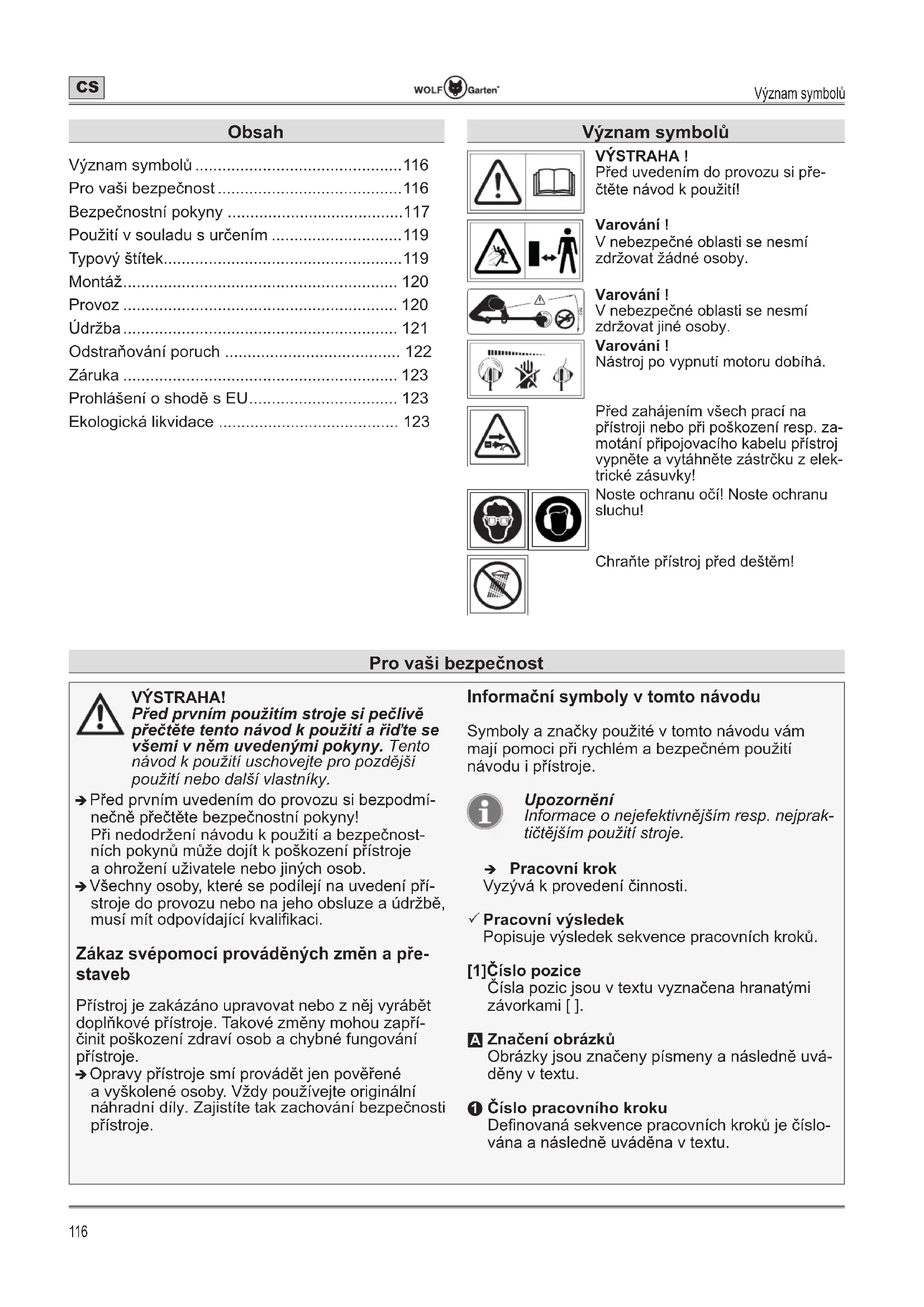 - ýíslo pracovního kroku De¿novaná sekvence pracovních krokĤ je þíslo- vána a následnČ uvádČna v textu. Pro vaãi bezpeþnost Vêznam symbolĤ VÝSTRAHA ! PĜed uvedením do provozu si pĜe- þtČte návod k pouåití! Varování ! V nebezpeþné oblasti se nesmí zdråovat åádné osoby. 360° Varování ! V nebezpeþné oblasti se nesmí zdråovat jiné osoby. Varování ! Nástroj po vypnutí motoru dobíhá. PĜed zahájením vãech prací na pĜístroji nebo pĜi poãkození resp. za- motání pĜipojovacího kabelu pĜístroj vypnČte a vytáhnČte zástrþku z elek- trické zásuvky! Noste ochranu oþí! Noste ochranu sluchu! ChraĖte pĜístroj pĜed deãtČm! Obsah Vêznam symbolĤ p. 116