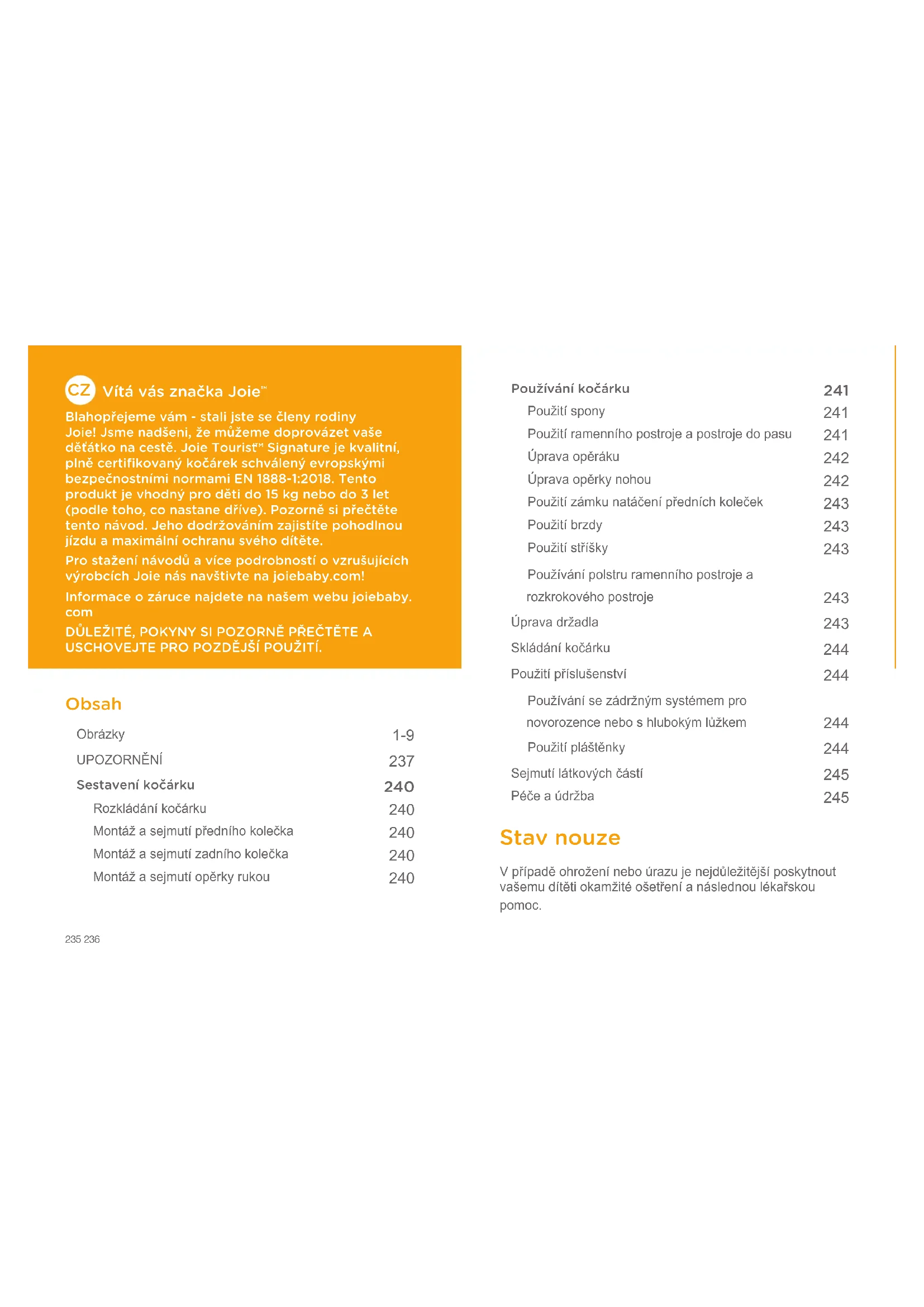 Blahopřejeme vám - stali jste se členy rodiny Joie! Jsme nadšeni, že můžeme doprovázet vaše děťátko na cestě. Joie Tourist ™ Signature je kvalitní, plně certifikovaný kočárek schválený evropskými bezpečnostními normami EN 1888-1:2018. Tento produkt je vhodný pro děti do 15 kg nebo do 3 let (podle toho, co nastane dříve). Pozorně si přečtěte tento návod. Jeho dodržováním zajistíte pohodlnou jízdu a maximální ochranu svého dítěte. Pro stažení návodů a více podrobností o vzrušujících výrobcích Joie nás navštivte na joiebaby.com! Informace o záruce najdete na našem webu joiebaby. com DŮLEŽITÉ, POKYNY SI POZORNĚ PŘEČTĚTE A USCHOVEJTE PRO POZDĚJŠÍ POUŽITÍ. Obsah Obrázky 1-9 UPOZORNĚNÍ