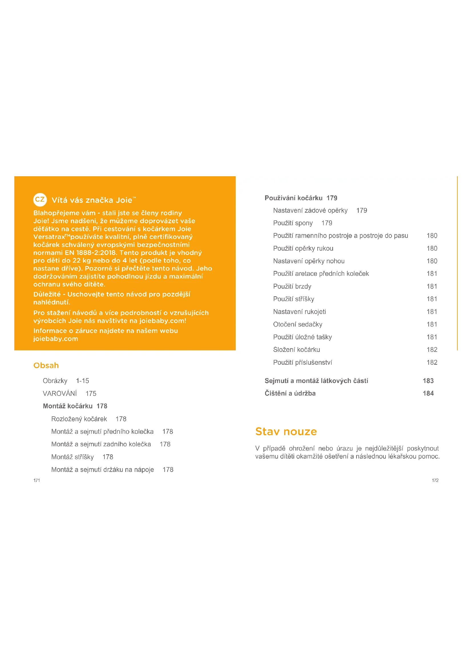 používáte kvalitní, plně certifikovaný kočárek schválený evropskými bezpečnostními normami EN 1888-2:2018. Tento produkt je vhodný pro děti do 22 kg nebo do 4 let (podle toho, co nastane dříve). Pozorně si přečtěte tento návod. Jeho dodržováním zajistíte pohodlnou jízdu a maximální ochranu svého dítěte. Důležité - Uschovejte tento návod pro pozdější nahlédnutí. Pro stažení návodů a více podrobností o vzrušujících výrobcích Joie nás navštivte na joiebaby.com! Informace o záruce najdete na našem webu joiebaby.com Obsah Obrázky 1-15 VAROVÁNÍ 175 Montáž kočárku 178 Rozloženýkočárek 178 Montážasejmutípředníhokolečka 178 Montážasejmutízadníhokolečka 178 Montážstříšky 178 Montážasejmutídržákunanápoje 178 Používání kočárku 179 Nastavenízádovéopěrky 179 Použitíspony 179 Použitíramenníhopostrojeapostrojedopasu 180 Použitíopěrkyrukou 180 Nastaveníopěrkynohou 180 Použitíaretacepředníchkoleček 181 Použitíbrzdy 181 Použitístříšky 181 Nastavenírukojeti 181 Otočenísedačky 181 Použitíúložnétašky 181 Složeníkočárku 182 Použitípříslušenství 182 Sejmutí a montáž látkových částí 183 Čištění a údržba 184 Stav nouze V případě ohrožení nebo úrazu je nejdůležitější poskytnout vašemudítětiokamžitéošetřeníanáslednoulékařskoupomoc.173
