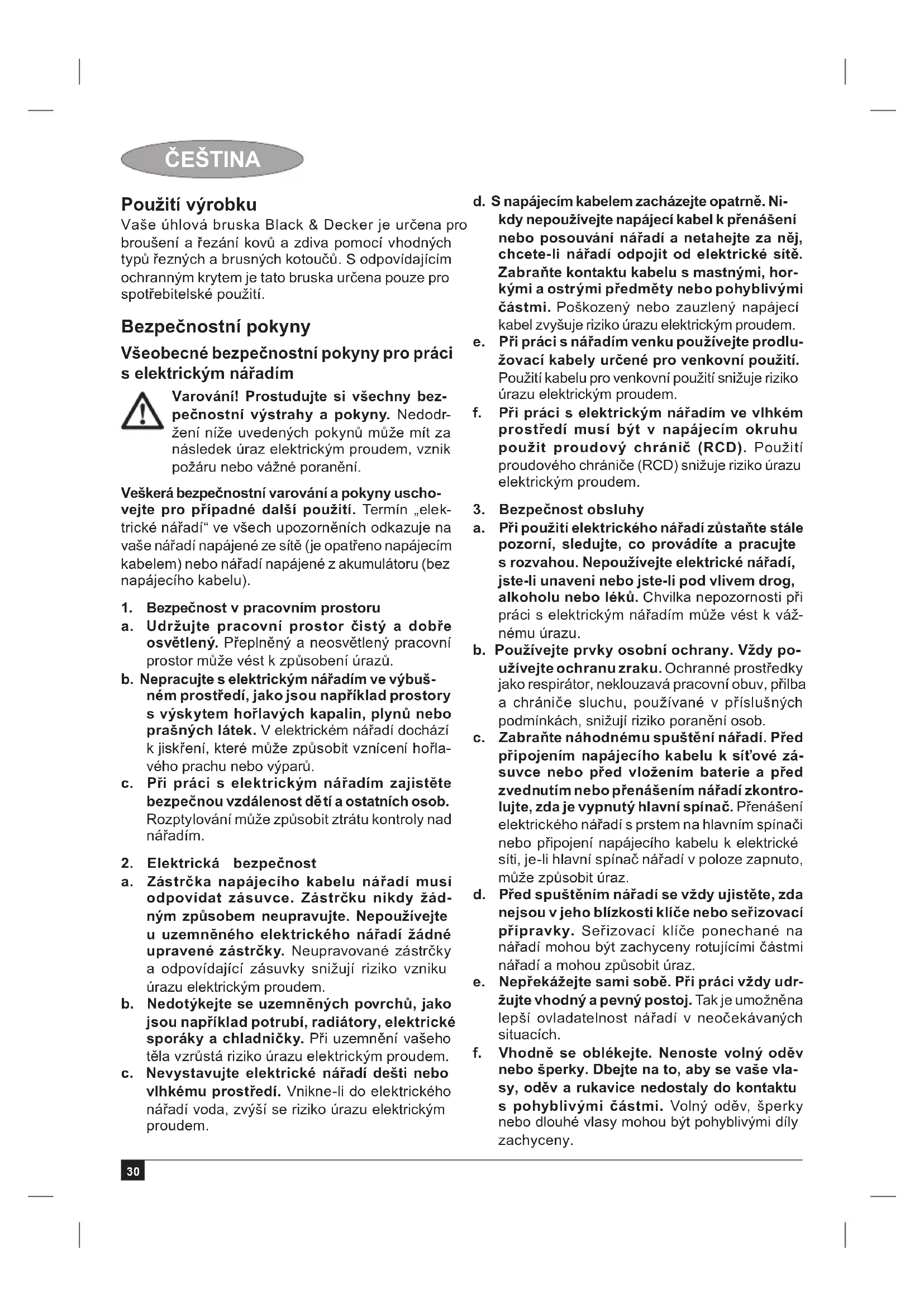 a. Zástrčka napájecího kabelu nářadí musí odpovídat zásuvce. Zástrčku nikdy žád- ným způsobem neupravujte. Nepoužívejte u uzemněného elektrického nářadí žádné upravené zástrčky. Neupravované zástrčky a odpovídající zásuvky snižují riziko vzniku úrazu elektrickým proudem. b. Nedotýkejte se uzemněných povrchů, jako jsou například potrubí, radiátory, elektrické sporáky a chladničky. Při uzemnění vašeho těla vzrůstá riziko úrazu elektrickým proudem. c. Nevystavujte elektrické nářadí dešti nebo vlhkému prostředí. Vnikne-li do elektrického nářadí voda, zvýší se riziko úrazu elektrickým proudem. d. S napájecím kabelem zacházejte opatrně. Ni- kdy nepoužívejte napájecí kabel k přenášení nebo posouvání nářadí a netahejte za něj, chcete-li nářadí odpojit od elektrické sítě. Zabraňte kontaktu kabelu s mastnými, hor- kými a ostrými předměty nebo pohyblivými částmi. Poškozený nebo zauzlený napájecí kabel zvyšuje riziko úrazu elektrickým proudem. e. Při práci s nářadím venku používejte prodlu- žovací kabely ur čené pro venkovní použití. Použití kabelu pro venkovní použití snižuje riziko úrazu elektrickým proudem. f. Při práci s elektrickým nářadím ve vlhkém prostředí musí být v napájecím okruhu použit proudový chránič (RCD). Použití proudového chrániče (RCD) snižuje riziko úrazu elektrickým proudem.
