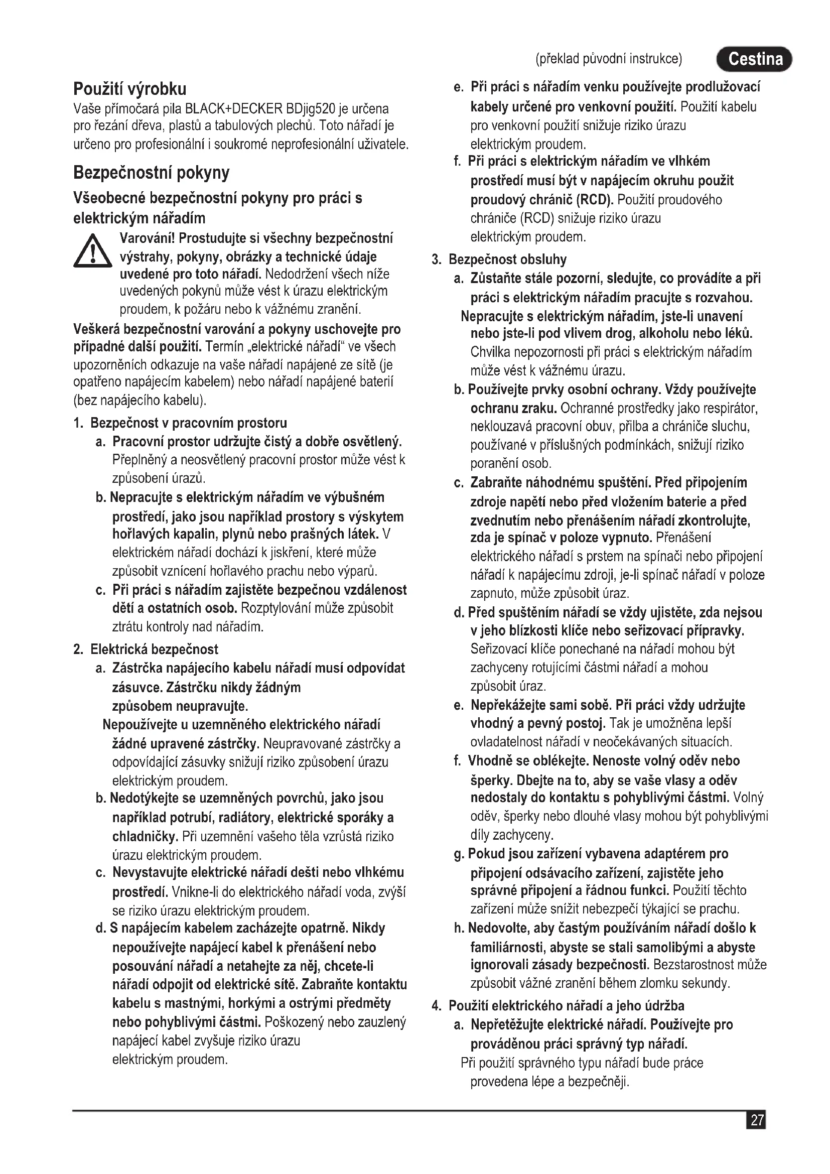 (překlad původní instrukce) Cestina (překlad původní instrukce) Použití výrobku Vaše přímočará pila BLACK+DECKER BDjig520 je určena pro řezání dřeva, plastů a tabulových plechů. Toto nářadí je určeno pro profesionální i soukromé neprofesionální uživatele. Bezpečnostní pokyny Všeobecné bezpečnostní pokyny pro práci s elektrickým nářadím