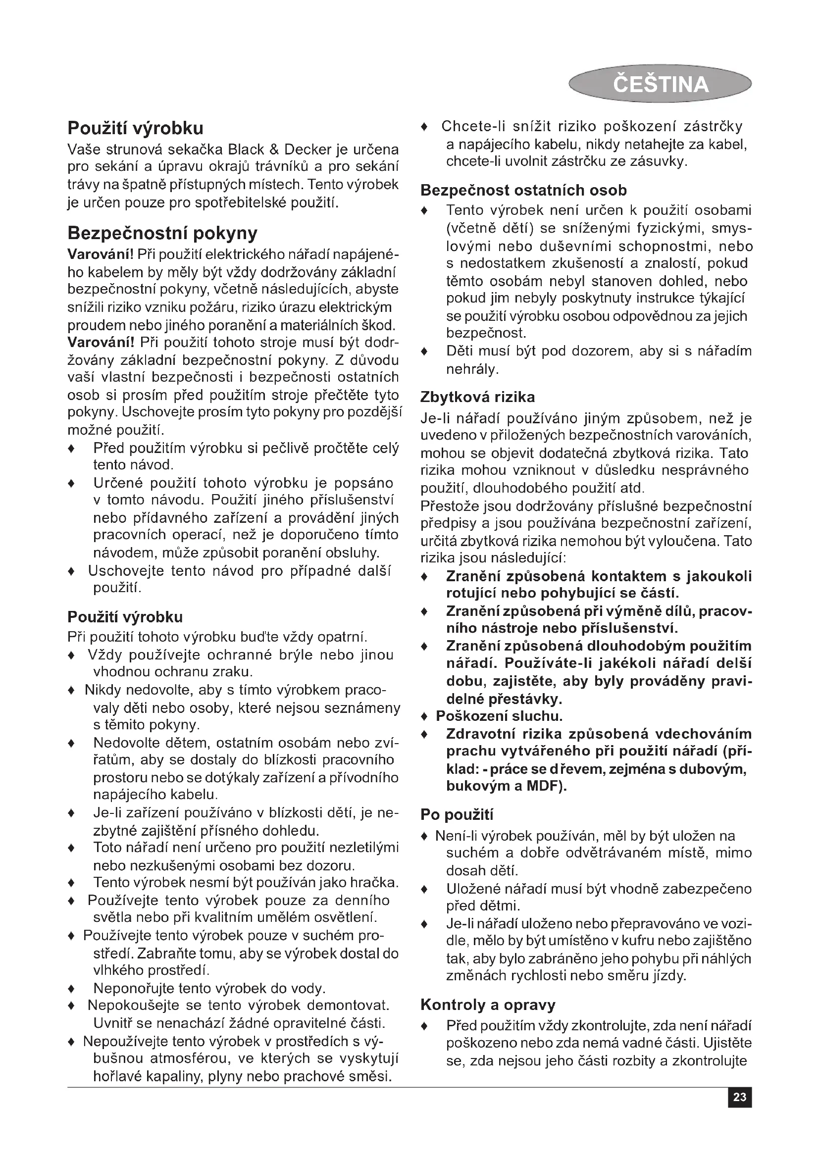 Garantie Black & Decker assure la qualité de ses produits et vous offre une garantie très élargie. Ce certifi cat de garantie est un document supplémentaire et ne peut en aucun cas se substituer à vos droits légaux. La garantie est valable sur tout le territoire des États22 FRANÇAIS Membres de l’Union Européenne et de la Zone de Libre Échange Européenne. Si un produit Black & Decker s’avère défectueux en raison de matériaux en mauvaises conditions, d’une erreur humaine, ou d’un manque de conformité dans les 24 mois suivant la date d’achat, Black & Decker garantit le remplacement des pièces défectueuses, la réparation des produits usés ou cassés ou rem- place ces produits à la convenance du client, sauf dans les circonstances suivantes: ♦ Le produit a été utilisé dans un but commercial, professionnel, ou a été loué; ♦ Le produit a été mal utilisé ou utilisé avec négli- gence; ♦ Le produit a subi des dommages à cause d’objets étrangers, de substances ou à cause d’accidents; ♦ Des réparations ont été tentées par des techni- ciens ne faisant pas partie du service technique de Black & Decker. Pour avoir recours à la garantie, il est nécessaire de fournir une preuve d’achat au vendeur ou à un réparateur agréé. Pour connaître l’adresse du réparateur agréé le plus proche de chez vous, contactez le bureau Black & Decker à l’adresse indiquée dans ce manuel. Vous pourrez aussi trouver une liste de réparateurs agréés de Black & Decker et de plus amples détails sur notre service après-vente sur le site Internet à l’adresse suivante: www.2helpU.com Visitez notre site Web www.blackanddecker.fr pour enregistrer votre nouveau produit Black & Decker et être informé des nouveaux produits et des offres spéciales. Pour plus d’informations concernant la marque Black & Decker et notre gamme de produits, consultez notre site www.blackanddecker.fr23 ČEŠTINA Použití výrobku Vaše strunová sekačka Black & Decker je určena pro sekání a úpravu okrajů trávníků a pro sekání trávy na špatně přístupných místech. Tento výrobek je určen pouze pro spotřebitelské použití. Bezpečnostní pokyny Varování! Při použití elektrického nářadí napájené- ho kabelem by měly být vždy dodržovány základní bezpečnostní pokyny, včetně následujících, abyste snížili riziko vzniku požáru, riziko úrazu elektrickým proudem nebo jiného poranění a materiálních škod. Varování! Při použití tohoto stroje musí být dodr- žovány základní bezpečnostní pokyny. Z důvodu vaší vlastní bezpečnosti i bezpečnosti ostatních osob si prosím před použitím stroje přečtěte tyto pokyny. Uschovejte prosím tyto pokyny pro pozdější možné použití. ♦ Před použitím výrobku si pečlivě pročtěte celý tento návod. ♦ Určené použití tohoto výrobku je popsáno v tomto návodu. Použití jiného příslušenství nebo přídavného zařízení a provádění jiných pracovních operací, než je doporučeno tímto návodem, může způsobit poranění obsluhy. ♦ Uschovejte tento návod pro případné další použití. Použití výrobku Při použití tohoto výrobku buďte vždy opatrní. ♦ Vždy používejte ochranné brýle nebo jinou vhodnou ochranu zraku. ♦ Nikdy nedovolte, aby s tímto výrobkem praco- valy děti nebo osoby, které nejsou seznámeny s těmito pokyny. ♦ Nedovolte dětem, ostatním osobám nebo zví- řatům, aby se dostaly do blízkosti pracovního prostoru nebo se dotýkaly zařízení a přívodního napájecího kabelu. ♦ Je-li zařízení používáno v blízkosti dětí, je ne- zbytné zajištění přísného dohledu. ♦ Toto nářadí není určeno pro použití nezletilými nebo nezkušenými osobami bez dozoru. ♦ Tento výrobek nesmí být používán jako hračka. ♦ Používejte tento výrobek pouze za denního světla nebo při kvalitním umělém osvětlení. ♦ Používejte tento výrobek pouze v suchém pro- středí. Zabraňte tomu, aby se výrobek dostal do vlhkého prostředí. ♦ Neponořujte tento výrobek do vody. ♦ Nepokoušejte se tento výrobek demontovat. Uvnitř se nenachází žádné opravitelné části. ♦ Nepoužívejte tento výrobek v prostředích s vý- bušnou atmosférou, ve kterých se vyskytují hořlavé kapaliny, plyny nebo prachové směsi. ♦ Chcete-li snížit riziko poškození zástrčky a napájecího kabelu, nikdy netahejte za kabel, chcete-li uvolnit zástrčku ze zásuvky. Bezpečnost ostatních osob ♦ Tento výrobek není určen k použití osobami (včetně dětí) se sníženými fyzickými, smys- lovými nebo duševními schopnostmi, nebo s nedostatkem zkušeností a znalostí, pokud těmto osobám nebyl stanoven dohled, nebo pokud jim nebyly poskytnuty instrukce týkající se použití výrobku osobou odpovědnou za jejich bezpečnost. ♦ Děti musí být pod dozorem, aby si s nářadím nehrály. Zbytková rizika Je-li nářadí používáno jiným způsobem, než je uvedeno v přiložených bezpečnostních varováních, mohou se objevit dodatečná zbytková rizika. Tato rizika mohou vzniknout v důsledku nesprávného použití, dlouhodobého použití atd. Přestože jsou dodržovány příslušné bezpečnostní předpisy a jsou používána bezpečnostní zařízení, určitá zbytková rizika nemohou být vyloučena. Tato rizika jsou následující: ♦ Zranění způsobená kontaktem s jakoukoli rotující nebo pohybující se částí. ♦ Zranění způsobená při výměně dílů, pracov- ního nástroje nebo příslušenství. ♦ Zranění způsobená dlouhodobým použitím nářadí. Používáte-li jakékoli nářadí delší dobu, zajistěte, aby byly prováděny pravi- delné přestávky. ♦ Poškození sluchu. ♦ Zdravotní rizika způsobená vdechováním prachu vytvářeného při použití nářadí (pří- klad: - práce se d řevem, zejména s