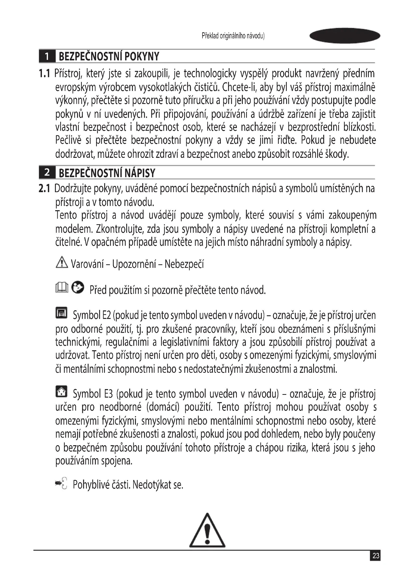 přístroji a v tomto návodu. Tento přístroj a návod uvádějí pouze symboly, které souvisí s vámi zakoupeným modelem. Zkontrolujte, zda jsou symboly a nápisy uvedené na přístroji kompletní a čitelné. V opačném případě umístěte na jejich místo náhradní symboly a nápisy. Varování – Upozornění – Nebezpečí Před použitím si pozorně přečtěte tento návod. Symbol E2 (pokud je tento symbol uveden v návodu) – označuje, že je přístroj určen pro odborné použití, tj. pro zkušené pracovníky, kteří jsou obeznámeni s příslušnými technickými, regulačními a legislativními faktory a jsou způsobilí přístroj používat a udržovat. Tento přístroj není určen pro děti, osoby somezenými fyzickými, smyslovými či mentálními schopnostmi nebo snedostatečnými zkušenostmi a znalostmi. Symbol E3 (pokud je tento symbol uveden v návodu) – označuje, že je přístroj určen pro neodborné (domácí) použití. Tento přístroj mohou používat osoby s omezenými fyzickými, smyslovými nebo mentálními schopnostmi nebo osoby, které nemají potřebné zkušenosti a znalosti, pokud jsou pod dohledem, nebo byly poučeny o bezpečném způsobu používání tohoto přístroje a chápou rizika, která jsou s jeho používáním spojena. Pohyblivé části. Nedotýkat se.24 ČESKY ČESKY