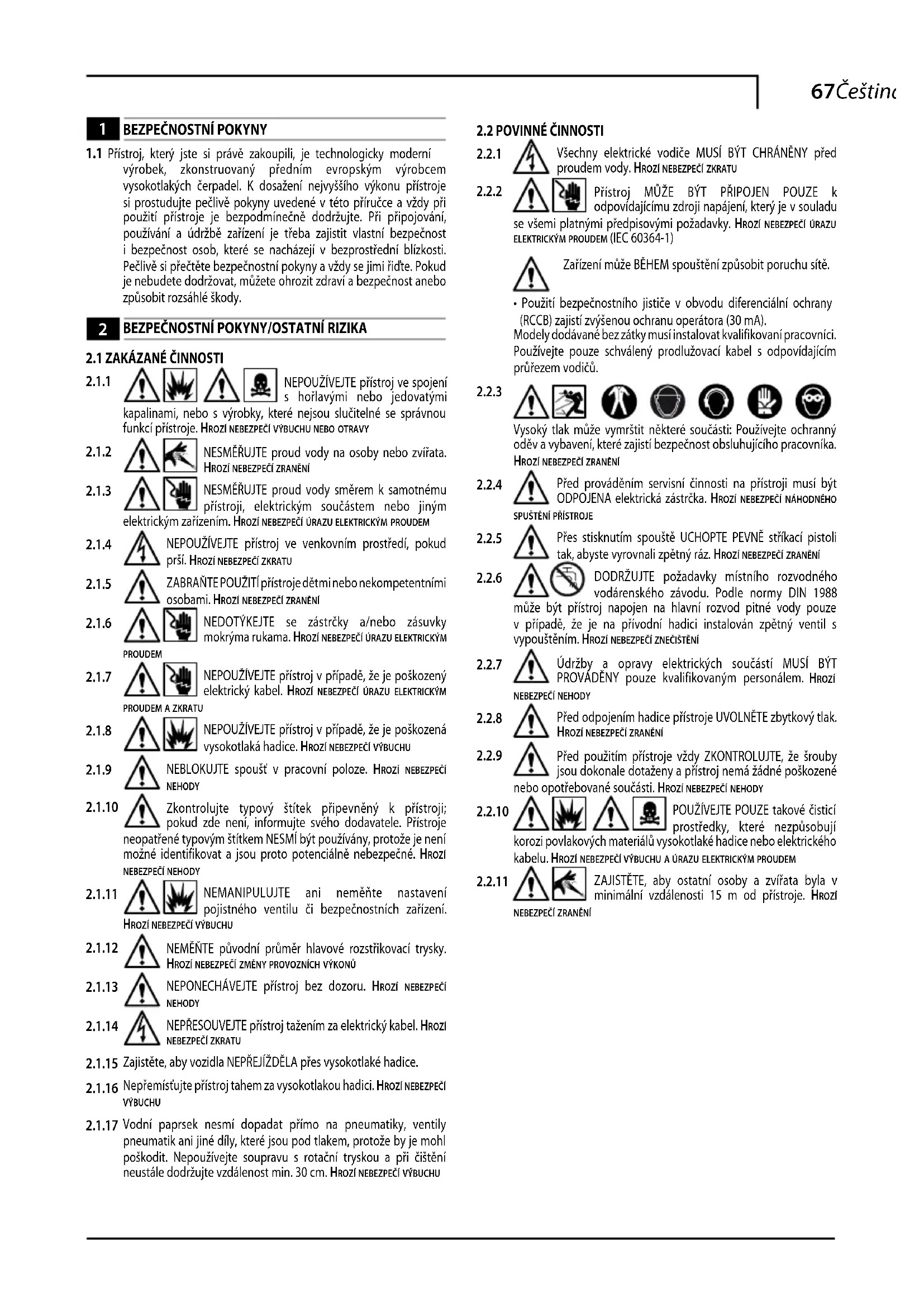 Vysoký tlak může vymrštit některé součásti: Používejte ochranný oděv a vybavení, které zajistí bezpečnost obsluhujícího pracovníka. hrozí neBezpečí zranění Před prováděním servisní činnosti na přístroji musí být ODPOJENA elektrická zástrčka. hrozí neBezpečí náhodného spuštění přístroje Přes stisknutím spouště UCHOPTE PEVNĚ stříkací pistoli tak, abyste vyrovnali zpětný ráz. hrozí neBezpečí zranění