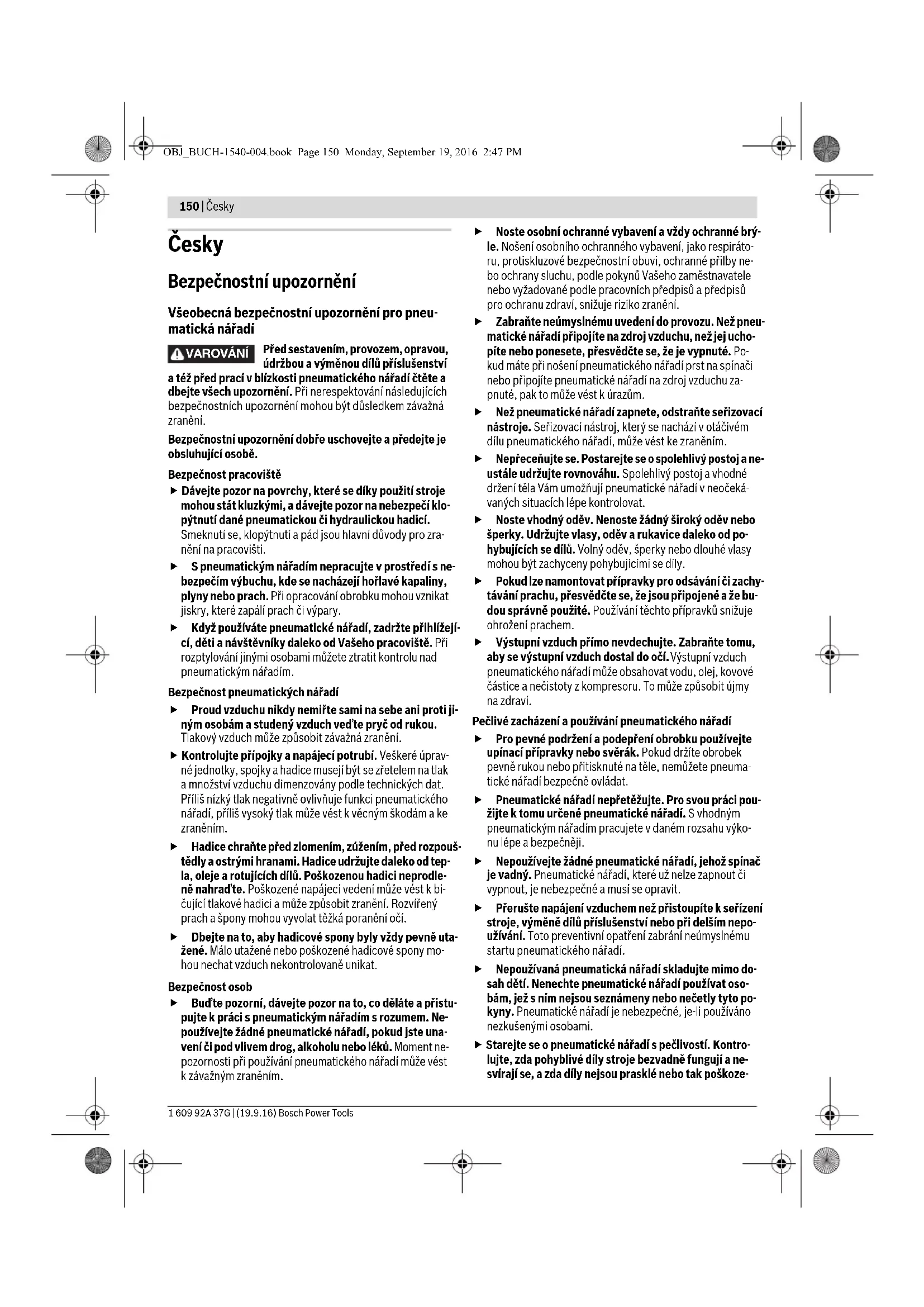 3,5 0,8 3,5 0,8 3,5 0,8 3,5 0,8 3,5 0,8 3,5 0,8 3,5 0,8 3,5 0,8 OBJ_BUCH-1540-004.book Page 155 Monday, September 19, 2016 2:47 PM156 | Česky 1 609 92A 37G | (19.9.16) Bosch Power Tools Prohlášení o shodě Prohlašujeme na výhradní zodpovědnost, že výrobek popsa- ný v části „Technické údaje“ splňuje všechna příslušná usta- novení směrnice 2006/42/ES včetně jejích změn a je v souladu s následujícími normami: EN ISO 11148-3. Technická dokumentace (2006/42/ES) u: Robert Bosch Power Tools GmbH, PT/ETM9, 70538 Stuttgart, GERMANY Robert Bosch Power Tools GmbH 70538 Stuttgart, GERMANY Stuttgart, 01.01.2017 Montáž Závěsný a upínací přípravek Zavěšovací přípravek (viz obr. A) Pokud chcete pneumatické nářadí provozovat v závěs- ném nebo upínacím přípravku, dbejte na to, aby dříve než jej připojíte na zdroj tlakového vzduchu byl nejprve upnut do přípravku. Tím zabráníte neúmyslnému uvedení do provozu. Pomocí zavěšovacího třmenu 4 můžete pneumatické nářadí upnout do závěsného přípravku. – 0 607 153 5.. Nasaďte zavěšovací třmen 4 na pneumatické nářadí a ne- chte jej v zářezech 10 zaskočit. Podle těžiště pneumatického nářadí můžete použít buď přední nebo zadní zářez. – 0 607 161 5.. Nastrčte zavěšovací třmen 4 na oblast upnutí 2. Pravidelně kontrolujte stav závěsného třmenu a závě- su v závěsném přípravku. Upínací přípravek 0 607 154 101/0 607 161 1../0 607 161 5.. – V uvedené oblasti upnutí 2 můžete upnout pneumatické nářadí do upínacího přípravku. Využijte pokud možno ce- lou oblast upnutí. Čím menší oblast upnutí, tím silněji půso- bí upínací síly. Oblast upnutí nepřetěžujte. Montáž přídavné rukojeti 0 607 160 5../0 607 161 1../0 607 161 5.. – Nasuňte přídavnou rukojeť 9 na oblast upnutí 2. Abyste dosáhli bezpečné a bezúnavové pracovní držení, mů- žete přídavné držadlo 9 libovolně natočit. – Otočte křídlový šroub pro přestavení přídavné rukojeti proti směru hodinových ručiček a otočte přídavné držadlo 9 do požadované polohy. Potom opět utáhněte kří- dlový šroub ve směru hodinových ručiček. Vedení výstupního vzduchu Pomocí vedení výstupního vzduchu můžete odvést výfukový vzduch hadicí výfukového vzduchu pryč od Vašeho pracoviště a současně dosáhnout optimálního tlumení hluku. Mimoto zlepšíte své pracovní podmínky, poněvadž už nebude Vaše pracoviště kontaminováno vzduchem s obsahem oleje nebo zde nebude vířit prach popř. piliny. Decentralizované vedení výfuku vzduchu (viz obr. B) 0 607 161 1../0 607 161 5.. – Vyšroubujte ven tlumič hluku na výfuku vzduchu 8 a na- hraďte jej hadicovou vsuvkou 5. – Povolte hadicovou sponu 11 hadice výfukového vzduchu 12 a hadici výfukového vzduchu upevněte na hadicové vsuvce 5 tím, že hadicovou sponu pevně utáhnete. 0 607 153 5../0 607 154 101 Vedení výfukového vzduchu by mělo být namontováno před připojením na zdroj vzduchu, poněvadž se musí odstranit víko tělesa 14. Výfukový vzduch můžete vést do jímky výfukového vzduchu. – Uvolněte tři upevňovací šrouby