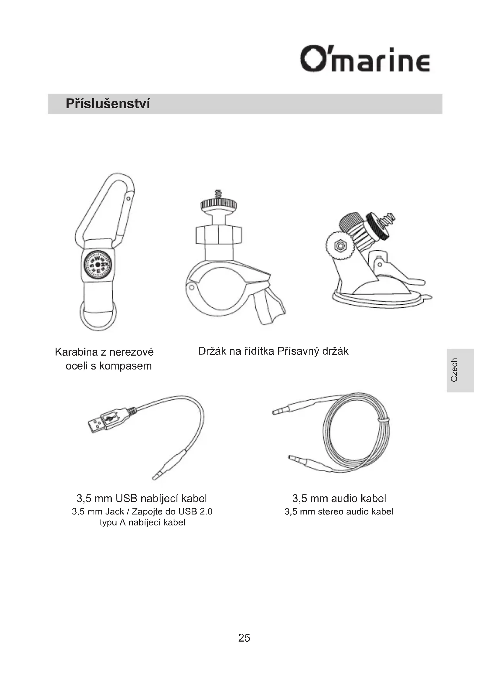 Přímý dosah 30m (záviset na faktorech prostředí) Technické údaje *Funkce kompasu pouze pro referenční *Záruka se nevztahuje na příslušenství29 Aksesoris Karabiner Kompas Stainless Steel Kabel charger USB 3.5mm Handlebar Mount Suction Cup Mount Kabel Audio 3.5mm Indonesia30