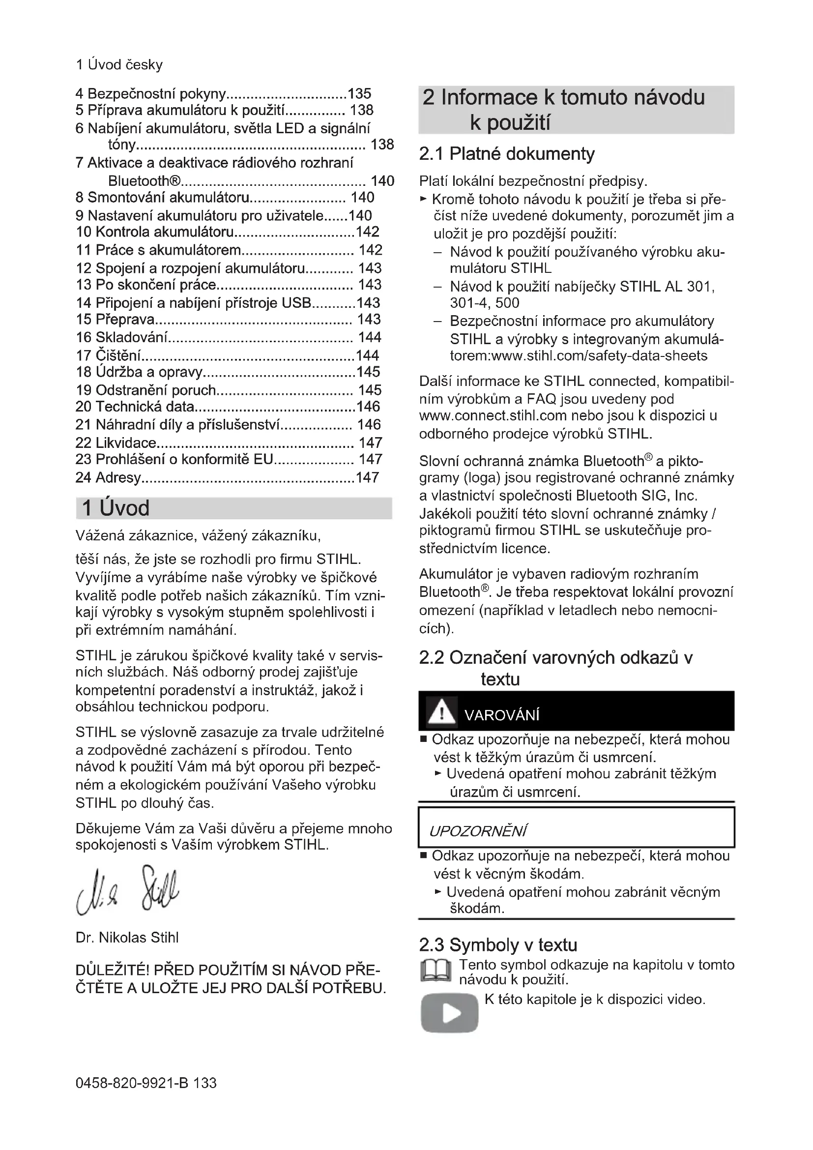 - 24 Adresy 1 Úvod Vážená zákaznice, vážený zákazníku, těší nás, že jste se rozhodli pro firmu STIHL. Vyvíjíme a vyrábíme naše výrobky ve špičkové kvalitě podle potřeb našich zákazníků. Tím vzni‐ kají výrobky s vysokým stupněm spolehlivosti i při extrémním namáhání. STIHL je zárukou špičkové kvality také v servis‐ ních službách. Náš odborný prodej zajišťuje kompetentní poradenství a instruktáž, jakož i obsáhlou technickou podporu. STIHL se výslovně zasazuje za trvale udržitelné a zodpovědné zacházení s přírodou. Tento návod k použití Vám má být oporou při bezpeč‐ ném a ekologickém používání Vašeho výrobku STIHL po dlouhý čas. Děkujeme Vám za Vaši důvěru a přejeme mnoho spokojenosti s Vaším výrobkem STIHL. Dr. Nikolas Stihl DŮLEŽITÉ! PŘED POUŽITÍM SI NÁVOD PŘE‐ ČTĚTE A ULOŽTE JEJ PRO DALŠÍ POTŘEBU. 2 Informace k tomuto návodu k použití p. 147