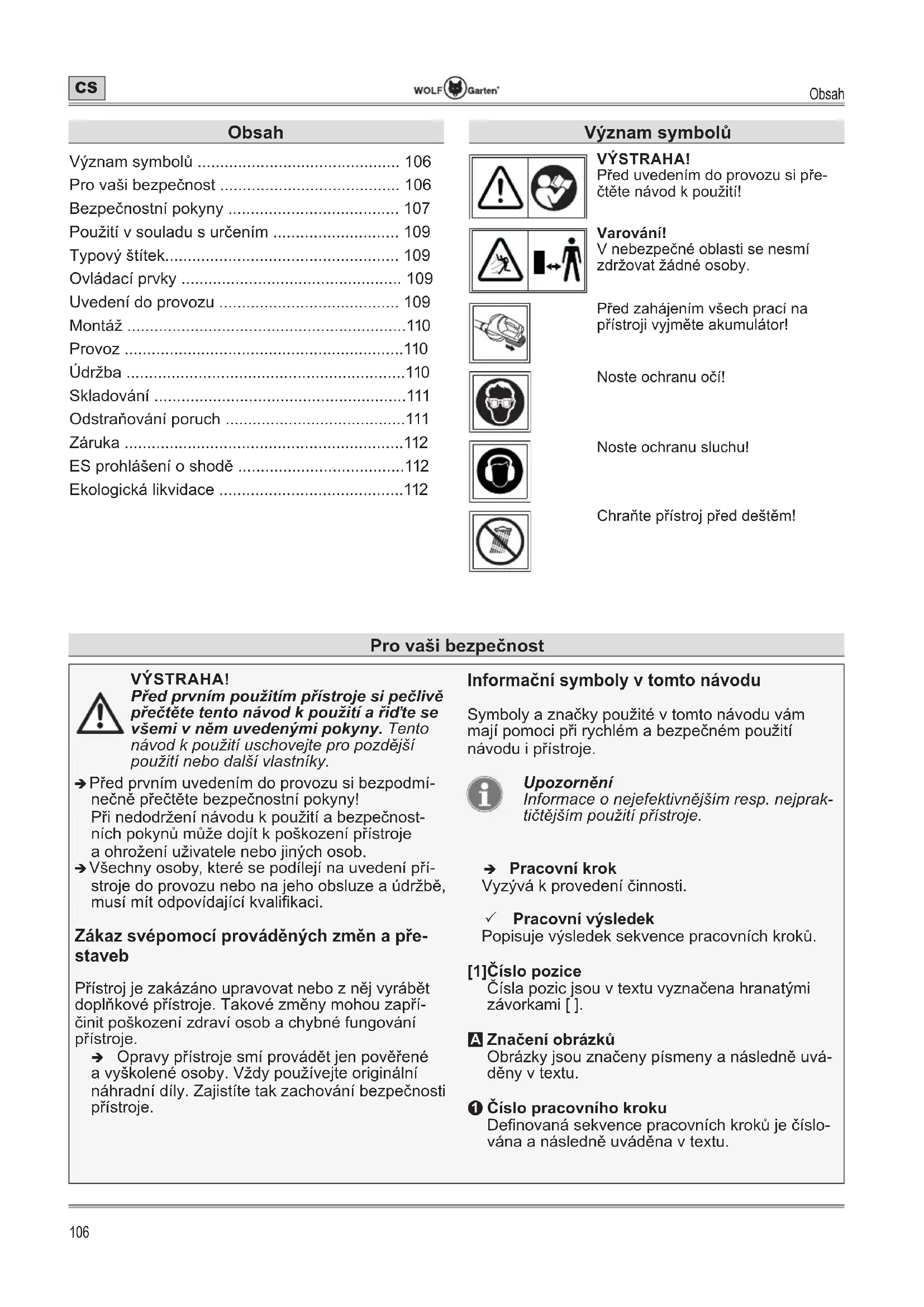 - Ekologická likvidace Pro vaši bezpečnost Význam symbolů VÝSTRAHA! Před uvedením do provozu si pře- čtěte návod k použití! Varování! V nebezpečné oblasti se nesmí zdržovat žádné osoby. Před zahájením všech prací na přístroji vyjměte akumulátor! Noste ochranu očí! Noste ochranu sluchu! Chraňte přístroj před deštěm!Bezpečnostní pokyny p. 112
