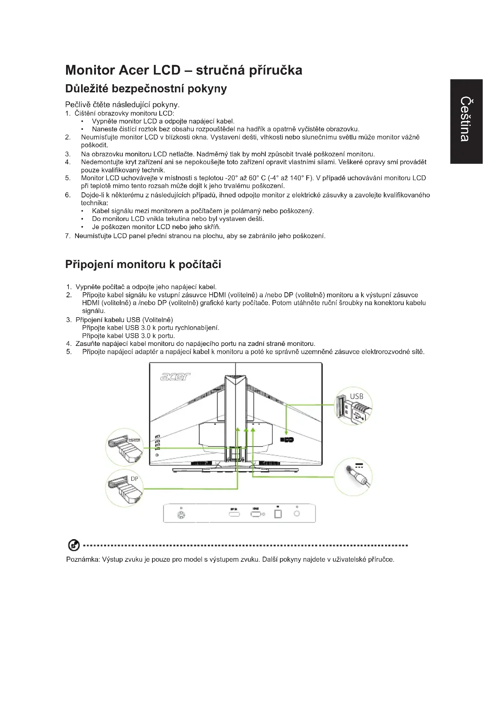 RežimZAPNUTO 45W (typ.) Režimspánku 0,5 W (typ.) Vypnuto/pohotovostní režim 0,45 W (typ.) Vstupní konektor DP (Pouze model DP) HDMI (pouze model HDMI) USBrozbočovač/USB3.0x4(pouzemodelsUSBrozbočovačem) Vstup videosignálu Signál DP (pouze model se vstupem DP) Signál HDMI (pouze model se vstupem HDMI) Reproduktory (typicky) 7 W x 2 Zvuk Výstupzvuku(pouzemodelsvýstupemzvuku) Maximální velikost obrazovky Horizontální: 697,344 mm Vertikální: 392,256 mm Zdroj napájení 100 - 240 V~, 50/60 Hz Parametryprostředí Provozníteplota:5°až35°C Skladovacíteplota:-20°až60°C Provoznívlhkost:10%až85% Rozměry 712,7(Š)x484~604(V)x298,3(H)mm Hmotnost(čistá) 10,1kgpřístroj(čistá) Mechanismus Náklon:-5°až+25° Otáčení:+/-25° Nastavenívýšky:120mm Otočenínavýšku:Ne Odnímatelná deska podstavce: Ano Externí ovládací prvky: Functions (Funkce) Jas Kontrast Modrésvětlo Posílení tmavé Adaptivní kontrast Gamma Teplota barev Sytost 6 osá barva Hlasitost Kompenzace doby odezvy Zaměřovacíterč Jazyk ČasovýlimitnabídkyOSD Průhlednost Obnovovací frekvence Vstup Okolnísvětlo Přiřazenírychlýchtlačítek Širokýrežim Hlubokýspánek Režimrychléhospuštění NabíjenízUSBportupřivypnutí Hernírežim *Změnyspecikacíbezpředchozíhoupozorněnívyhrazeny. PříručkyadalšídokumentacikproduktuAcervyhledejtenaociálnímwebupodporyspolečnostiAcer. *Ročníspotřebaenergiejevypočtenanazákladětypickéspotřebyenergie4hodinydenně,365dnívroce.Dansk Startvejledning til din Acer LCD-skærm Vigtige sikkerhedsinstruktioner Læs følgende instruktioner omhyggeligt.