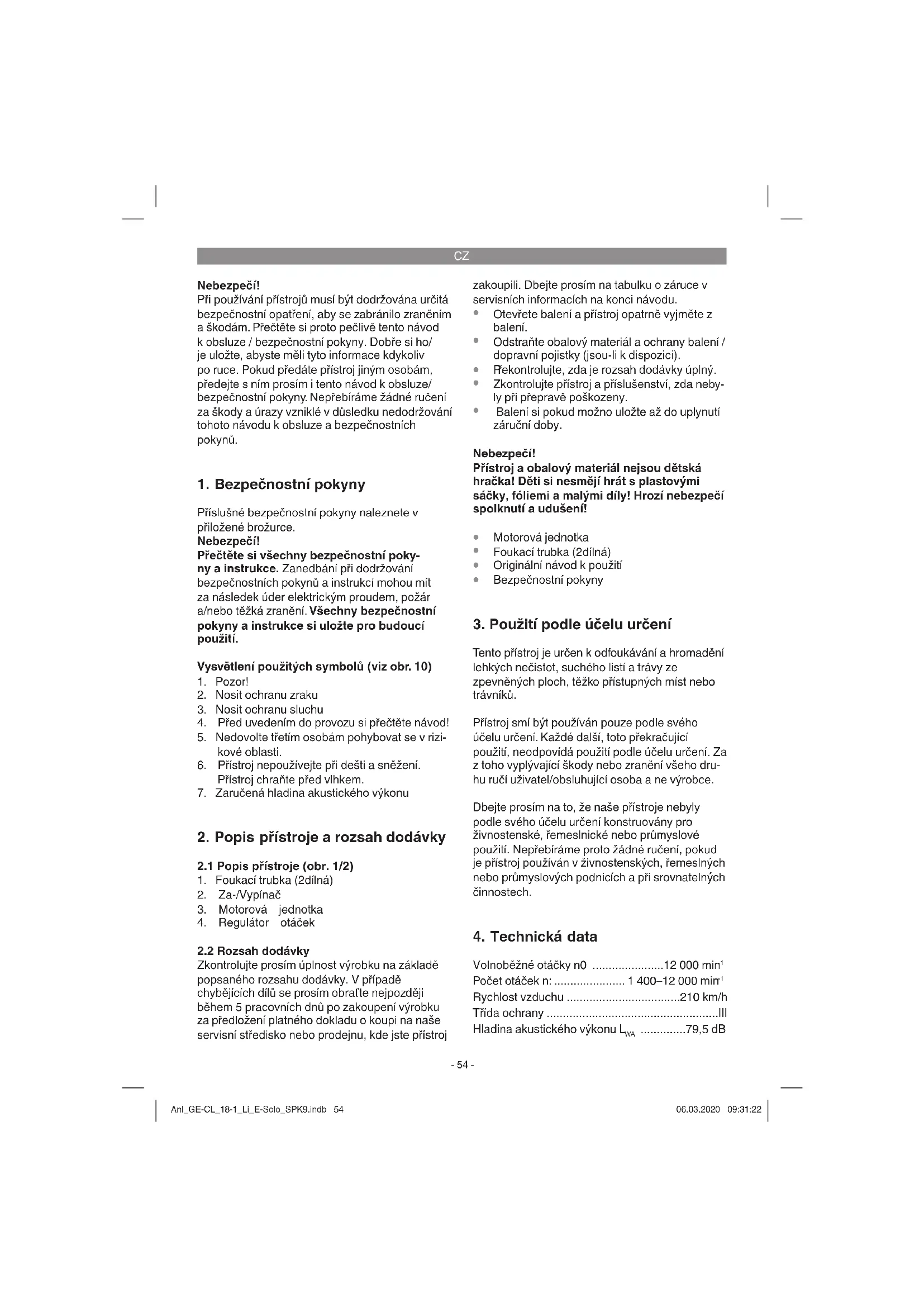 Stav indikace Význam a opatření Červená LED Zelená LED Vyp Bliká Provozní pohotovost Nabíječka je připojena na síť a připravena k provozu, akumulátor není v nabíječce. Zap vyp Nabíjení Nabíječka nabíjí akumulátor režimem rychlého nabíjení. Příslušné doby nabíjení najdete přímo na nabíječce. Upozornění! V závislosti na konkrétním stavu nabití se mohou skutečné doby nabíjení poněkud lišit od uvedených dob nabíjení. Vyp Zap Akumulátor je nabitý a připravený k provozu. Poté se až do úplného nabití přepne na úsporné nabíjení. Nechte akumulátor v nabíječce o cca 15 minut déle. Opatření: Vyjměte akumulátor z nabíječky. Odpojte nabíječku ze sítě. Bliká Vyp Přizpůsobené nabíjení Nabíječka se nachází v režimu šetrného nabíjení. Akumulátor je přitom z bezpečnostních důvodů nabíjen pomaleji a potřebuje více času. To může mít následující příčiny: - Akumátor nebyl již po dlouhou dobu nabíjen. - Teplota akumulátoru není v ideálním rozsahu. Opatření: Počkejte, až bude nabíjení ukonč eno, akumulátor může být i přesto dále nabíjen. Bliká Bliká Porucha Nabíjení již není možné. Akumulátor je defektní. Opatření: Defektní akumulátor se již nesmí nabíjet. Vyjměte akumulátor z nabíječky. Zap Zap Porucha teploty Akumulátor je příliš horký (např. přímé sluneční záření) nebo příliš studený (pod 0° C). Opatření: Odeberte akumulátor a uložte ho 1 den při pokojové teplotě (cca 20° C). Anl_GE-CL_18-1_Li_E-Solo_SPK9.indb 58Anl_GE-CL_18-1_Li_E-Solo_SPK9.indb 58 06.03.2020 09:31:2306.03.2020 09:31:23CZ