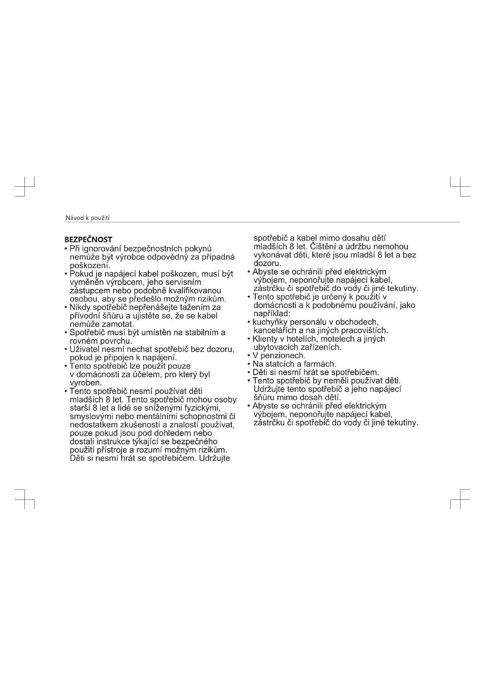 - Tento spotřebič nesmí používat děti mladších 8 let. Tento spotřebič mohou osoby starší 8 let a lidé se sníženými fyzickými, smyslovými nebo mentálními schopnostmi či nedostatkem zkušeností a znalostí používat, pouze pokud jsou pod dohledem nebo dostali instrukce týkající se bezpečného použití přístroje a rozumí možným rizikům. Děti si nesmí hrát se spotřebičem. Udržujte spotřebič a kabel mimo dosahu dětí mladších 8 let. Čištění a údržbu nemohou vykonávat děti, které jsou mladší 8 let a bez dozoru.