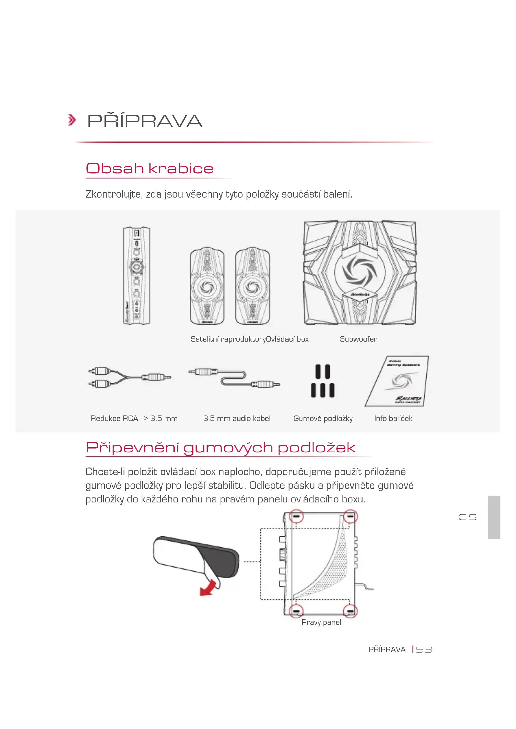 Pravý panel Gumové podložky PŘÍPRAVA Obsah krabice Zkontrolujte, zda jsou všechny tyto položky součástí balení. CS54 PŘÍPRAVA Ovládací box - přehled 1 Tlačítko napájení 10 Výstup pro mikorofon 2 Tlačítko "Nindža módu" 11 Aux-In vstup 3 Přepínač zdroje 12 Levý audio vstup 4 Regulátor hlasitosti 13 Pravý audio vstup 5 Regulátor výšek 14 Výstup pro levý reproduktor 6 Regulátor basů 15 Výstup pro pravý reproduktor 7 Výstup pro sluchátka 16 Výstup pro subwoofer 8 Vstup pro mikrofon 17 Vstup napájení AC 9 Line-in vstup