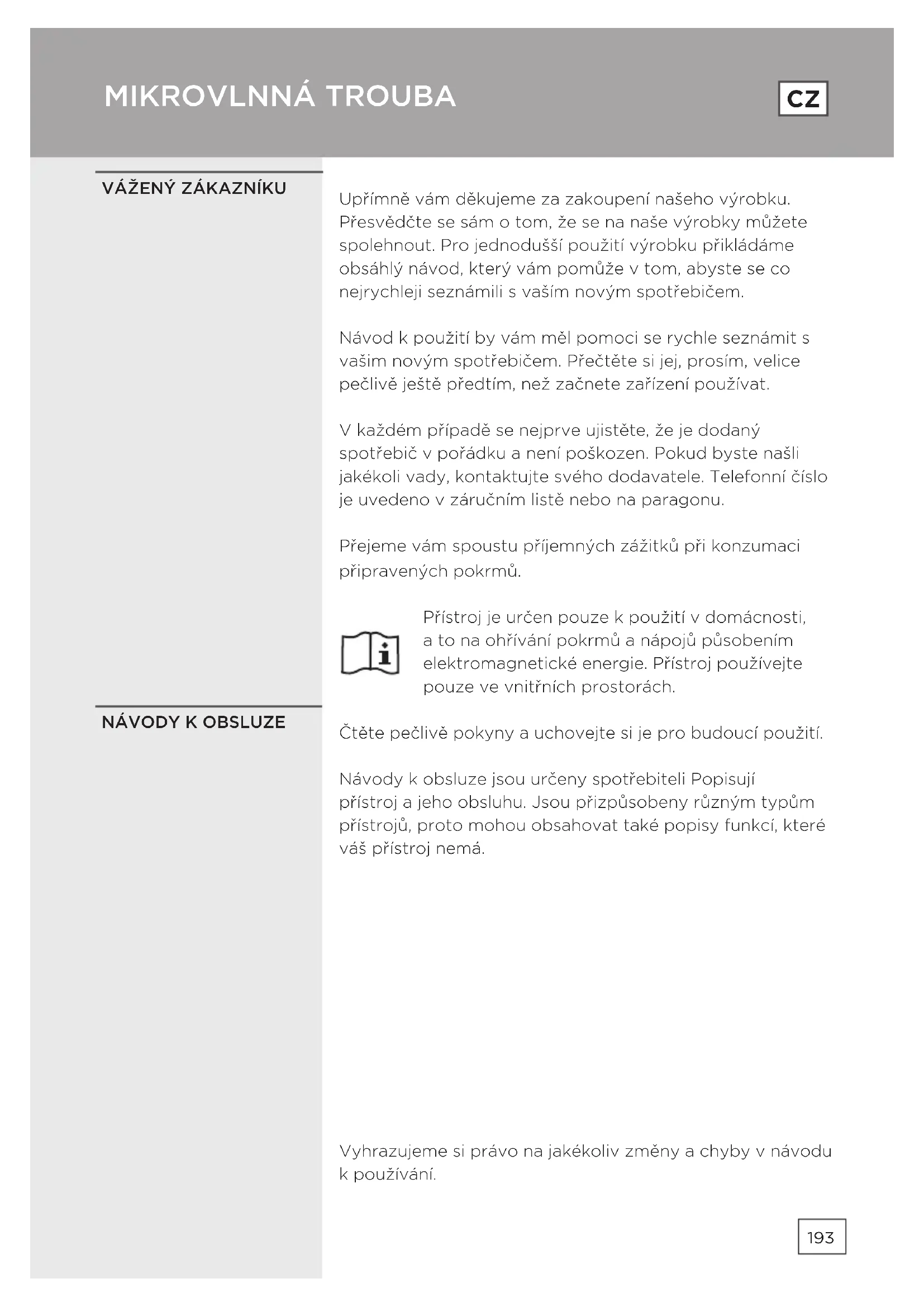 SKÔR AKO SA OBRÁTITE NA SERVIS193 Upřímně vám děkujeme za zakoupení našeho výrobku. Přesvědčte se sám o tom, že se na naše výrobky můžete spolehnout. Pro jednodušší použití výrobku přikládáme obsáhlý návod, který vám pomůže v tom, abyste se co nejrychleji seznámili s vaším novým spotřebičem. Návod k použití by vám měl pomoci se rychle seznámit s vašim novým spotřebičem. Přečtěte si jej, prosím, velice pečlivě ještě předtím, než začnete zařízení používat. V každém případě se nejprve ujistěte, že je dodaný spotřebič v pořádku a není poškozen. Pokud byste našli jakékoli vady, kontaktujte svého dodavatele. Telefonní číslo je uvedeno v záručním listě nebo na paragonu. Přejeme vám spoustu příjemných zážitků při konzumaci připravených pokrmů. Přístroj je určen pouze k použití v domácnosti, a to na ohřívání pokrmů a nápojů působením elektromagnetické energie. Přístroj používejte pouze ve vnitřních prostorách. Čtěte pečlivě pokyny a uchovejte si je pro budoucí použití. Návody k obsluze jsou určeny spotřebiteli Popisují přístroj a jeho obsluhu. Jsou přizpůsobeny různým typům přístrojů, proto mohou obsahovat také popisy funkcí, které váš přístroj nemá. Vyhrazujeme si právo na jakékoliv změny a chyby v návodu k používání.