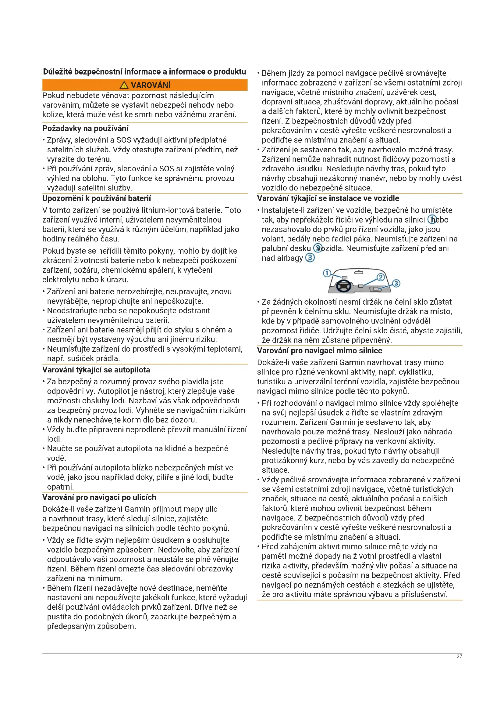 - Za žádných okolností nesmí držák na čelní sklo zůstat připevněn k čelnímu sklu. Neumisťujte držák na místo, kde by v případě samovolného uvolnění odváděl pozornost řidiče. Udržujte čelní sklo čisté, abyste zajistili, že držák na něm zůstane připevněný. Varování pro navigaci mimo silnice Dokáže-li vaše zařízení Garmin navrhovat trasy mimo silnice pro různé venkovní aktivity, např. cyklistiku, turistiku a univerzální terénní vozidla, zajistěte bezpečnou navigaci mimo silnice podle těchto pokynů.