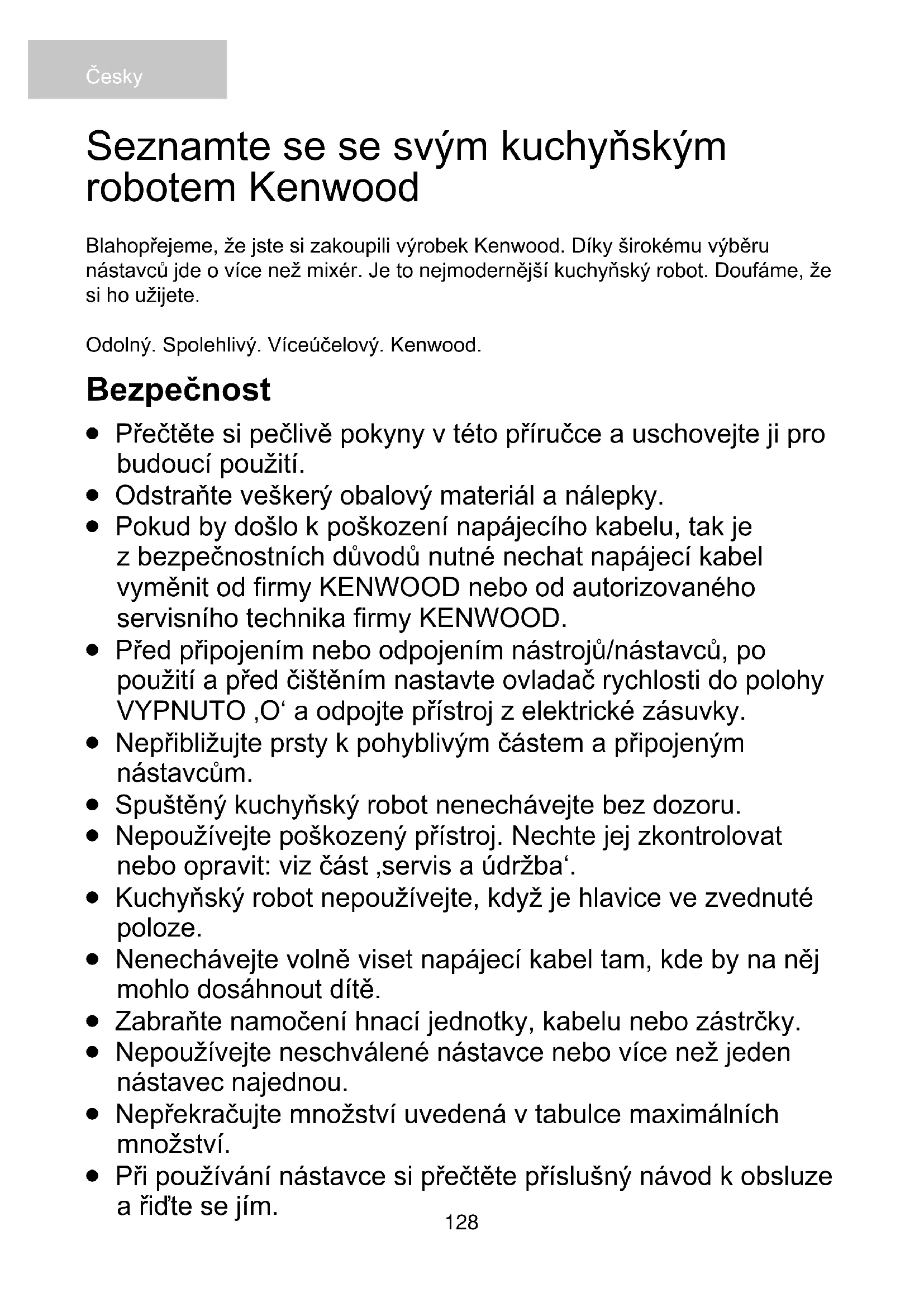 Pokud by došlo k poškození napájecího kabelu, tak je z bezpečnostních důvodů nutné nechat napájecí kabel vyměnit od firmy KENWOOD nebo od autorizovaného servisního technika firmy KENWOOD.