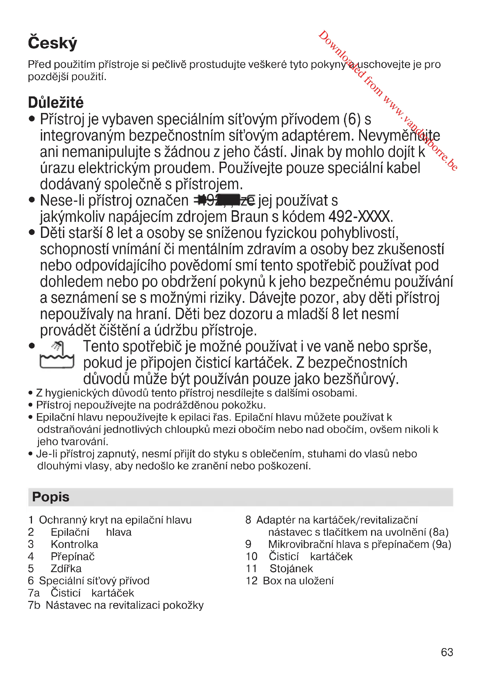 - Ke zklidnění pokožky ji po epilaci doporučujeme ošetřit zvlhčujícím krémem. První epilaci je vhodné provést večer, aby případné zarudnutí přes noc zmizelo. Obecné informace o epilaci Všechny způsoby odstraňování chloupků u kořínků mohou vést k podráždění pokožky (např. ke svědění, nepříjemným pocitům, zarudnutí) v závislosti na stavu pokožky a ochlupení. Jedná se o běžnou reakci, která by měla rychle odeznít. Po několika počátečních epilacích u kořínků nebo v případě citlivé pokožky však tato reakce může být výraznější. Reakce pokožky i bolestivost se s opakovaným používáním obvykle výrazně snižuje. Pokud je pokožka podrážděná i po uplynutí 36 hodin, doporučujeme vyhledat lékaře. K minimalizaci nebezpečí infekce nebo zanícení způsobeného pronikajícími bakteriemi (například při přejíždění přístrojem po pokožce) epilační hlavu i pokožku před použitím přístroje důkladně očistěte. V případě jakýchkoli pochybností ohledně používání tohoto přístroje se poraďte se svým lékařem. Předchozí konzultace s lékařem je nezbytná v případě osob, které trpí následujícími onemocněními či problémy: ekzémy, poraněními, zanícením pokožky, jako je folikulitida (zánět vlasových folikulů) a křečovými žílami, pigmentovými skvrnami, sníženou odolností pokožky (provázející např. diabetes mellitus), Raynaudovou nemocí, Koebnerovým fenoménem, hemofilií nebo imunitní nedostatečností. Zahájení hormonální léčby nebo změna typu hormonální léčby (např. antikoncepce) může vzhledem ke změně hladiny hormonů v krvi ovlivnit růst vašich vlasů a ochlupení. Je to způsobeno změnou hladiny hormonů, nikoli přístrojem. Používání čisticího kartáčku (za mokra i za sucha) Vysuňte hlavu epilátoru, připojte k ní adaptér na kartáček (8) a nacvakněte čisticí kartáček (7a) nebo nástavec na revitalizaci pokožky (7b). Toto příslušenství používejte v rámci každodenního čistění pleti s vodou, mýdlem, pleťovou vodou, čisticím mlékem, gelem nebo tělovým peelingem. Nástavec na revitalizaci pokožky navíc poskytuje intenzivní masáž pro zkrášlení pokožky. Veďte kartáček / revitalizační nástavec krouživými pohyby za vyvinutí mírného tlaku. Vyhněte se oblasti očí a linii vlasů. Použití mikrovibrační hlavy Připojte mikrovibrační hlavu (9). Můžete zvolit jemný nebo intenzivní režim, a to přepnutím přepínače (9a) doleva nebo doprava. Každý režim lze používat s rychlostí 1 nebo 2. 91474612_FaceSpa_Pro_910-911-912-913_921_EURO_S4-122.indd 6591474612_FaceSpa_Pro_910-911-912-913_921_EURO_S4-122.indd 65 17.08.17 15:1517.08.17 15:15 CSS APPROVED Effective Date 18Aug2017 GMT - Printed 17Oct2017 Page 65 of 122 Downloaded from www.vandenborre.be66 Mikrovibrační hlavu doporučujeme používat pro aplikaci tekutých produktů péče o pokožku. Jemné poklepávání zajistí efektivní a úspornou aplikaci vašeho přípravku péče o pokožku. Pomalu pohybujte s mikrovibrační hlavou přes tři oblasti obličeje (20 vteřin na každou oblast). Čištění a údržba Po použití přístroj vyčistěte: Mikrovibrační hlava (9): K čištění používejte vlhký hadřík. Nečistěte hlavu pod vodou. Epilační hlava (2): K vyčištění pinzet použijte přiložený kartáček (10). Kartáček můžete namočit v etanolu (70 %). Nečistěte epilační hlavu pod vodou. Čisticí kartáček/nástavec na revitalizaci (7,8): Pouze toto příslušenství lze omývat pod tekoucí vodou. Pokud je chcete důkladně vyčistit mýdlem a teplou vodou, můžete kartáček/nástavec (7a/b) stisknutím uvolňovacího tlačítka (8a) sejmout. Po čištění nechte všechny části uschnout, než je znovu nasadíte. K dosažení těch nejlepších výsledků kartáček/nástavec (7a/b) vyměňujte každé tři měsíce nebo jakmile budou štětinky vzhledem k častému používání deformované. Celou řadu náhradních kartáčků (ref. č. 80 obličejový) získáte u prodejce, v servisních střediscích Braun nebo prostřednictvím stránek www.braun.com. Poznámka k ochraně životního prostředí Výrobek obsahuje akumulátory nebo recyklovatelný elektrický odpad. Chraňte životní prostředí, nevyhazujte přístroj do směsného komunálního odpadu, ale předejte jej k recyklaci na příslušné sběrné místo ve své zemi. Deklarovaná hodnota emise hluku tohoto spotřebiče je 62 dB(A), což představuje hladinu A akustického výkonu vzhledem na referenční akustický výkon 1 pW. Může se bez upozornění měnit. Záruka Poskytujeme dvouletou záruku na výrobek s platností od data jeho zakoupení. V záruční lhůtě bezplatně odstraníme všechny vady přístroje zapříčiněné chybou materiálu nebo výroby, a to buď formou opravy, nebo výměnou celého přístroje (podle našeho vlastního uvážení). Uvedená záruka je platná v každé zemi, ve které tento přístroj dodává společnost Braun nebo její pověřený distributor. Záruka se netýká následujících případů: poškození zapříčiněné nesprávným použitím, běžné opotřebování (například plátků holicího strojku nebo pouzdra zastřihovače), jakož i vady, které mají zanedbatelný dosah na hodnotu nebo funkci přístroje. Pokud opravu uskuteční neautorizovaná osoba a nebudou-li použity původní náhradní díly společnosti Braun, platnost záruky bude ukončena. Pokud v záruční lhůtě požadujete provedení servisní opravy, odevzdejte celý přístroj s potvrzením o nákupu v autorizovaném servisním středisku společnosti Braun nebo jej do střediska zašlete. 91474612_FaceSpa_Pro_910-911-912-913_921_EURO_S4-122.indd 6691474612_FaceSpa_Pro_910-911-912-913_921_EURO_S4-122.indd 66 17.08.17 15:1517.08.17 15:15 CSS APPROVED Effective Date 18Aug201