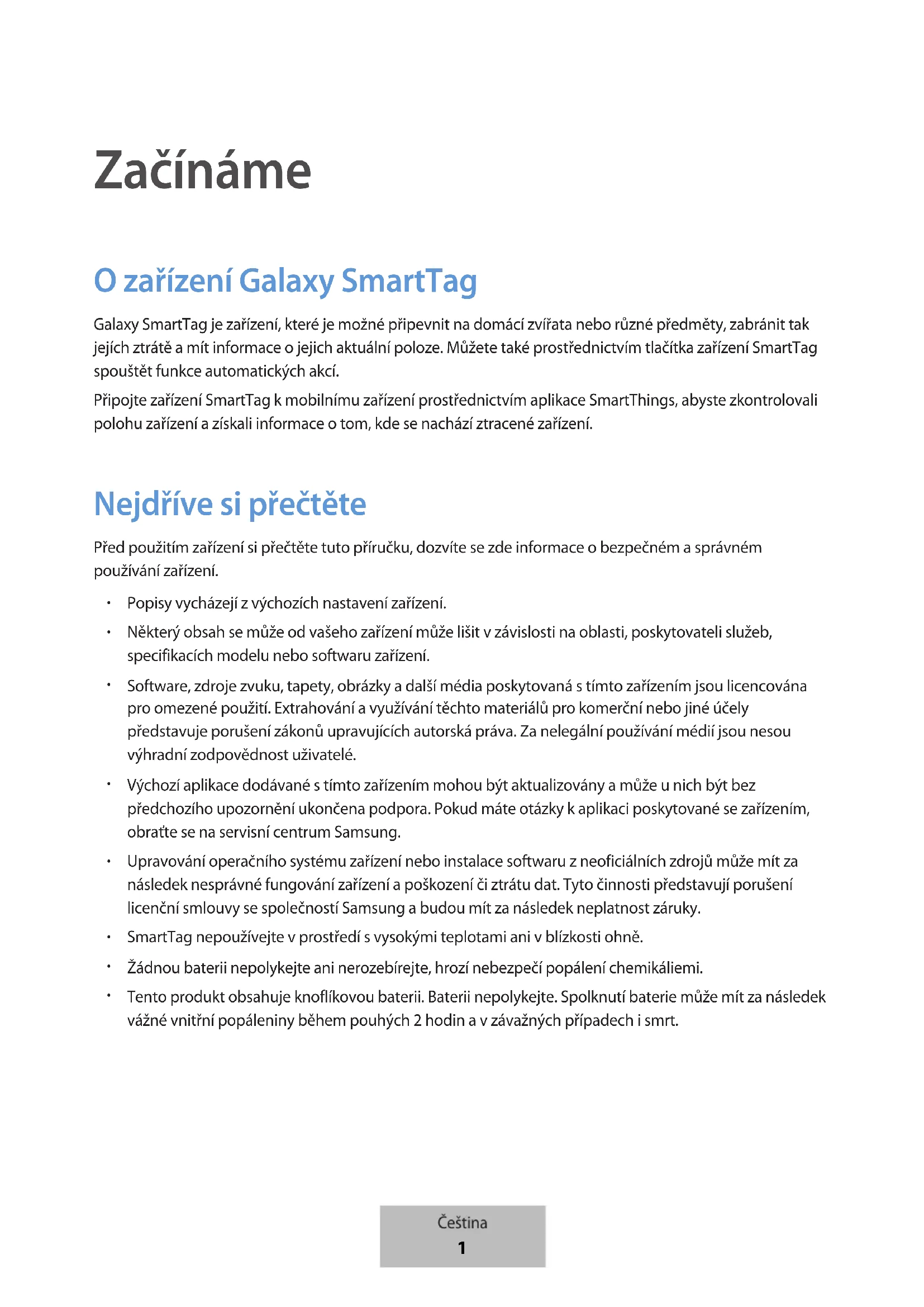Začínáme Ozařízení Galaxy SmartTag Galaxy SmartTag je zařízení, které je možné připevnit na domácí zvířata nebo různé předměty, zabránit tak jejích ztrátě amít informace ojejich aktuální poloze. Můžete také prostřednictvím tlačítka zařízení SmartTag spouštět funkce automatických akcí. Připojte zařízení SmartTag kmobilnímu zařízení prostřednictvím aplikace SmartThings, abyste zkontrolovali polohu zařízení a získali informace otom, kde se nachází ztracené zařízení. Nejdříve si přečtěte Před použitím zařízení si přečtěte tuto příručku, dozvíte se zde informace o bezpečném a správném používání zařízení.