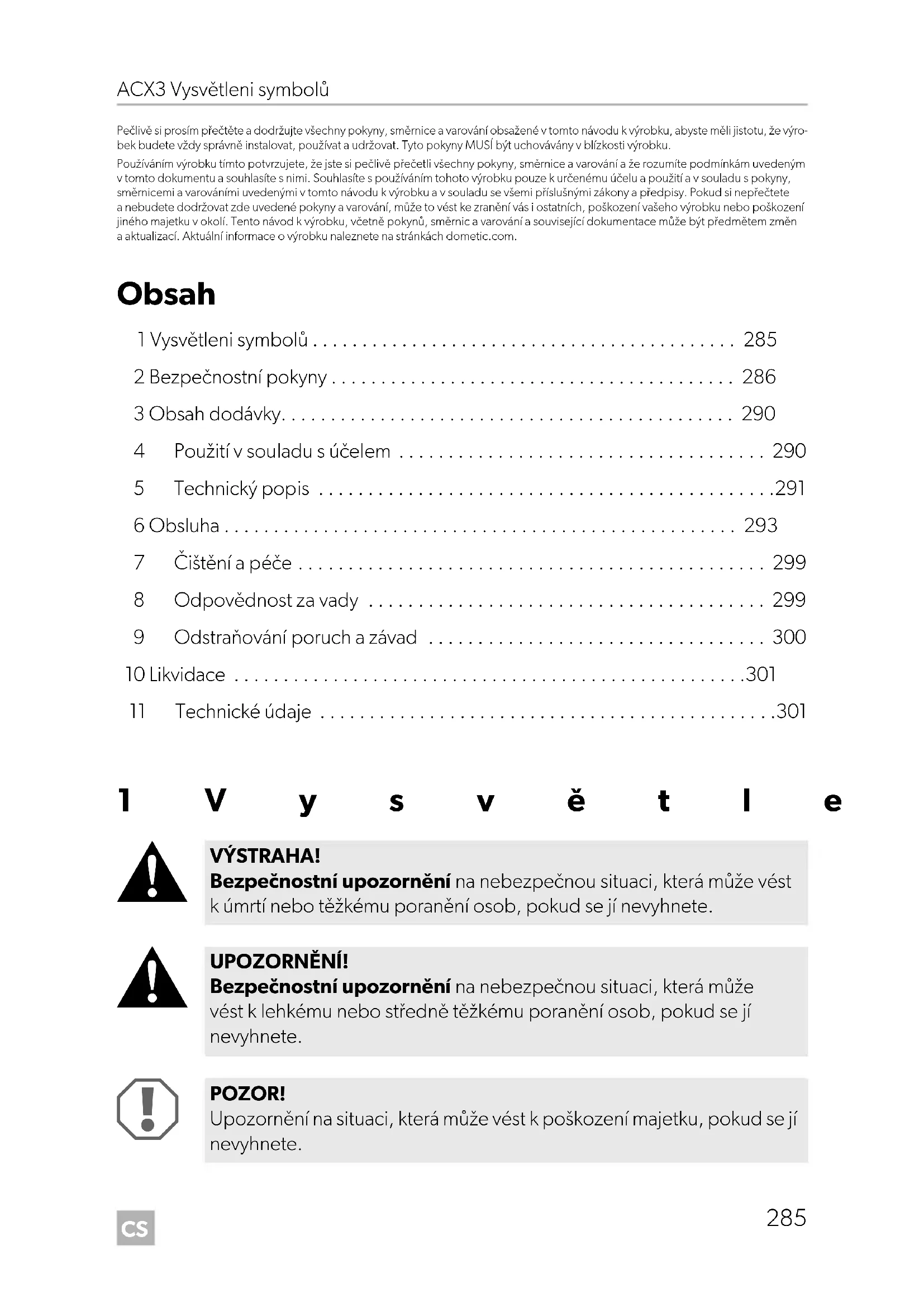 VÝSTRAHA! Bezpečnostní upozornění na nebezpečnou situaci, která může vést k úmrtí nebo těžkému poranění osob, pokud se jí nevyhnete. UPOZORNĚNÍ! Bezpečnostní upozornění na nebezpečnou situaci, která může vést k lehkému nebo středně těžkému poranění osob, pokud se jí nevyhnete. POZOR! Upozornění na situaci, která může vést k poškození majetku, pokud se jí nevyhnete. DometicACX3_30-ACX3_40-ACX3_40G_OPM_4445103211_EMEA16_202x-xx-xx.book Seite 285 Donnerstag, 15. Juli 2021 5:12 17CS Bezpečnostní pokyny ACX3