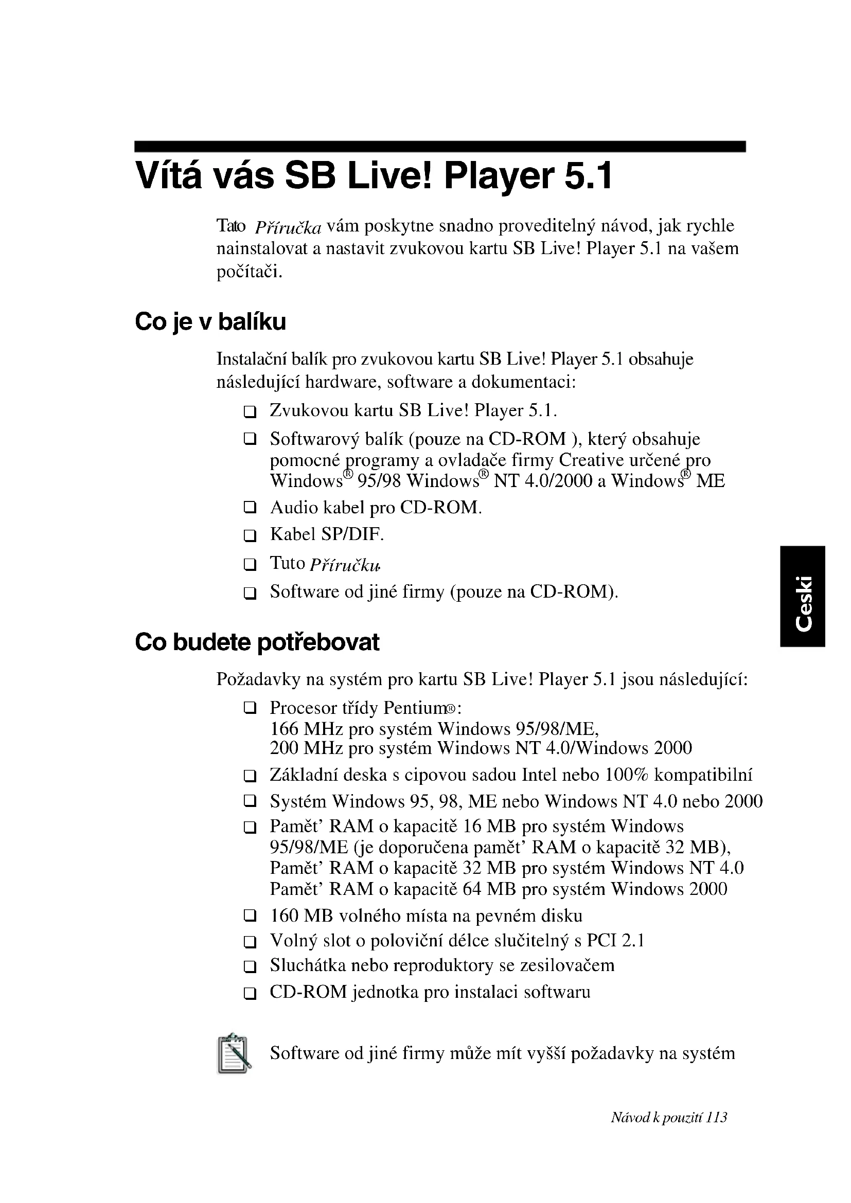 Software od jiné firmy (pouze na CD-ROM). Co budete potøebovat Poadavky na systém pro kartu SB Live! Player 5.1 jsou následující: