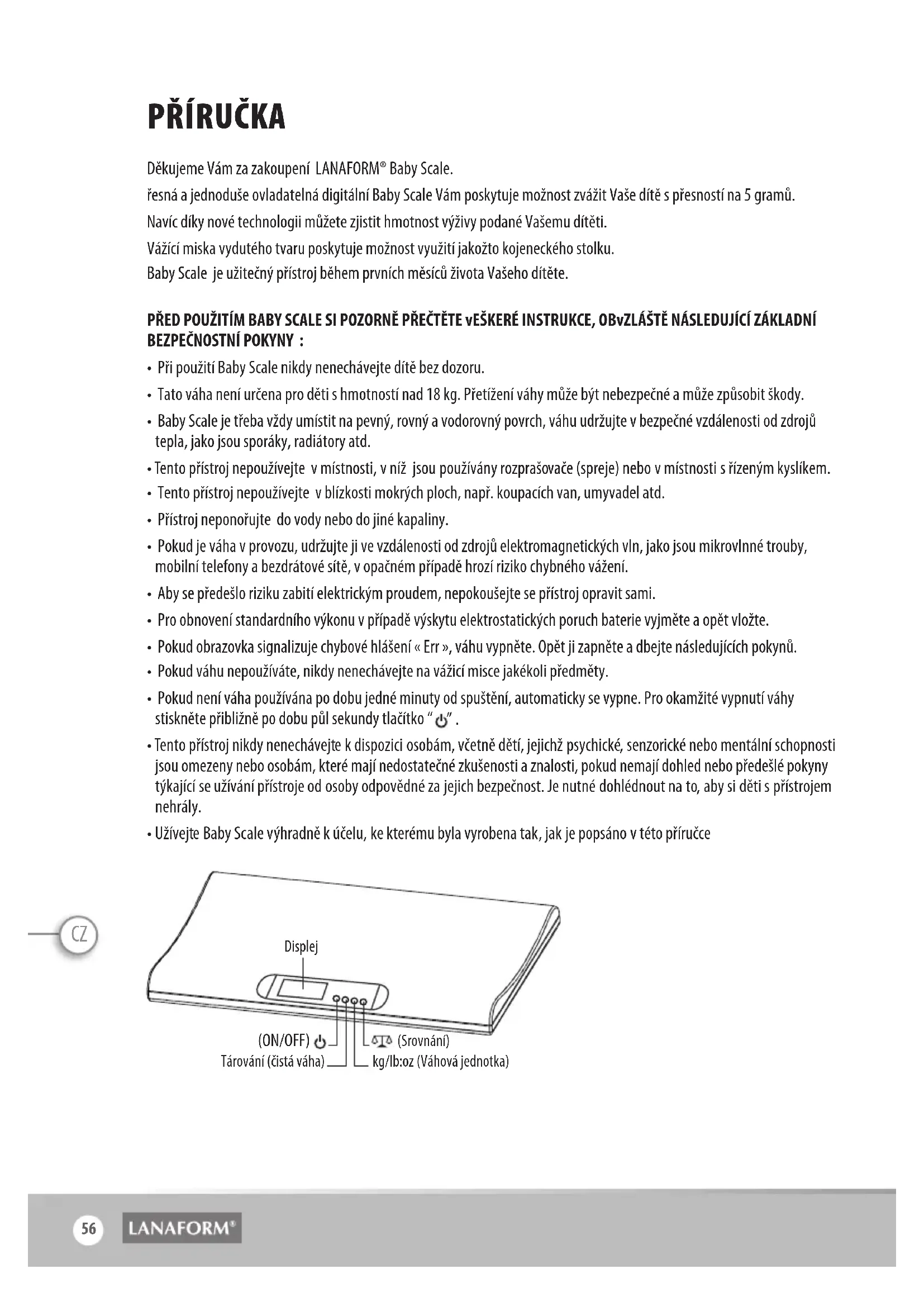 Hold Baby Scale 55CZ PŘÍruČKa Děkujeme Vám za zakoupení LANAFORM® Baby Scale. řesná a jednoduše ovladatelná digitální Baby Scale Vám poskytuje možnost zvážit Vaše dítě s přesností na 5 gramů. Navíc díky nové technologii můžete zjistit hmotnost výživy podané Vašemu dítěti. Vážící miska vydutého tvaru poskytuje možnost využití jakožto kojeneckého stolku. Baby Scale je užitečný přístroj během prvních měsíců života Vašeho dítěte. PŘED POUŽITÍM BABY SCALE SI POZORNĚ PŘEČTĚTE vEŠKERÉ INSTRUKCE, OBvZLÁŠTĚ NÁSLEDUJÍCÍ ZÁKLADNÍ BEZPEČNOSTNÍ POKYNY :