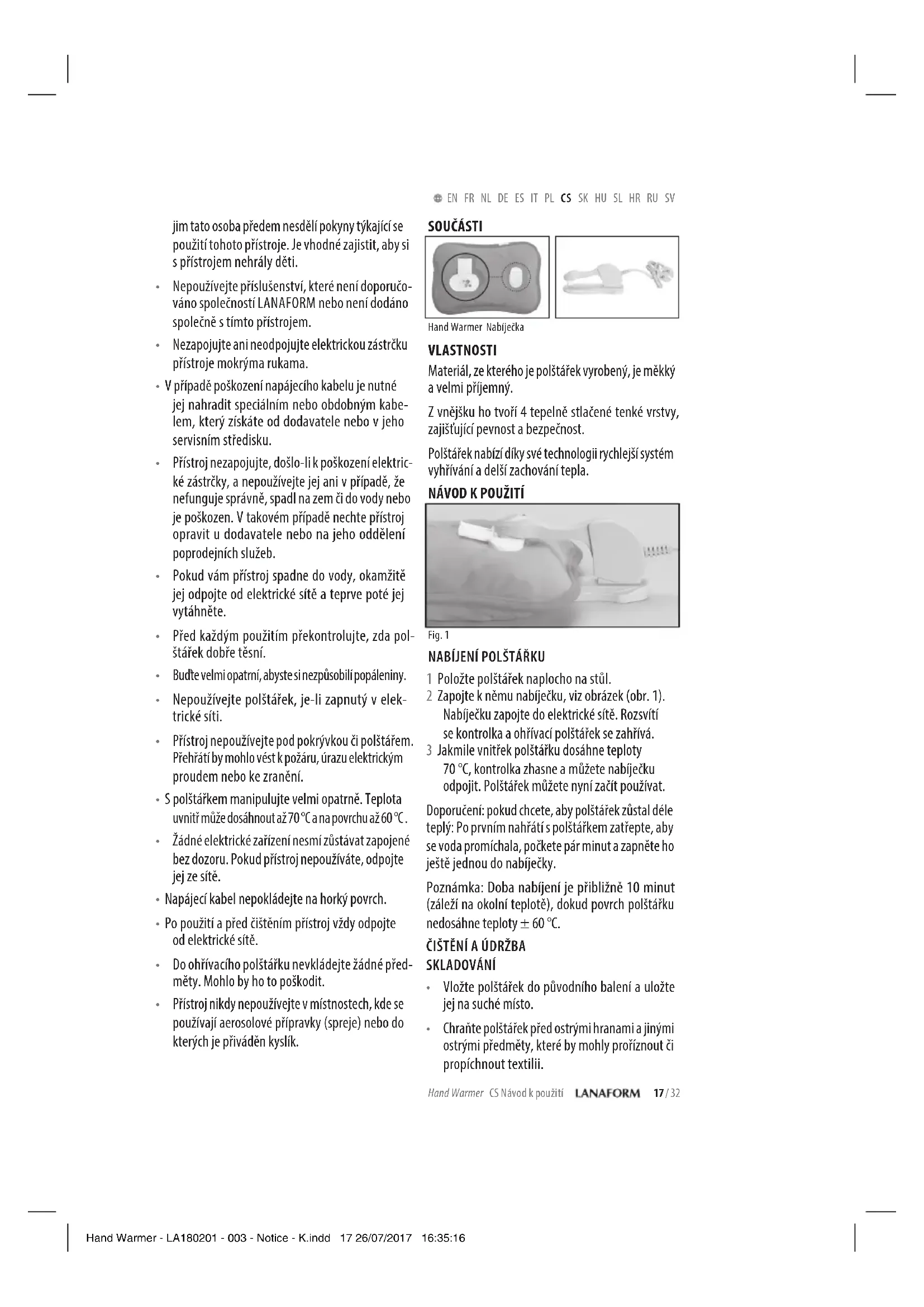 Chraňte polštářek před ostrými hranami a jinými ostrými předměty, které by mohly proříznout či propíchnout textilii. Hand Warmer - LA180201 - 003 - Notice - K.indd 17 26/07/2017 16:35:1618 / 32 Hand Warmer SK Návod na Použitie EN FR NL DE ES IT PL CS SK HU SL HR RU SV