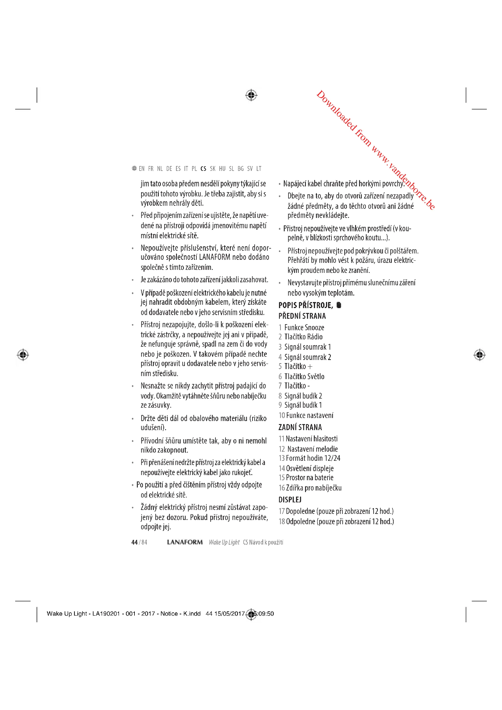 1 Funkce Snooze 2 Tlačítko Rádio 3 Signál soumrak 1 4 Signál soumrak 2 5 Tlačítko + 6 Tlačítko Světlo 7 Tlačítko - 8 Signál budík 2 9 Signál budík 1 10 Funkce nastavení ZADNÍ STRANA 11 Nastavení hlasitosti 12 Nastavení melodie 13 Formát hodin 12/24 14 Osvětlení displeje 15 Prostor na baterie 16 Zdířka pro nabíječku DISPLEJ 17 Dopoledne (pouze při zobrazení 12 hod.) 18 Odpoledne (pouze při zobrazení 12 hod.) Wake Up Light - LA190201 - 001 - 2017 - Notice - K.indd 44 15/05/2017 15:09:50 Downloaded from www.vandenborre.beWake Up Light CS Návod k použití 45 / 84 EN FR NL DE ES IT PL CS SK HU SL BG SV LT 19 Signál soumrak 1 20 Signál soumrak 2 21 Signál budík 1 22 Signál budík 2 23 Zobrazení času/rozhlasové stanice