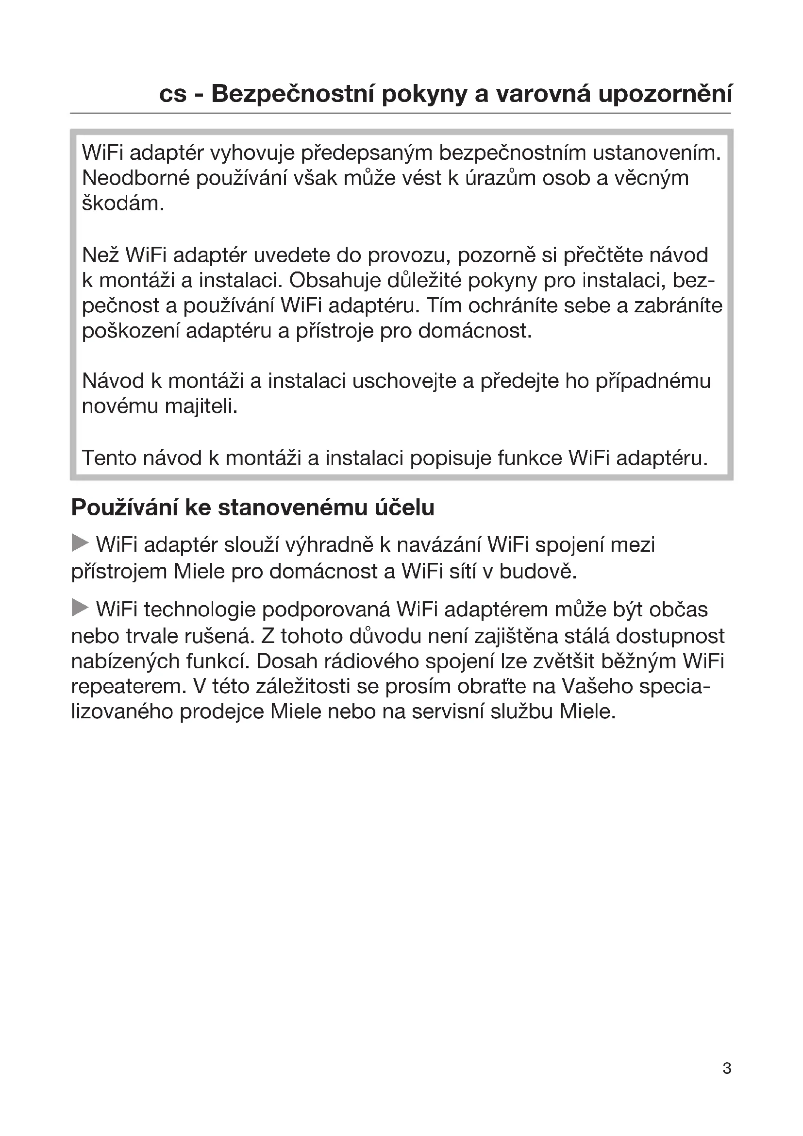 WiFi adaptér vyhovuje předepsaným bezpečnostním ustanovením. Neodborné používání však může vést kúrazům osob a věcným škodám. Než WiFi adaptér uvedete do provozu, pozorně si přečtěte návod kmontáži a instalaci. Obsahuje důležité pokyny pro instalaci, bez- pečnost a používání WiFi adaptéru. Tím ochráníte sebe a zabráníte poškození adaptéru a přístroje pro domácnost. Návod kmontáži a instalaci uschovejte a předejte ho případnému novému majiteli. Tento návod kmontáži a instalaci popisuje funkce WiFi adaptéru. Používání ke stanovenému účelu WiFi adaptér slouží výhradně knavázání WiFi spojení mezi přístrojem Miele pro domácnost a WiFi sítí vbudově. WiFi technologie podporovaná WiFi adaptérem může být občas nebo trvale rušená. Ztohoto důvodu není zajištěna stálá dostupnost nabízených funkcí. Dosah rádiového spojení lze zvětšit běžným WiFi repeaterem. Vtéto záležitosti se prosím obraťte na Vašeho specia- lizovaného prodejce Miele nebo na servisní službu Miele.cs - Bezpečnostní pokyny a varovná upozornění