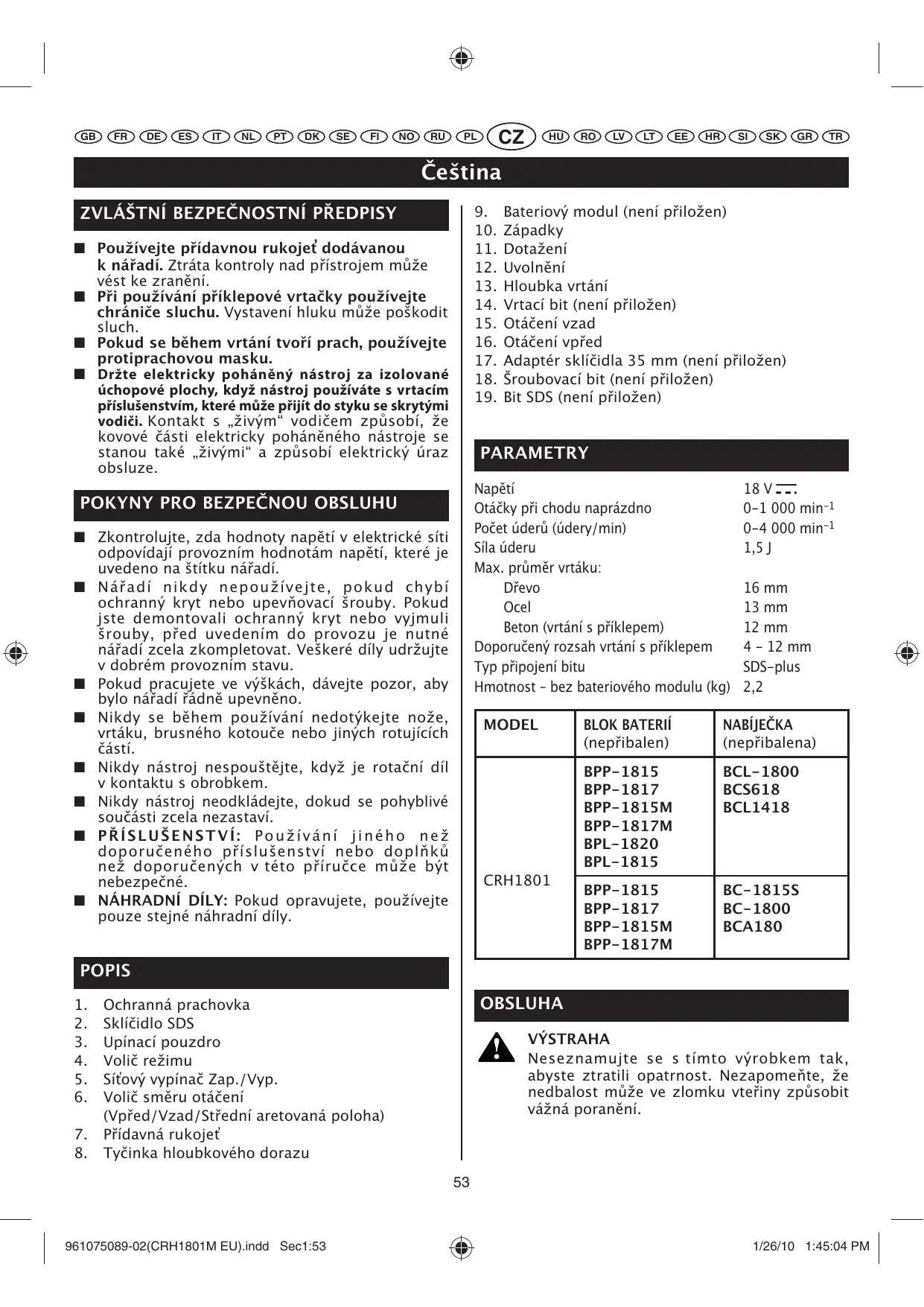 CRH1801 - Elektrické nářadí RYOBI - Bezplatný návod k obsluze