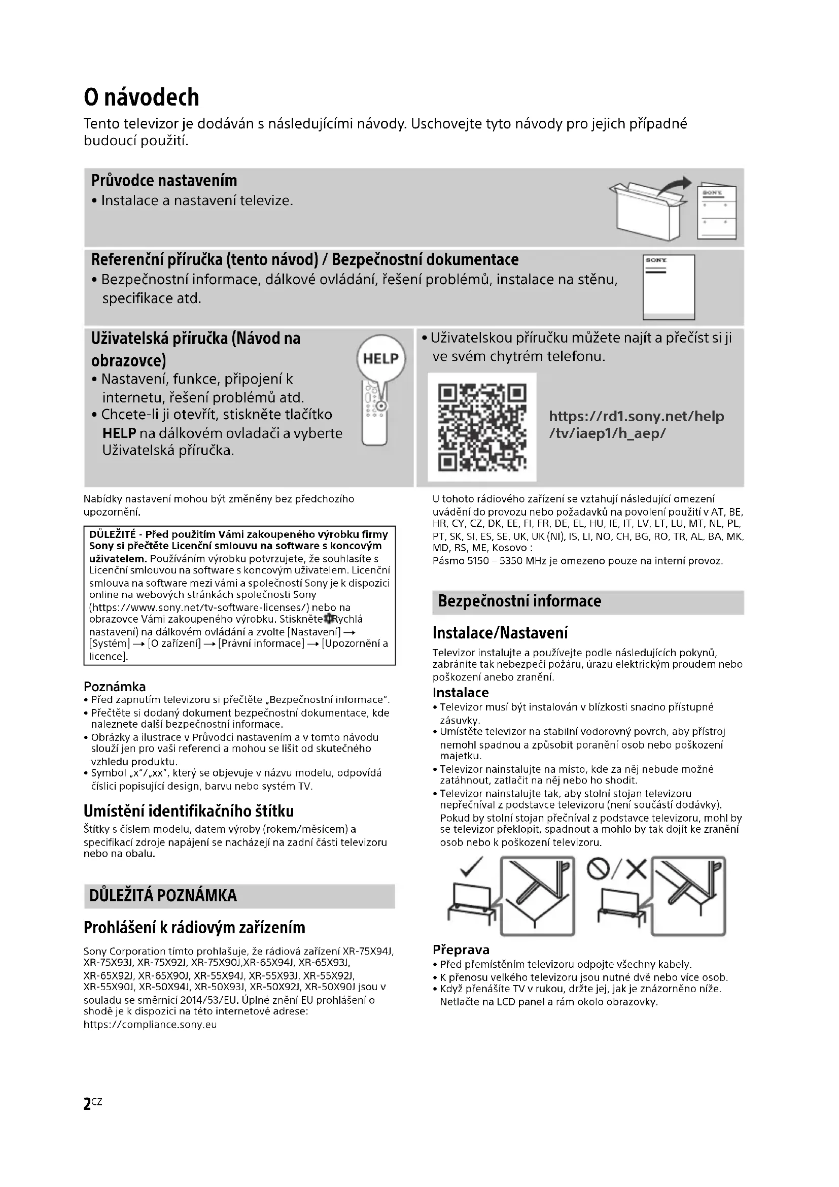 Prohlášení k rádiovým zařízením Sony Corporation tímto prohlašuje, že rádiová zařízení XR-75X94J, XR-75X93J, XR-75X92J, XR-75X90J,XR-65X94J, XR-65X93J, XR-65X92J, XR-65X90J, XR-55X94J, XR-55X93J, XR-55X92J, XR-55X90J, XR-50X94J, XR-50X93J, XR-50X92J, XR-50X90J jsou v souladu se směrnicí 2014/53/EU. Úplné znění EU prohlášení o shodě je k dispozici na této internetové adrese: https://compliance.sony.euU tohoto rádiového zařízení se vztahují následující omezení uvádění do provozu nebo požadavků na povolení použití v AT, BE, HR, CY, CZ, DK, EE, FI, FR, DE, EL, HU, IE, IT, LV, LT, LU, MT, NL, PL, PT, SK, SI, ES, SE, UK, UK (NI), IS, LI, NO, CH, BG, RO, TR, AL, BA, MK, MD, RS, ME, Kosovo :Pásmo 5150 – 5350 MHz je omezeno pouze na interní provoz. Bezpečnostní informace Instalace/Nastavení Televizor instalujte a používejte podle následujících pokynů, zabráníte tak nebezpečí požáru, úrazu elektrickým proudem nebo poškození anebo zranění. Instalace