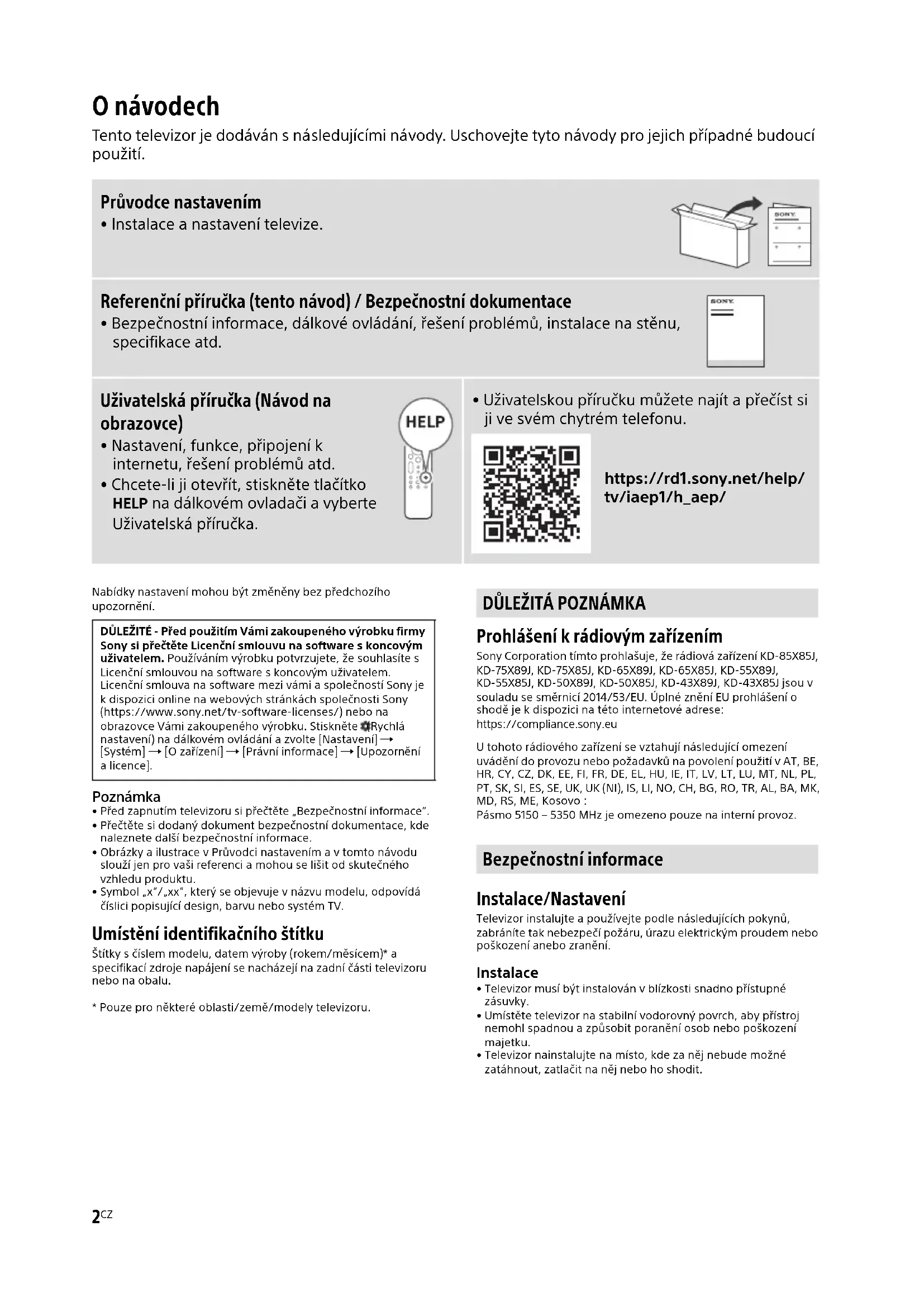 - Pouze pro některé oblasti/země/modely televizoru. Prohlášení k rádiovým zařízením Sony Corporation tímto prohlašuje, že rádiová zařízení KD-85X85J, KD-75X89J, KD-75X85J, KD-65X89J, KD-65X85J, KD-55X89J, KD-55X85J, KD-50X89J, KD-50X85J, KD-43X89J, KD-43X85J jsou v souladu se směrnicí 2014/53/EU. Úplné znění EU prohlášení o shodě je k dispozici na této internetové adrese: https://compliance.sony.eu U tohoto rádiového zařízení se vztahují následující omezení uvádění do provozu nebo požadavků na povolení použití v AT, BE, HR, CY, CZ, DK, EE, FI, FR, DE, EL, HU, IE, IT, LV, LT, LU, MT, NL, PL, PT, SK, SI, ES, SE, UK, UK (NI), IS, LI, NO, CH, BG, RO, TR, AL, BA, MK, MD, RS, ME, Kosovo : Pásmo 5150 – 5350 MHz je omezeno pouze na interní provoz. Instalace/Nastavení Televizor instalujte a používejte podle následujících pokynů, zabráníte tak nebezpečí požáru, úrazu elektrickým proudem nebo poškození anebo zranění. Instalace