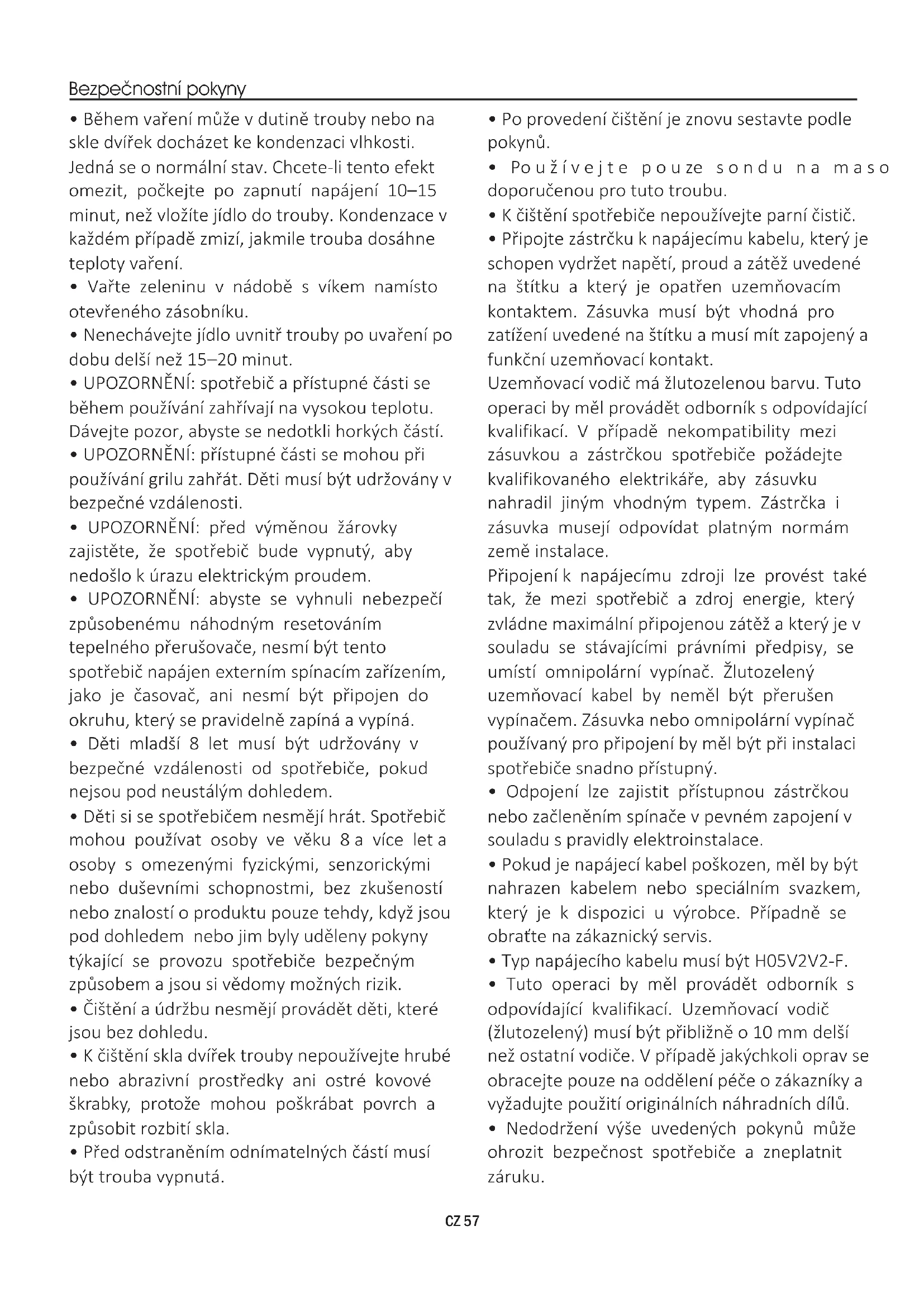 CZ 60 Používejte troubu pouze ke stanovenému účelu, kterým je pečení potravin; jakékoliv jiné použití, například jako zdroj tepla, je považováno za nevhodné a proto nebezpečné. Výrobce nemůže nést odpovědnost za případné škody vzniklé nesprávným či nevhodným používáním. Použití jakéhokoliv elektrického spotřebiče předpokládá dodržování některých základních pravidel: - Neodpojujte napájecí kabel ze zásuvky taháním; - Nedotýkejte se spotřebiče mokrýma nebo vlhkýma rukama či nohama; - Použití adaptérů, rozdvojek a prodlužovacích kabelů není zásadně doporučeno; - V případě selhání nebo a/nebo špatné funkce vypněte spotřebič a nemanipulujte s ním. ZAJISTĚTE, ABY ELEKTRICKÁ ZAPOJENÍ PROVÁDĚL ELEKTRIKÁŘ NEBO KVALIFIKOVANÝ TECHNIK. Napájecí zdroj, ke kterému je trouba připojena, musí být v souladu s právními předpisy platnými v zemi instalace. Výrobce nenese žádnou zodpovědnost za případné škody způsobené nedodržením těchto pokynů. Trouba musí být připojena k elektrické síti prostřednictvím uzemněné zásuvky nebo odpojovače s více póly, v závislosti na právních předpisech platných v zemi instalace. Elektrické napájení je třeba chránit vhodnými pojistkami a použité kabely musístit správné napájení trouby. ZAPOJENÍ Trouba je dodávána s napájecím kabelem, který by měl být připojen pouze k elektrickému zdroji s 220–240 V AC 50 Hz mezi fázemi nebo mezi fází a nulovým vodičem. Pře připojením trouby k elektrické síti je důležité zkontrolovat: - Napájecí napětí uvedené na voltmetru; - Nastavení odpojovače. Uzemňovací vodič připojený k zemnicí svorce trouby musí být připojen k zemnící svorce napájecího zdroje. VAROVÁNÍ Před připojením trouby k elektrické síti požádejte kvalifikovaného elektrikáře o kontrolu spojitosti zemnicí svorky elektrického napájení. Výrobce nenese žádnou odpovědnost za nehody nebo jiné problémy způsobené nepřipojením trouby k zemnící svorce nebo uzemněním, které má vadnou spojitost. POZNÁMKA: protože trouba může vyžadovat údržbu, je vhodné mít k dispozici další elektrickou zásuvku, ke které lze troubu připojit po vyjmutí z prostoru, ve kterém je nainstalována. Napájecí kabel smí být nahrazen pouze servisním technikem nebo technikem s rovnocennou kvalifikací.