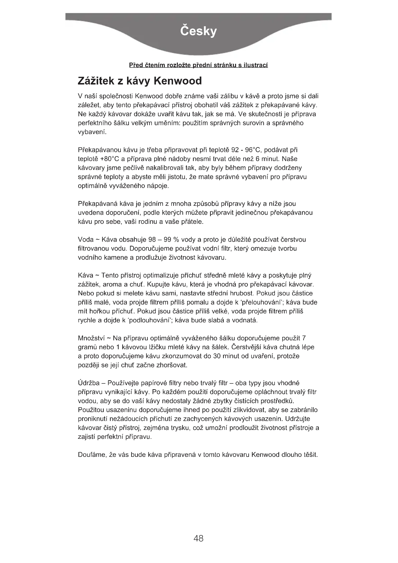 İÇİN ÖNEMLİ BİLGİ. Kullanım ömrünün sonunda ürün evsel atıklarla birlikte atılmamalıdır. Ürün yerel yetkililerce belirlenmiş atık toplama merkezine veya bu hizmeti sağlayan bir satıcıya götürülmelidir. Ev aletlerinin ayrı bir şekilde atılması çevre üzerindeki olası negatif etkileri azaltır ve aynı zamanda mümkün olan malzemelerin geri dönüşümünü sağlayarak önemli enerji ve kaynak tasarrufu sağlar. Ev aletlerinin ayrı olarak atılması gerekliliğini hatırlatmak amacıyla üzeri çarpı ile işaretlenmiş çöp kutusu resmi kullanılmıştır. 47Zážitek z kávy Kenwood V naší společnosti Kenwood dobře známe vaši zálibu v kávě a proto jsme si dali záležet, aby tento překapávací přístroj obohatil váš zážitek z překapávané kávy. Ne každý kávovar dokáže uvařit kávu tak, jak se má. Ve skutečnosti je příprava perfektního šálku velkým uměním: použitím správných surovin a správného vybavení. Překapávanou kávu je třeba připravovat při teplotě 92 - 96°C, podávat při teplotě +80°C a příprava plné nádoby nesmí trvat déle než 6 minut. Naše kávovary jsme pečlivě nakalibrovali tak, aby byly během přípravy dodrženy správné teploty a abyste měli jistotu, že mate správné vybavení pro přípravu optimálně vyváženého nápoje. Překapávaná káva je jedním z mnoha způsobů přípravy kávy a níže jsou uvedena doporučení, podle kterých můžete připravit jedinečnou překapávanou kávu pro sebe, vaši rodinu a vaše přátele. Voda ~ Káva obsahuje 98 – 99 % vody a proto je důležité používat čerstvou filtrovanou vodu. Doporučujeme používat vodní filtr, který omezuje tvorbu vodního kamene a prodlužuje životnost kávovaru. Káva ~ Tento přístroj optimalizuje příchuť středně mleté kávy a poskytuje plný zážitek, aroma a chuť. Kupujte kávu, která je vhodná pro překapávací kávovar. Nebo pokud si melete kávu sami, nastavte střední hrubost. Pokud jsou částice příliš malé, voda projde filtrem příliš pomalu a dojde k ‘přelouhování’; káva bude mít hořkou příchuť. Pokud jsou částice příliš velké, voda projde filtrem příliš rychle a dojde k ‘podlouhování’; káva bude slabá a vodnatá. Množství ~ Na přípravu optimálně vyváženého šálku doporučujeme použít 7 gramů nebo 1 kávovou lžičku mleté kávy na šálek. Čerstvější káva chutná lépe a proto doporučujeme kávu zkonzumovat do 30 minut od uvaření, protože později se její chuť začne zhoršovat. Údržba – Používejte papírové filtry nebo trvalý filtr – oba typy jsou vhodné přípravu vynikající kávy. Po každém použití doporučujeme opláchnout trvalý filtr vodou, aby se do vaší kávy nedostaly žádné zbytky čistících prostředků. Použitou usazeninu doporučujeme ihned po použití zlikvidovat, aby se zabránilo proniknutí nežádoucích příchutí ze zachycených kávových usazenin. Udržujte kávovar čistý přístroj, zejména trysku, což umožní prodloužit životnost přístroje a zajistí perfektní přípravu. Doufáme, že vás bude káva připravená v tomto kávovaru Kenwood dlouho těšit. Ïesky