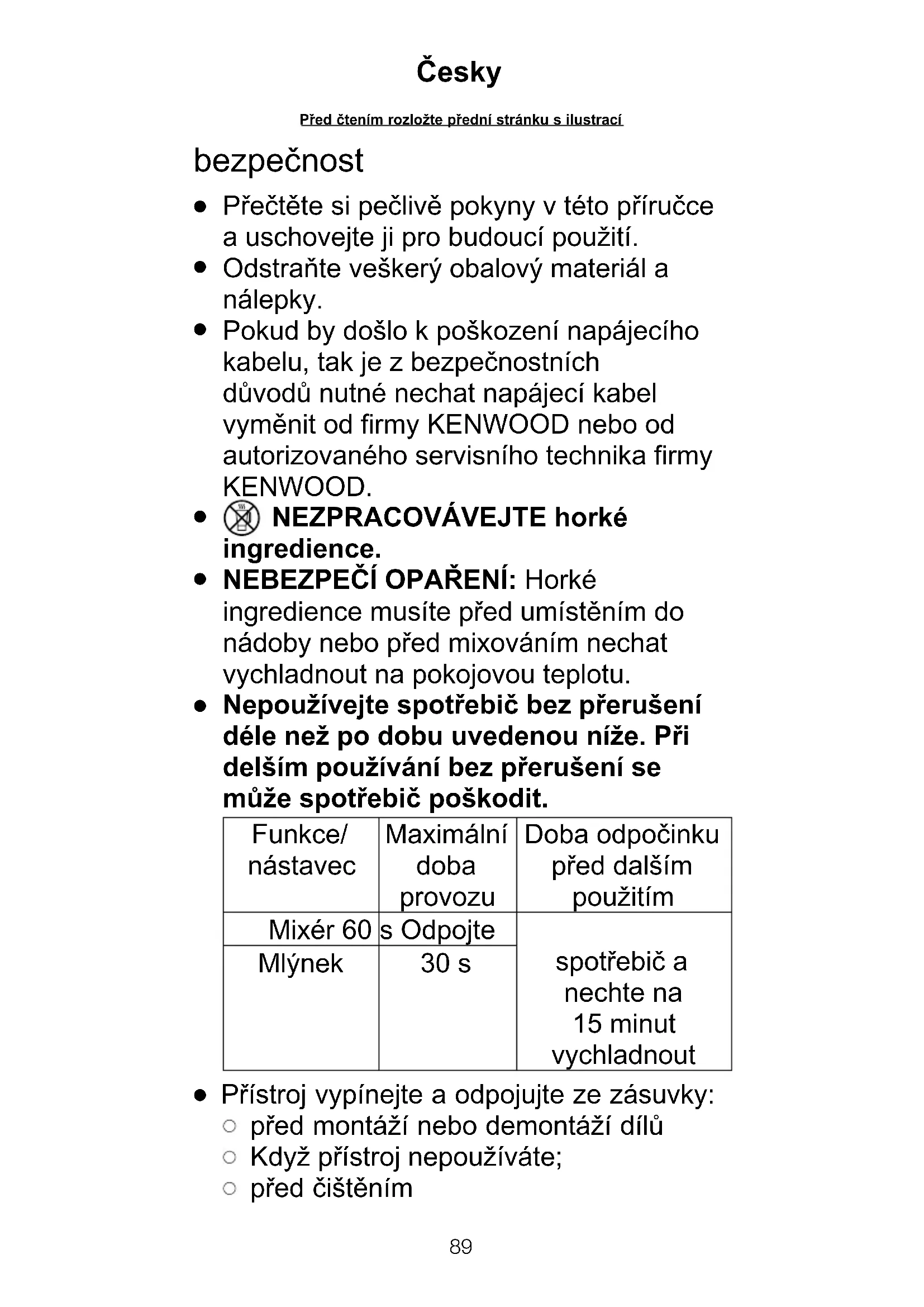 P¡ístroj vypínejte a odpojujte ze zásuvky: p¡ed montá¥í nebo demontá¥í dílº Když přístroj nepoužíváte; p¡ed ïi•têním P¡ed ïtením rozlo¥te p¡ední stránku s ilustrací Ïesky89 90
