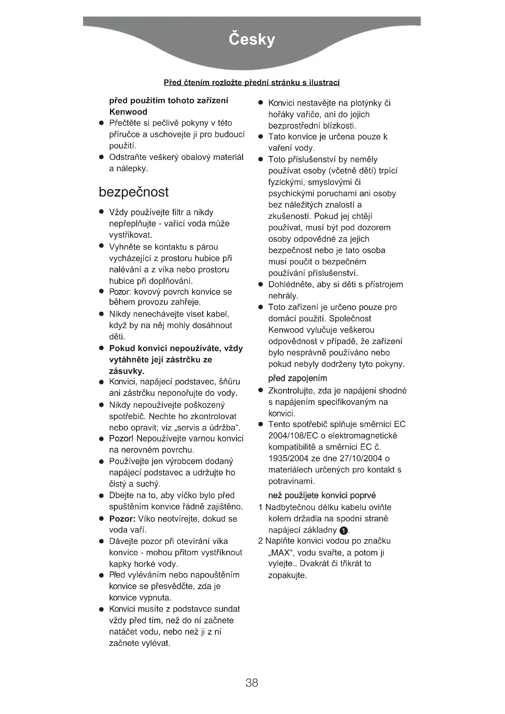 Tento spotřebič splňuje směrnici EC 2004/108/EC o elektromagnetické kompatibilitě a směrnici EC č. 1935/2004 ze dne 27/10/2004 o materiálech určených pro kontakt s potravinami. nneežž ppoouužžiijjeettee kkoonnvviiccii ppoopprrvvéé 1 Nadbytečnou délku kabelu oviňte kolem držadla na spodní straně napájecí základny . 2 Naplňte konvici vodou po značku „MAX“, vodu svařte, a potom ji vylejte.. Dvakrát ïi t¡ikrát to zopakujte.