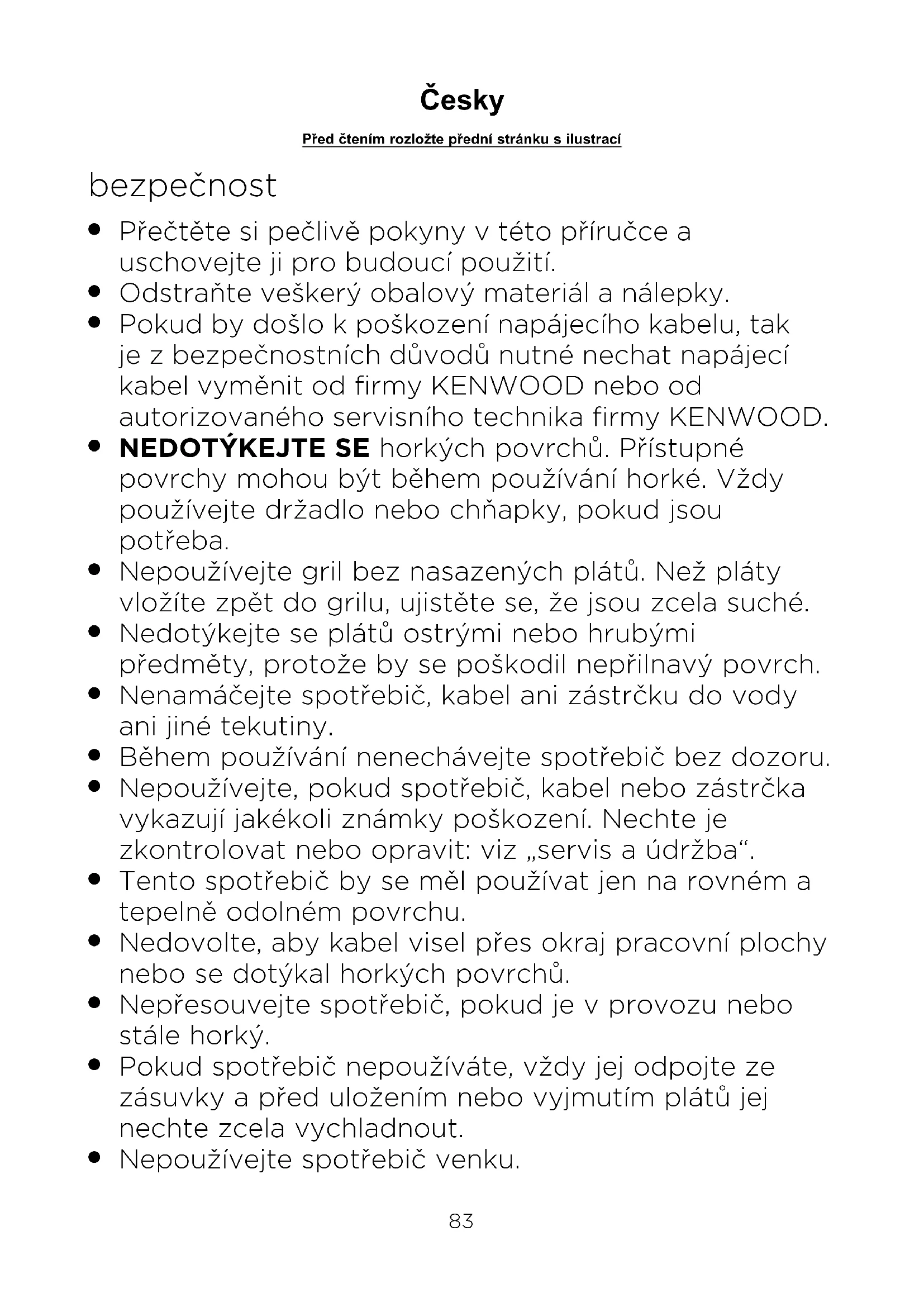 Nepoužívejte spotřebič venku. Ïesky P¡ed ïtením rozlo¥te p¡ední stránku s ilustrací83 84