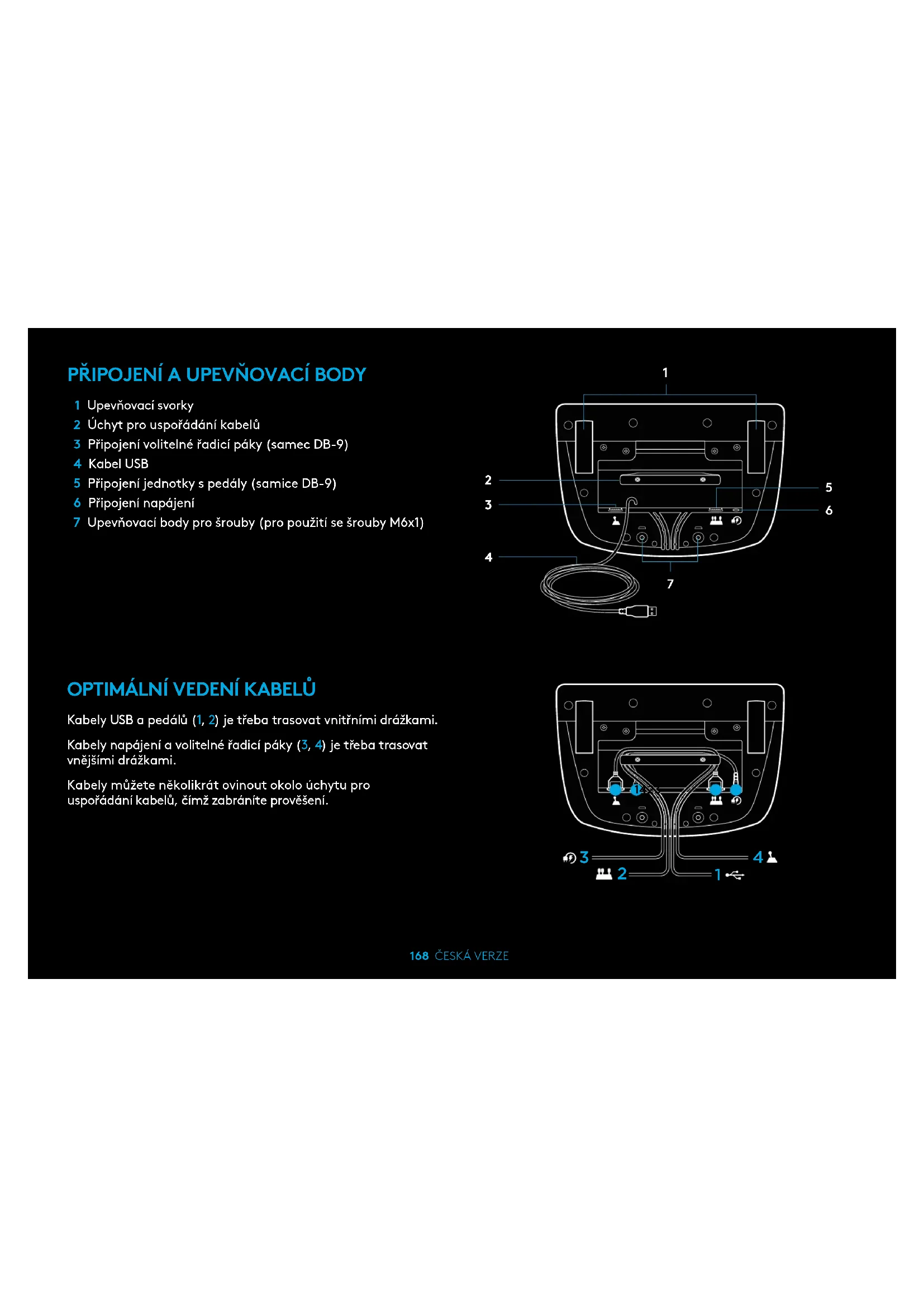 1 Upevňovací svorky 2 Úchyt pro uspořádání kabelů 3 Připojení volitelné řadicí páky (samec DB-9) 4 Kabel USB 5 Připojení jednotky spedály (samice DB-9) 6 Připojení napájení 7 Upevňovací body pro šrouby (pro použití se šrouby M6x1)