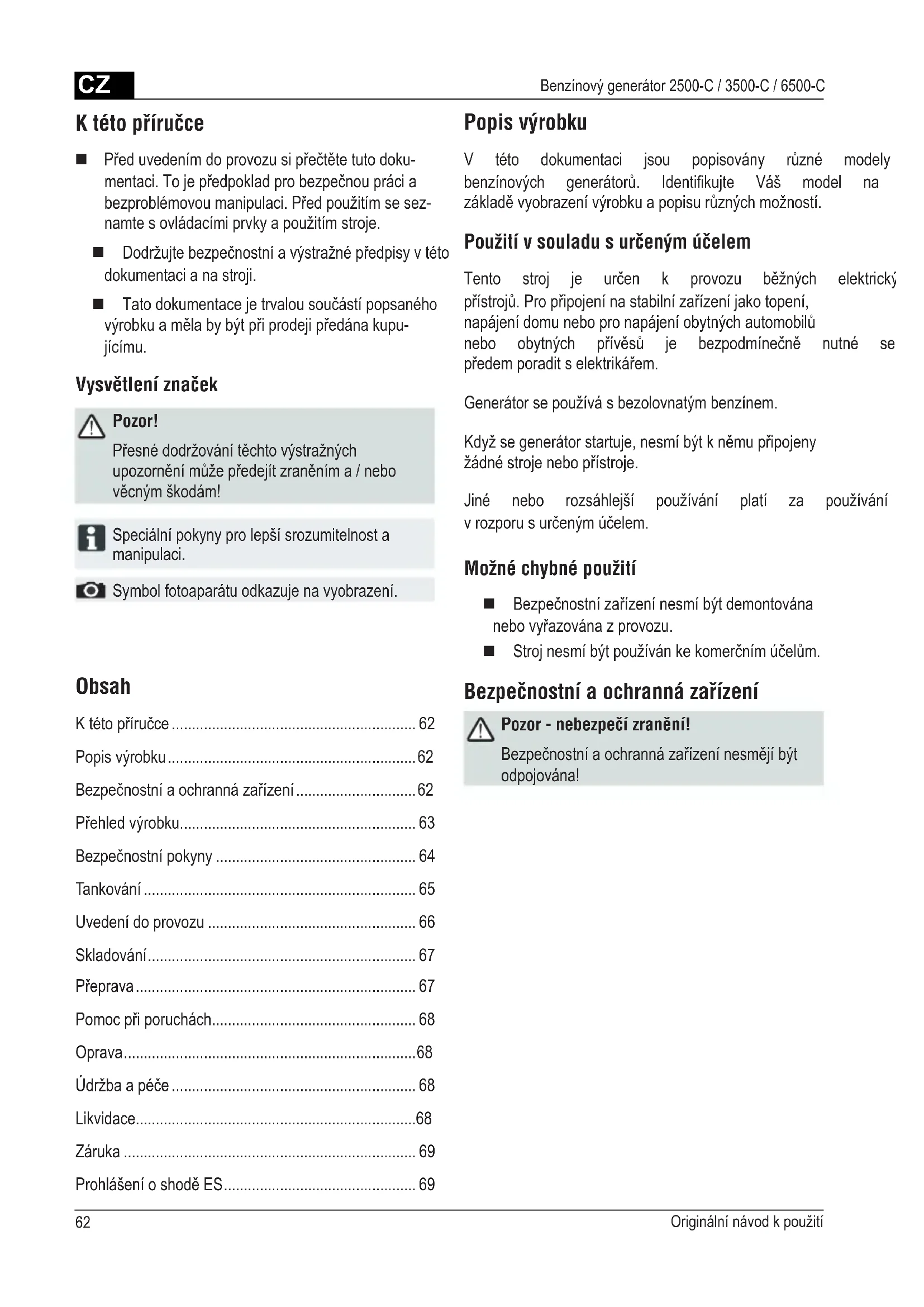 - ProhlášeníoshoděES K této příručce Předuvedenímdoprovozusipřečtětetutodoku- mentaci.Tojepředpokladprobezpečnouprácia bezproblémovoumanipulaci.Předpoužitímsesez- namtesovládacímiprvkyapoužitímstroje. Dodržujtebezpečnostníavýstražnépředpisyvtéto dokumentaci a na stroji. Tatodokumentacejetrvalousoučástípopsaného výrobkuamělabybýtpřiprodejipředánakupu- jícímu. Vysvětlení značek Pozor! Přesnédodržovánítěchtovýstražných upozorněnímůžepředejítzraněníma/nebo věcnýmškodám! Speciálnípokynyprolepšísrozumitelnosta manipulaci. Symbolfotoaparátuodkazujenavyobrazení. Popis výrobku V této dokumentaci jsou popisovány různé modely benzínových generátorů. Identikujte Váš model na základěvyobrazenívýrobkuapopisurůznýchmožností. Použití v souladu s určeným účelem Tento stroj je určen k provozu běžných elektrických přístrojů.Propřipojenínastabilnízařízeníjakotopení, napájenídomunebopronapájeníobytnýchautomobilů nebo obytných přívěsů je bezpodmínečně nutné se předemporaditselektrikářem. Generátorsepoužívásbezolovnatýmbenzínem. Kdyžsegenerátorstartuje,nesmíbýtkněmupřipojeny žádnéstrojenebopřístroje. Jiné nebo rozsáhlejší používání platí za používání vrozporusurčenýmúčelem. Možné chybné použití Bezpečnostnízařízenínesmíbýtdemontována nebovyřazovánazprovozu. Strojnesmíbýtpoužívánkekomerčnímúčelům. Bezpečnostní a ochranná zařízení Pozor - nebezpečí zranění! Bezpečnostníaochrannázařízenínesmějíbýt odpojována!63441152_e p. 69