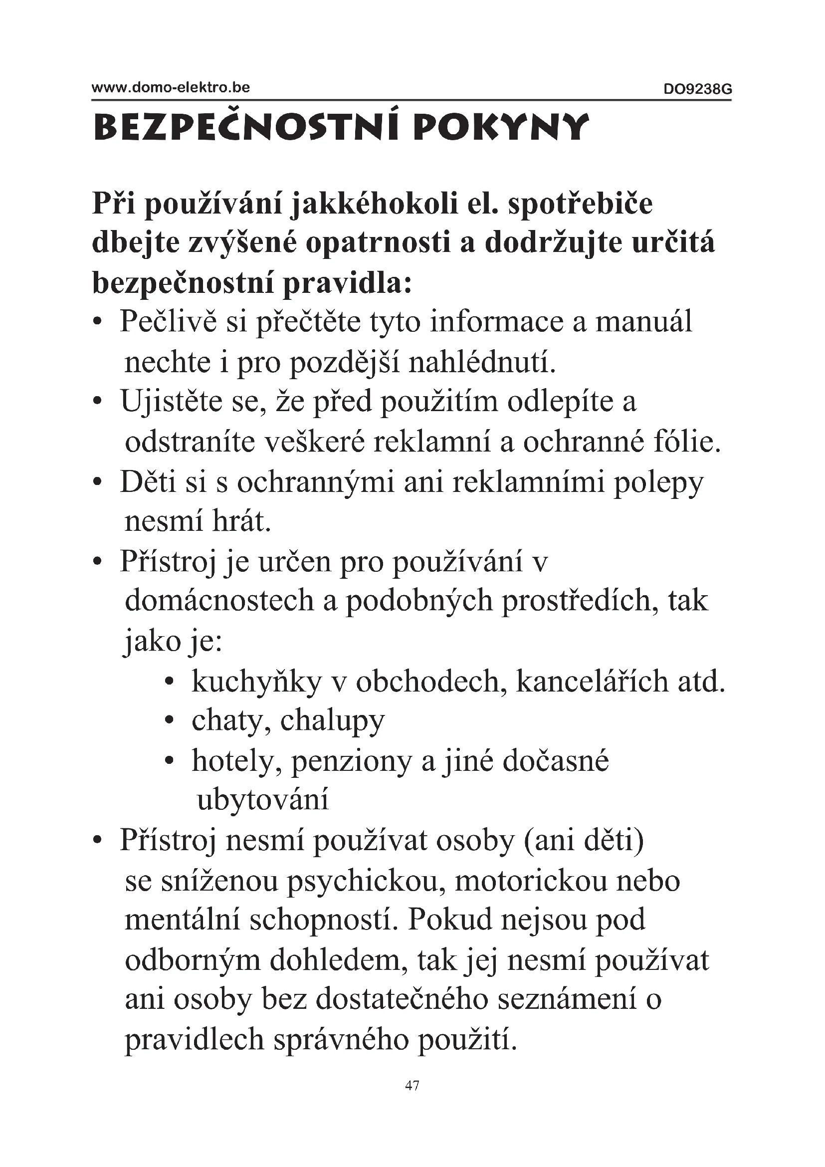 - Přístroj nesmí používat osoby (ani děti) se sníženou psychickou, motorickou nebo mentální schopností. Pokud nejsou pod odborným dohledem, tak jej nesmí používat ani osoby bez dostatečného seznámení o pravidlech správného použití.DO9238G