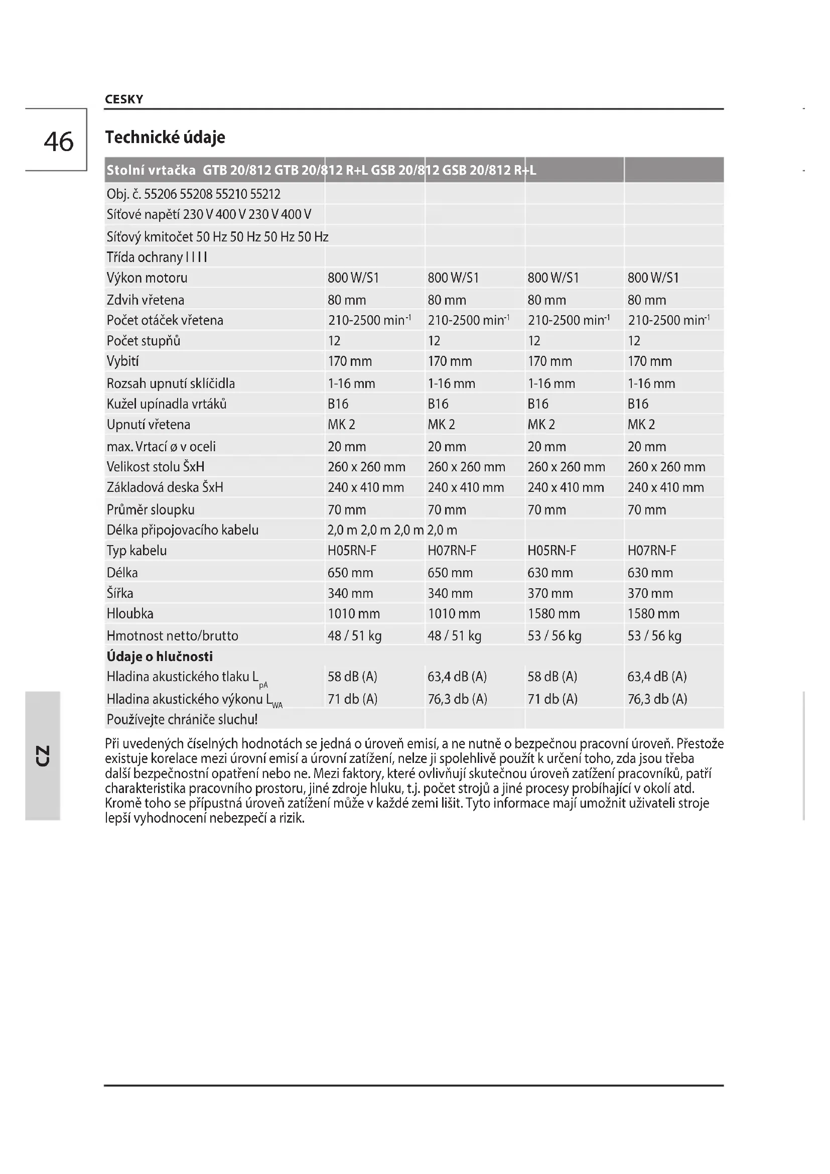 CESKY Technické údaje Stolní vrtačka GTB 20/812 GTB 20/812 R+L GSB 20/812 GSB 20/812 R+L Obj. č. 55206 55208 55210 55212 Síťové napětí 230 V 400 V 230 V 400 V Síťový kmitočet 50 Hz 50 Hz 50 Hz 50 Hz Třída ochrany I I I I Výkon motoru 800 W/S1 800 W/S1 800 W/S1 800 W/S1 Zdvih vřetena 80 mm 80 mm 80 mm 80 mm Počet otáček vřetena 210-2500 min