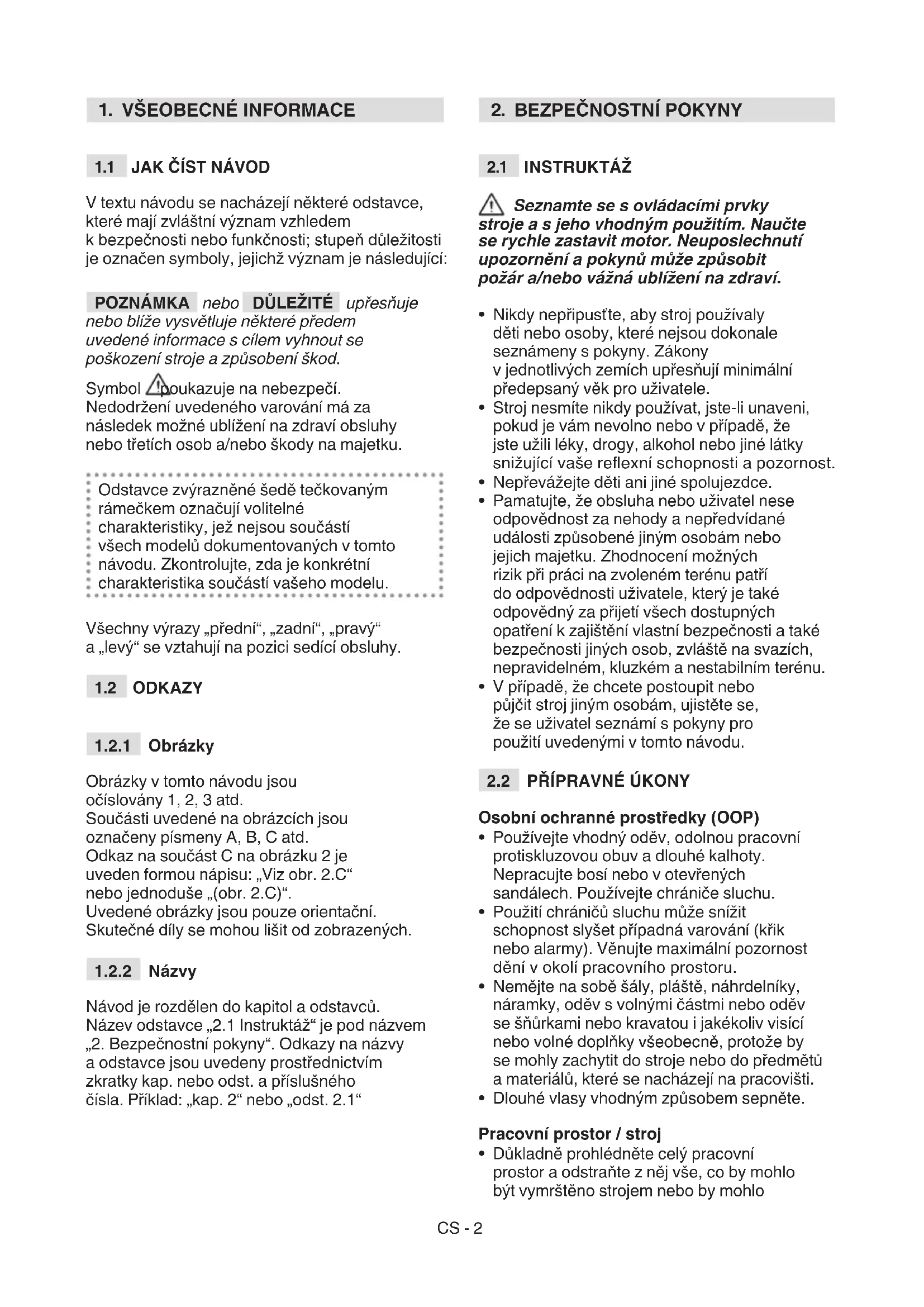 V textu návodu se nacházejí některé odstavce, které mají zvláštní význam vzhledem k bezpečnosti nebo funkčnosti; stupeň důležitosti je označen symboly, jejichž význam je následující: POZNÁMKA nebo DŮLEŽITÉ upřesňuje nebo blíže vysvětluje některé předem uvedené informace s cílem vyhnout se poškození stroje a způsobení škod. Symbol poukazuje na nebezpečí. Nedodržení uvedeného varování má za následek možné ublížení na zdraví obsluhy nebo třetích osob a/nebo škody na majetku. Odstavce zvýrazněné šedě tečkovaným rámečkem označují volitelné charakteristiky, jež nejsou součástí všech modelů dokumentovaných v tomto návodu. Zkontrolujte, zda je konkrétní charakteristika součástí vašeho modelu. Všechny výrazy „přední“, „zadní“, „pravý“ a „levý“ se vztahují na pozici sedící obsluhy.
