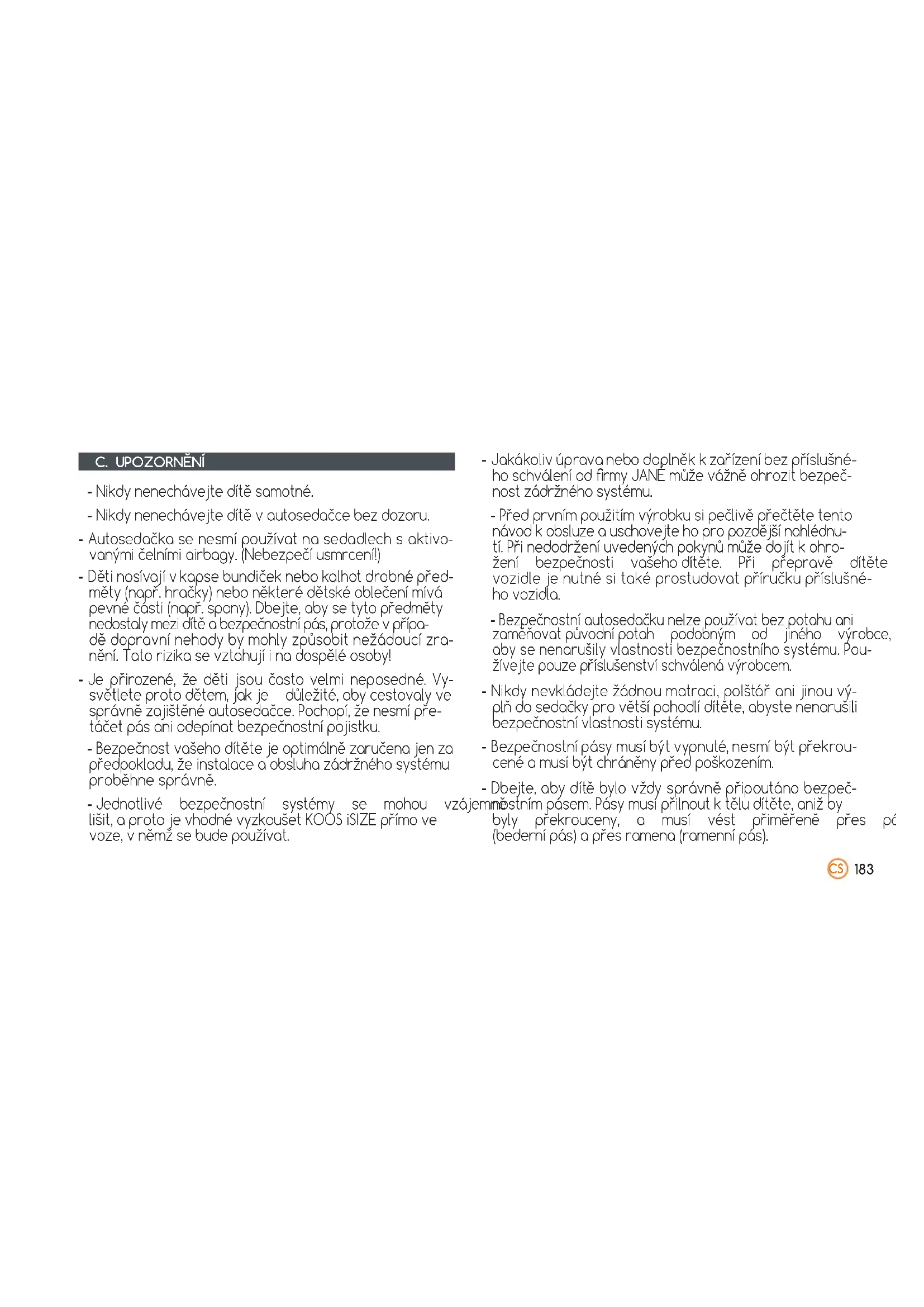 - Neprovádějtevzádržnémsystémužádnézměny,abyste neohrozilibezpečnostvašehodítěte. - Zádržnýsystémnesmíbýtpoškozenanizablokovánpo- hyblivýmičástmiuvnitřvozidlanebodveřmi. - Částiautosedačky,kterénemajípotah,chraňtepředpří- mýmslunečnímsvětlem,abystezabránilistykupokožky dítětesrozpálenýmidíly. - Jevelmidůležiténepoužívatvýrobkyzdrhéruky,proto- žeJANÉmůžegarantovatnaprostoubezpečnostpouze uvýrobkůpoužívanýchprvnímkupujícím. - Prozdravývývojvašehodítětepřidlouhýchcestáchdopo- ručujeme nepřehánět používání autosedačky, nechte jej častoprotáhnoutvleževkošíkunebovpřepravnímlůžku. - Nedodržení pokynů ke správnému použití zádržného systémumůžepředstavovatrizikoohroženíbezpečnosti dítěte.Seznamtesetakéspravidlysilničníhoprovozuv zemích,ponichžcestujetesvýmvozem. - Vysvětleteosobám,kterévásdoprovázejí,jakvyjmout dítězautosedačkyvpřípadědopravnínehody. - Zajistěte zavazadla a předměty uvnitř vozidla, abyste zabrániliporaněnívpřípaděautonehody. - Mělibystemítvždyporucenávodkobsluze. - Není dovoleno používatjiná příslušenství ani náhradní díly.Nedodrženímtohotozávazkuztrácíkupujícínároky vyplývající ze záruky. Výjimkutvoří pouze příslušenství schválenévýrobcemJané. - Pokudbylaautosedačkavystavenasilnémupnutípřido- pravnínehodě,vyměňtejizanovou,nebozašletevýrob- cisezprávouoautonehodě,abyověřiljejíspolehlivost. - Neupevňujte autosedačku na sedadlech umístěných příčněneboprotisměrujízdy,jetovelminebezpečné. - Upozornění: Seznamte se s pravidly silničního provozu vzemích,pokterýchvesvémvozidlecestujete.Mohou obsahovatomezení připoužívánídětskéhozádržného systému. - AutosedačkaKOOS iSIZE musí být náležitěpřipevněna bezpečnostními pásy nebo prostřednictvím základu ISOFIX,ikdyžsenepoužívá,protoževpřípaděnehodyby semohlauvolnitazpůsobitzraněnípasažérůmvozidla. - Jevhodnápouzetehdy,je-livozidlovybavenohomolo- govaným3-bodovýmupínacímpásemvsouladuspřed- pisemUN/ECE16čirovnocennýchpředpisů. - Proautosedačkypoužívanévkombinacispodvozkemje třebazdůraznit,žetatokombinacenenahrazujekolébku nebopostel.Pokuddítěpotřebujespát,mělibystehodát dohlubokéhokočárku,kolébkynebopostele.185
