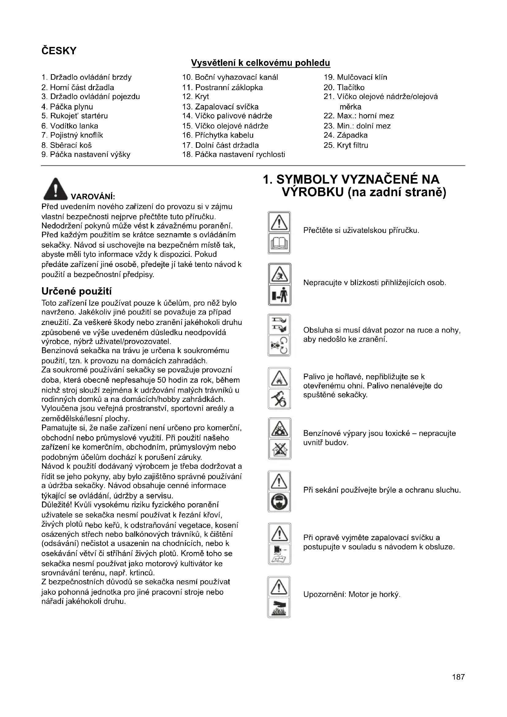 Len pre krajiny Európy Vyhlásenie o zhode v rámci ES je do tohto návodu na používanie zahrnuté ako Príloha A. Motor pracuje nepravidelne. Zapaľovacia sviečka je chybná. Nainštalujte novú sviečku so správne nastaveným iskrišt’om: pozrite si NÁVOD NA OBSLUHU MOTORA. Iskrište zapaľovacej sviečky nie je správne nastavené. Nastavte iskrište tak, aby štrbina medzi elektródami bola 0,7 až 0,8 mm. Prvok vzduchového čističa je špinavý. Prvok vzduchového čističa vyčistite: pozrite si NÁVOD NA OBSLUHU MOTORA. Voľnobeh motora je slabý. Prvok vzduchového čističa je špinavý. Prvok vzduchového čističa vyčistite: pozrite si NÁVOD NA OBSLUHU MOTORA. Vetracie štrbiny na plášti motora sú zablokované. Zo štrbín odstráňte úlomky. Chladiace rebrá a vzduchové prechody pod skriňou ventilátora motora sú zablokované. Z chladiacich rebier a vzduchových prechodov odstráňte úlomky. Motor pri vysokých otáčkach vynecháva. Štrbina medzi elektródami zapaľovacej sviečky je veľmi malá. Nastavte iskrište tak, aby štrbina medzi elektródami bola 0,7 až 0,8 mm. Motor sa prehrieva. Tok chladiaceho vzduchu je obmedzený. Odstráňte všetky úlomky zo štrbín v plášti, skrine ventilátora a vzduchových prechodov. Nesprávna zapaľovacia sviečka. Nainštalujte pôvodnú zapaľovaciu sviečku a chladiace rebrá na motore. Kosačka neštandardne vibruje. Rezná zostava je uvoľnená. Ut iahnite čepeľ. Rezná zostava je nevyvážená. Čepeľ vyvážte. PROBLÉM MOŽNÁ PRÍČINA NÁPRAVA187 ČESKY Vysvětlení k celkovému pohledu VAROVÁNÍ: Před uvedením nového zařízení do provozu si v zájmu vlastní bezpečnosti nejprve přečtěte tuto příručku. Nedodržení pokynů může vést k závažnému poranění. Před každým použitím se krátce seznamte s ovládáním sekačky. Návod si uschovejte na bezpečném místě tak, abyste měli tyto informace vždy k dispozici. Pokud předáte zařízení jiné osobě, předejte jí také tento návod k použití a bezpečnostní předpisy. Určené použití Toto zařízení lze používat pouze k účelům, pro něž bylo navrženo. Jakékoliv jiné použití se považuje za případ zneužití. Za veškeré škody nebo zranění jakéhokoli druhu způsobené ve výše uvedeném důsledku neodpovídá výrobce, nýbrž uživatel/provozovatel. Benzinová sekačka na trávu je určena k soukromému použití, tzn. k provozu na domácích zahradách. Za soukromé používání sekačky se považuje provozní doba, která obecně nepřesahuje 50 hodin za rok, během nichž stroj slouží zejména k udržování malých trávníků u rodinných domků a na domácích/hobby zahrádkách. Vyloučena jsou veřejná prostranství, sportovní areály a zemědělské/lesní plochy. Pamatujte si, že naše zařízení není určeno pro komerční, obchodní nebo průmyslové využití. Při použití našeho zařízení ke komerčním, obchodním, průmyslovým nebo podobným účelům dochází k porušení záruky. Návod k použití dodávaný výrobcem je třeba dodržovat a řídit se jeho pokyny, aby bylo zajištěno správné používání a údržba sekačky. Návod obsahuje cenné informace týkající se ovládání, údržby a servisu. Důležité! Kvůli vysokému riziku fyzického poranění uživatele se sekačka nesmí používat k řezání křoví, živých plotů n ebo ke řů, k odstraňování vegetace, kosení osázených střech nebo balkónových trávníků, k čištění (odsávání) nečistot a usazenin na chodnících, nebo k osekávání větví či stříhání živých plotů. Kromě toho se sekačka nesmí používat jako motorový kultivátor ke srovnávání terénu, např. krtinců. Z bezpečnostních důvodů se sekačka nesmí používat jako pohonná jednotka pro jiné pracovní stroje nebo nářadí jakéhokoli druhu.