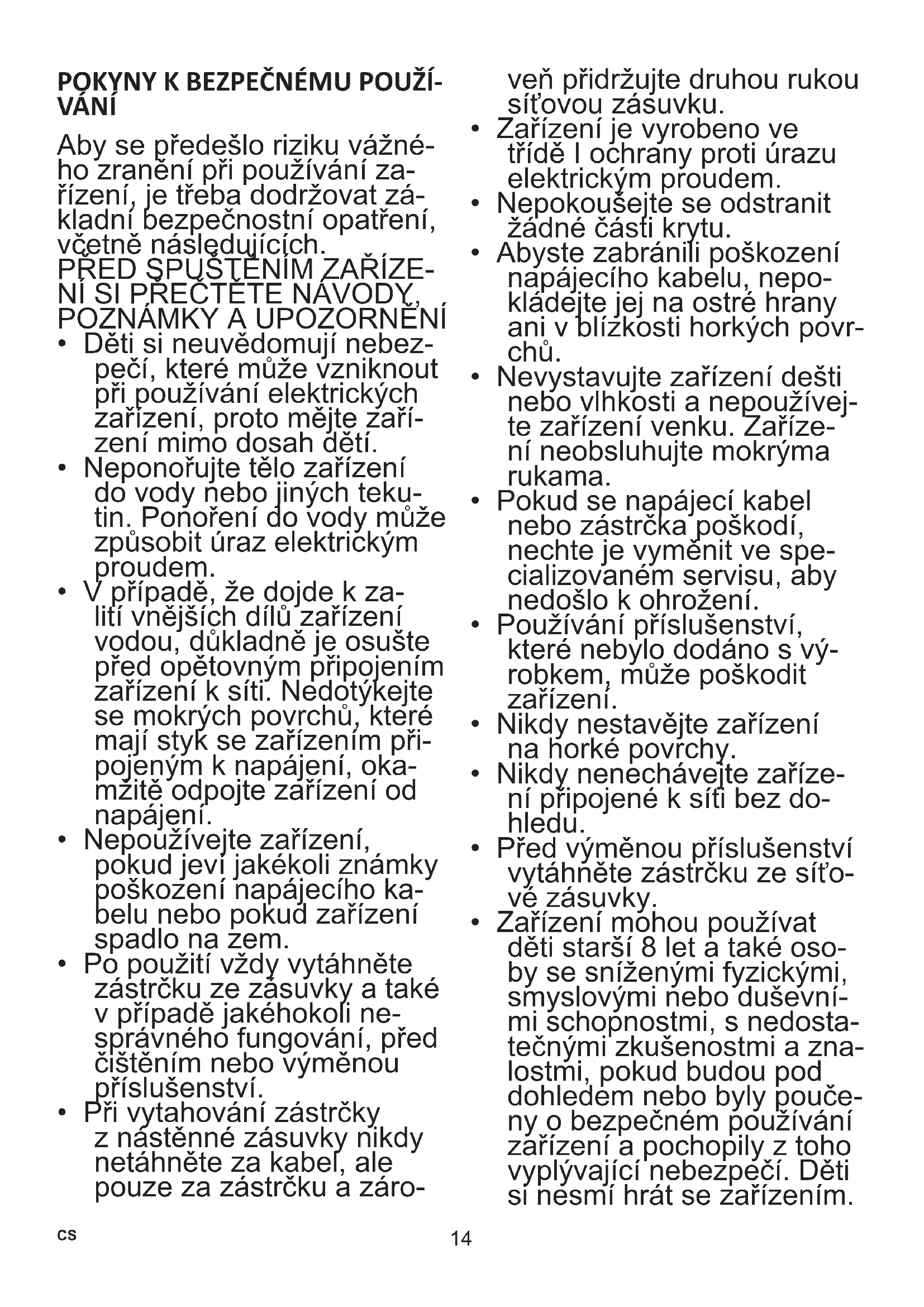 - Zařízení mohou používat děti starší 8 let a také oso- by se sníženými fyzickými, smyslovými nebo duševní- mi schopnostmi, s nedosta- tečnými zkušenostmi a zna- lostmi, pokud budou pod dohledem nebo byly pouče- ny o bezpečném používání zařízení a pochopily z toho vyplývající nebezpečí. Děti si nesmí hrát se zařízením. CS15 Čištění a údržbu zařízení nesmí provádět děti, ledaže jsou starší 8 let a jsou pod dohledem.